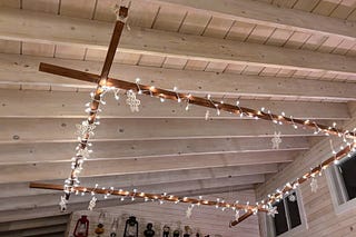Since we won't be quilting for a while, we wrapped our quilt frame in twinkle lights and decorated it with paper snowflakes. The result is magical.