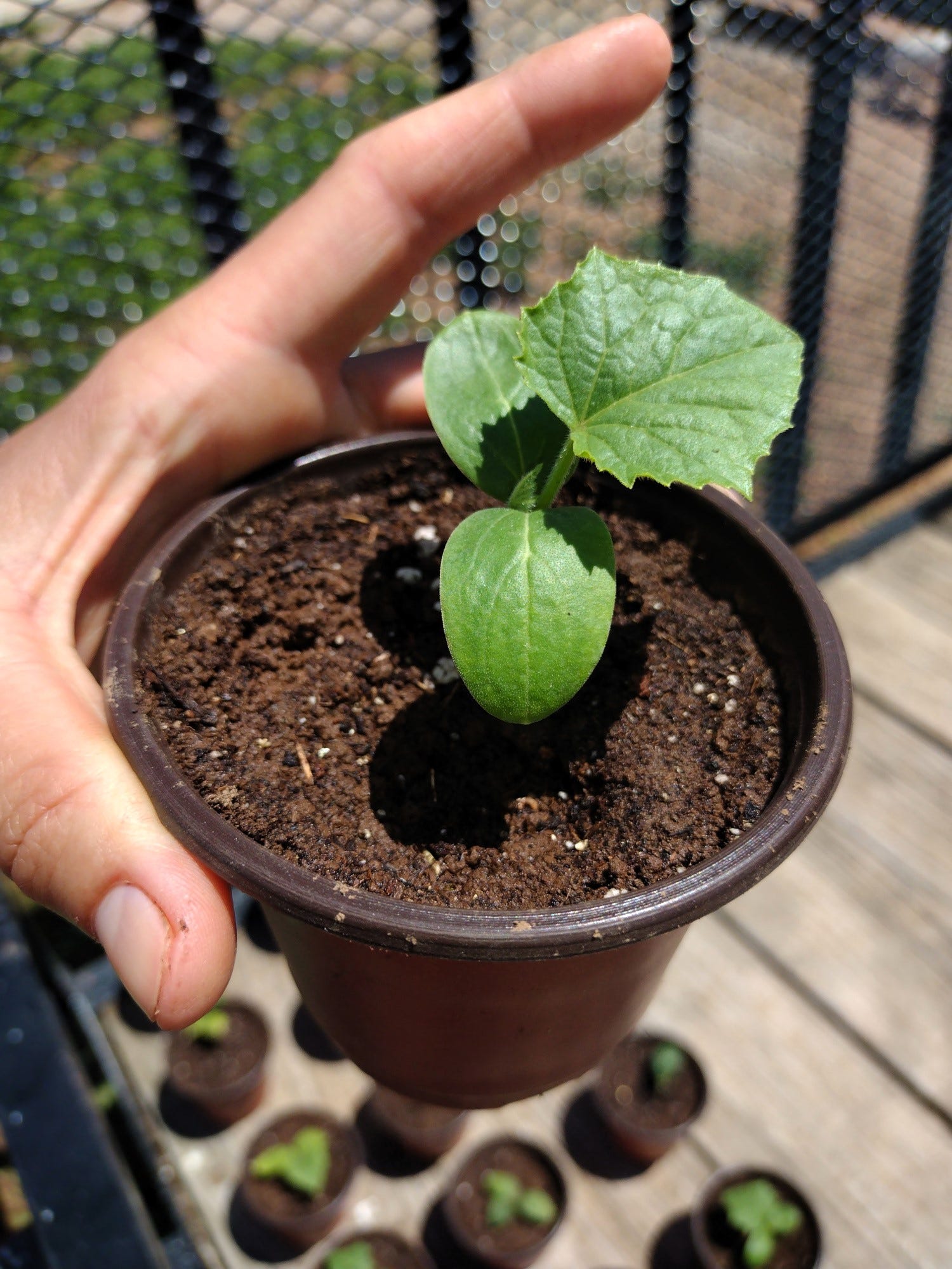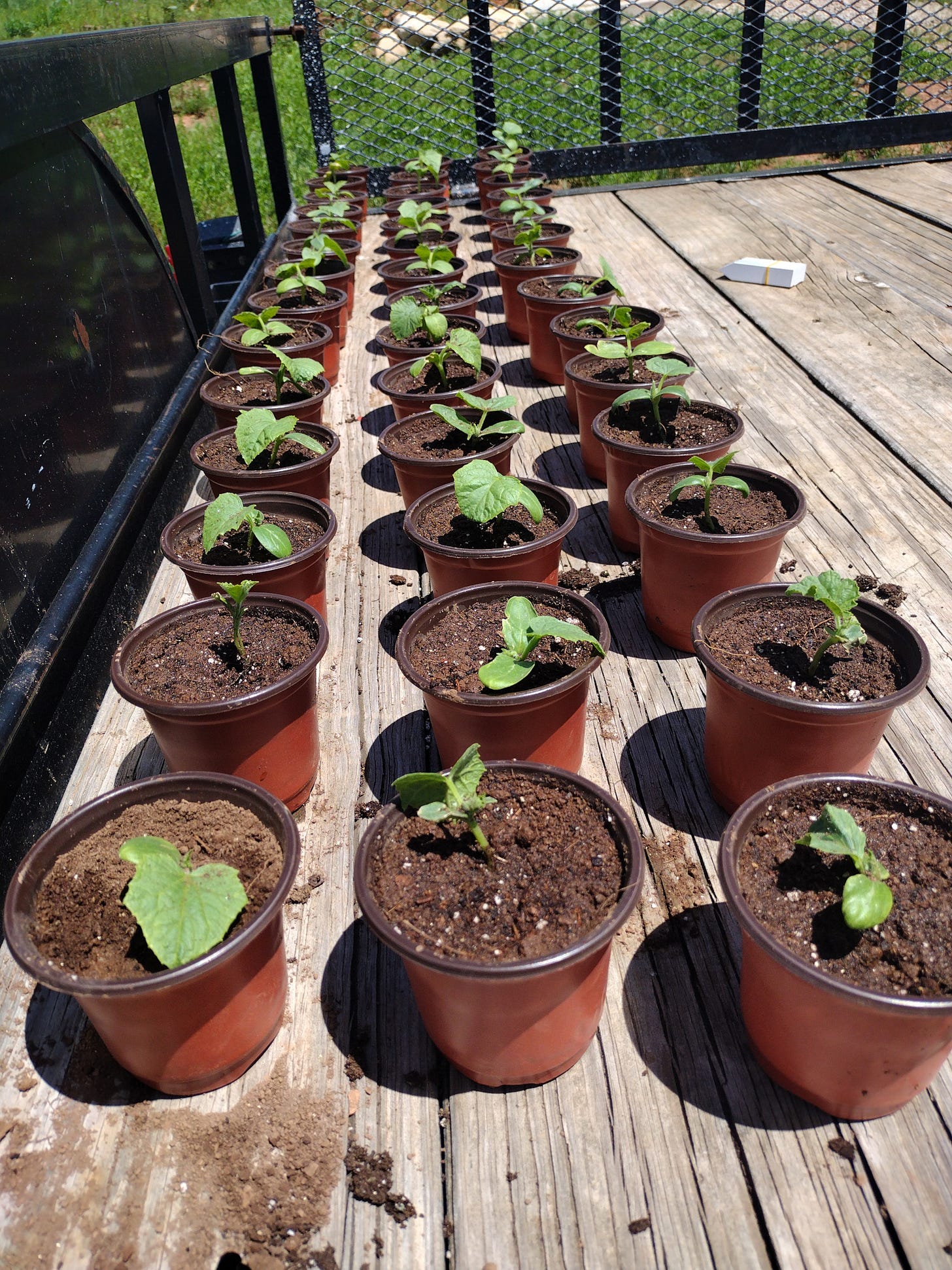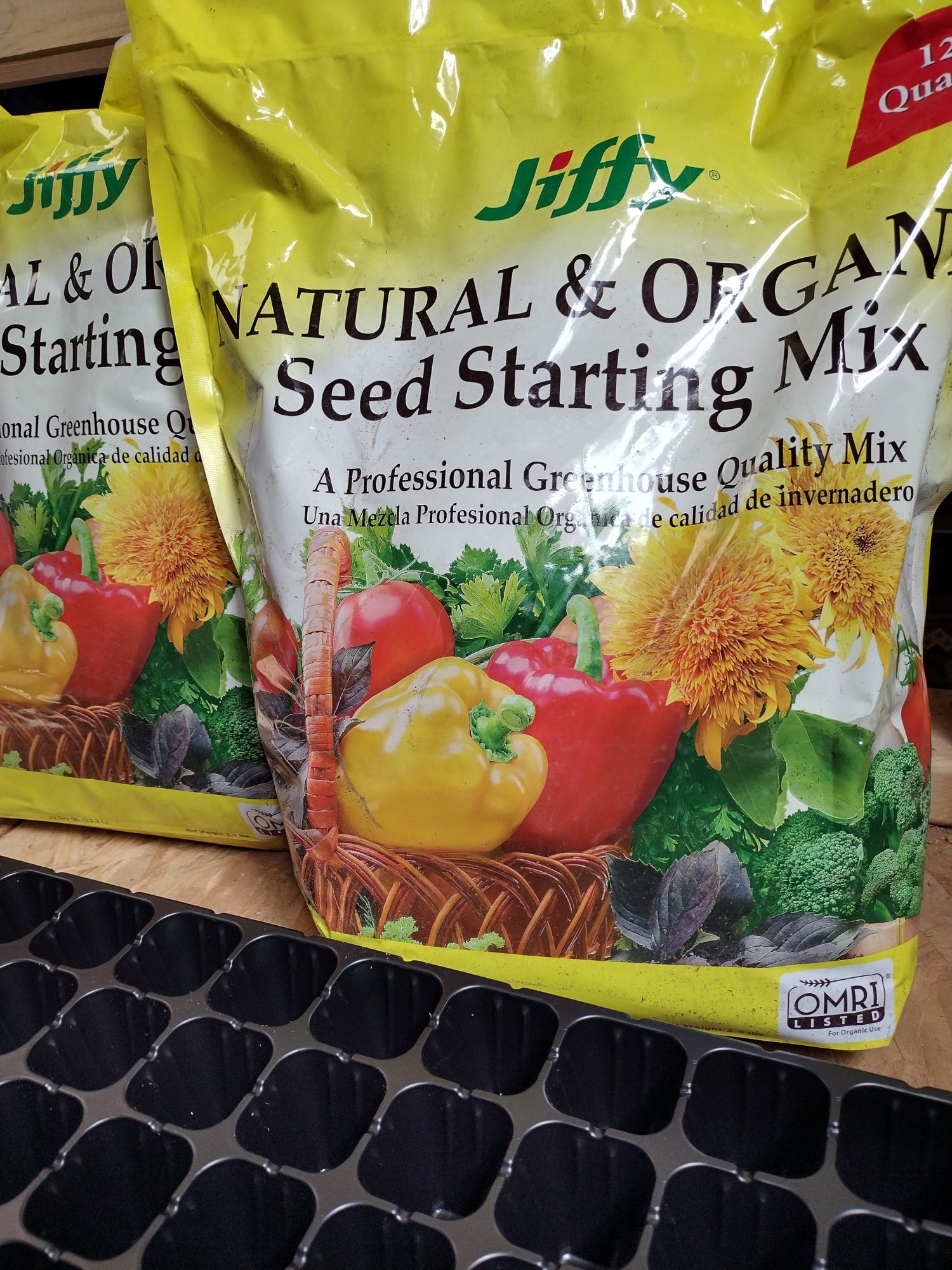 Even though it was almost time to plant our happy little sprouts in the garden, we needed to transplant some of the tomato and cucumber seedlings a couple weeks ago, as they were outgrowing their cells. At the same time, we had some new plants from Mother's Day, as well as some older potted plants that were sorely in need of larger pots. We decided it was time to get more [potting soil.