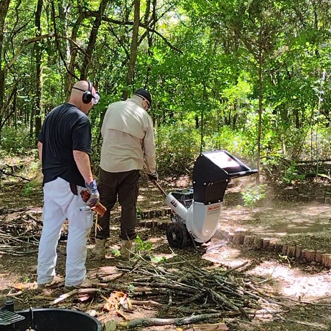 The last step for our tent pads was filling the areas with wood chips. We planned to purchase chips, but after figuring up the cost for purchase and delivery, we decided to purchase a Brush Master 5 in. chipper/shredder from Home Depot. We got a great deal, and so far we love it. We created our chips from all the brush we had previously cleared from the area. We also chipped up some old cedar we found around our property to help deter bugs. The whole process took a couple of days, but it felt great getting rid of all our brush piles.