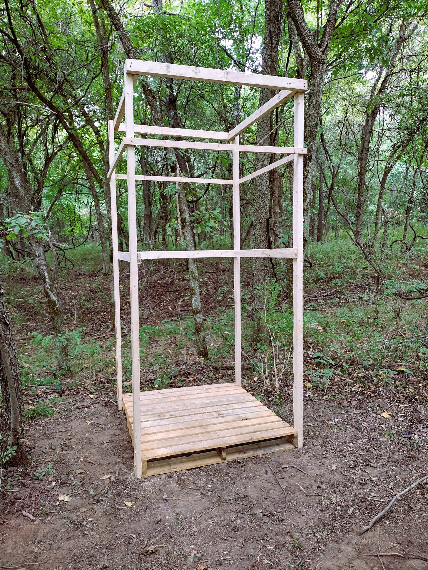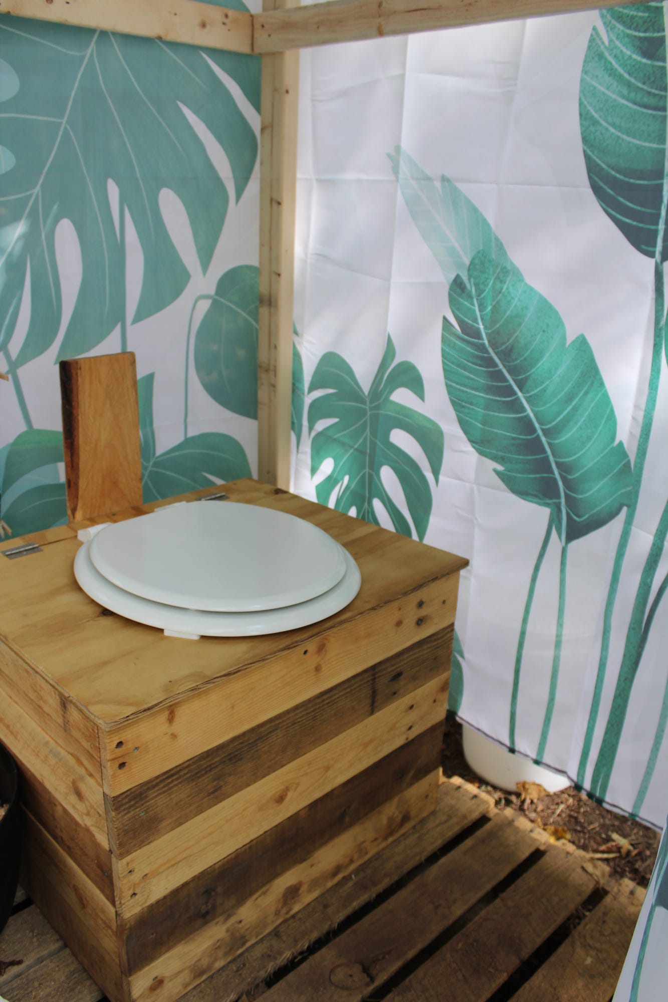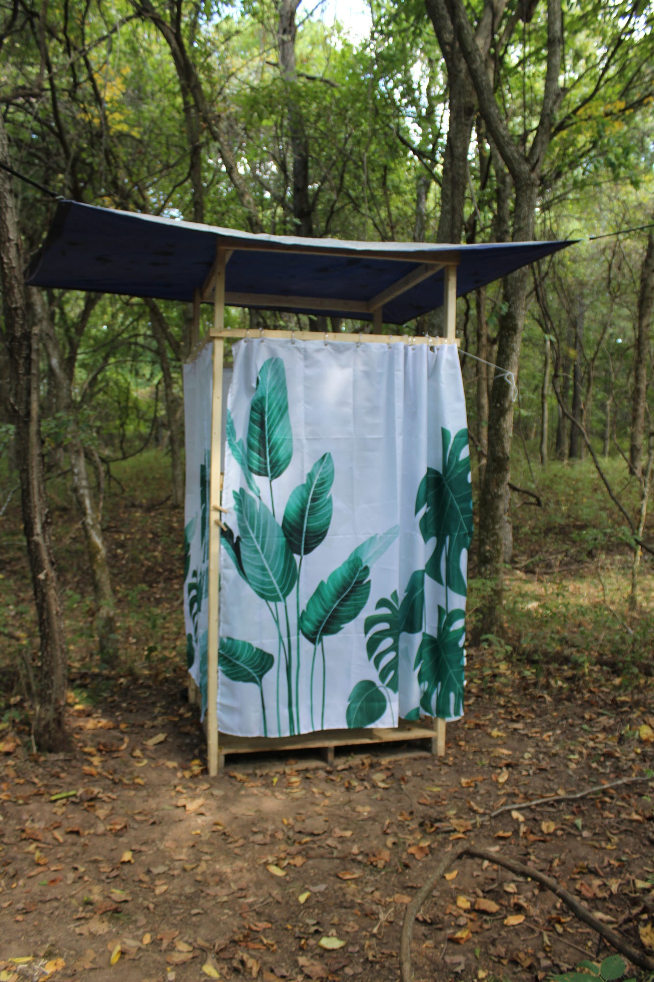 We also did prep for camp sanitation: toilet, shower, and laundry area. We have our camp toilet set back from the rest of the campsite. We used a pallet as a base and built a frame. Inside, we built a pallet wood toilet box. It works with 5-gallon buckets, which makes waste removal and disposal easy. It's quite the upgrade from the plastic seat and bucket system that we used to have from Walmart. We sewed three shower curtains together and used shower curtain loops to make an enclosure.