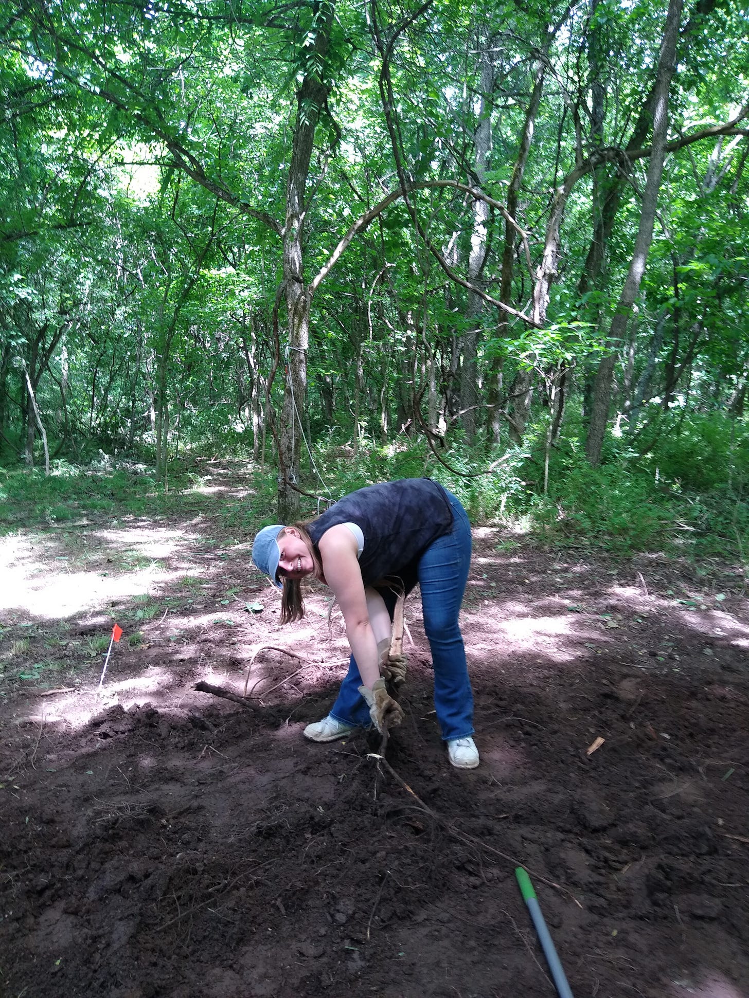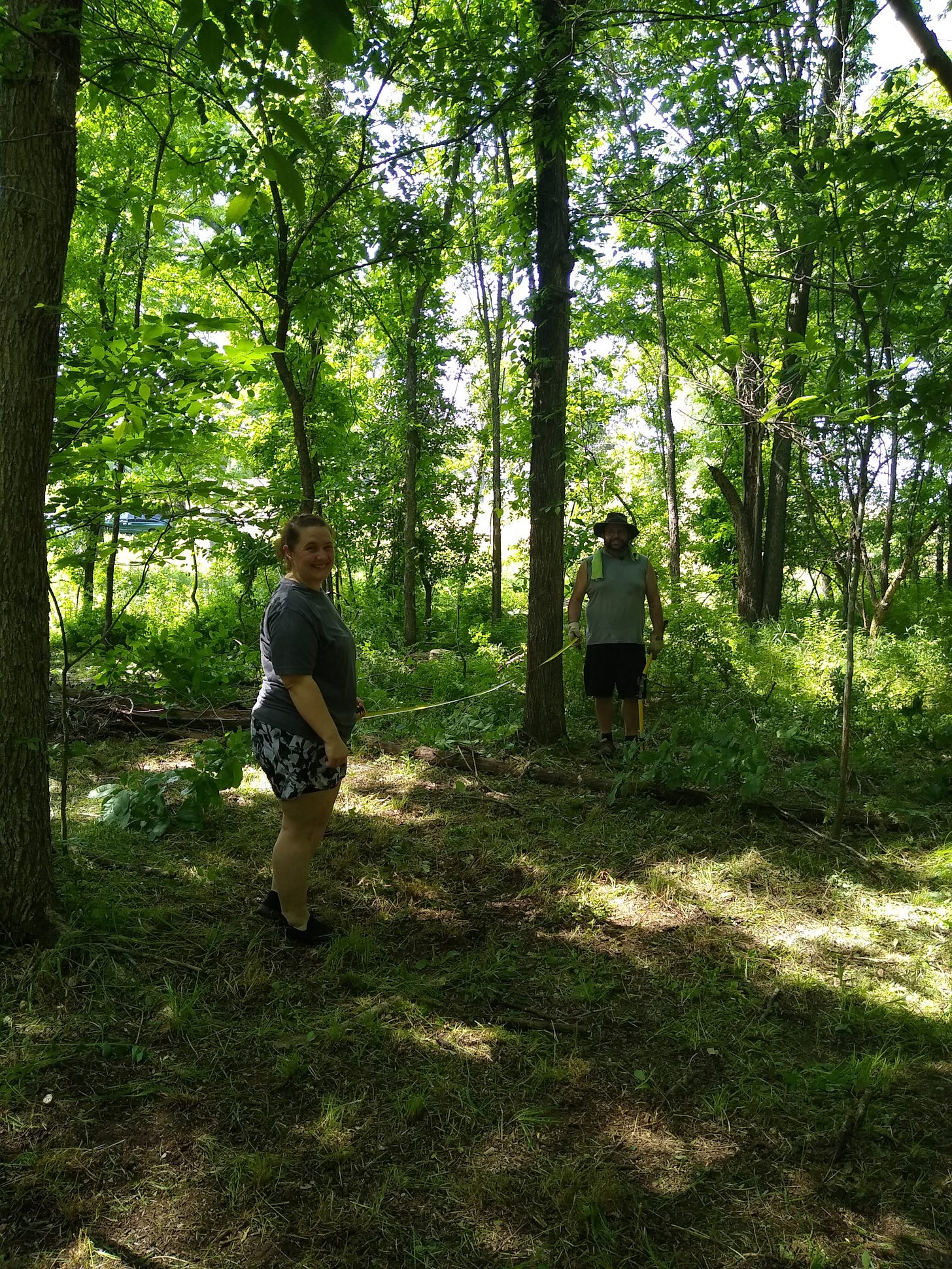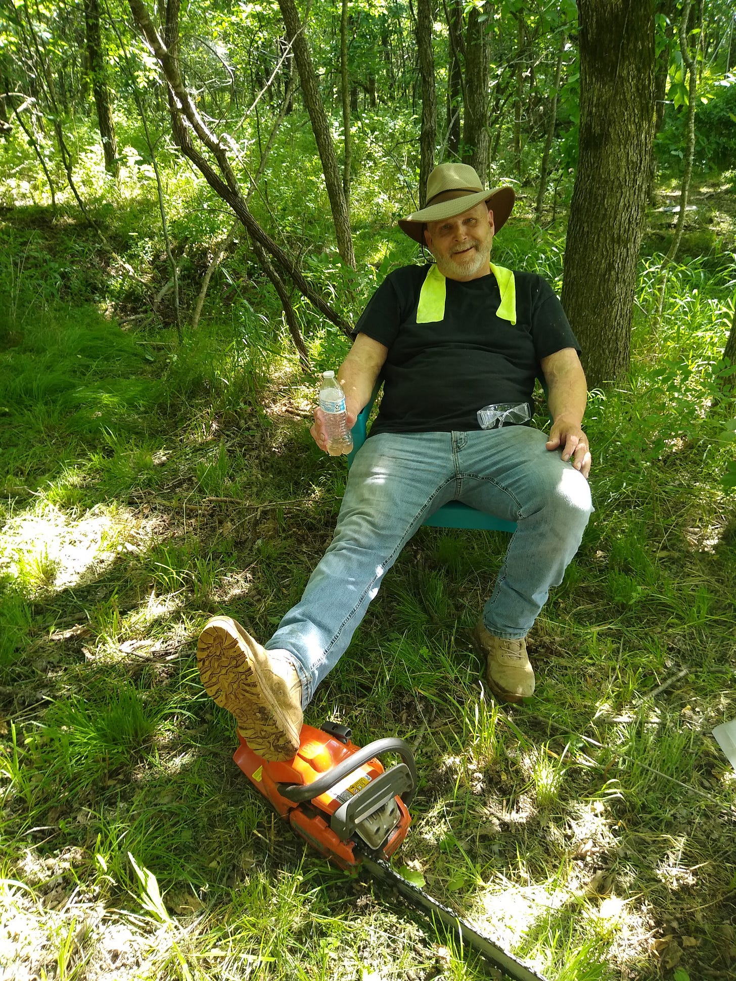 We got to work clearing the area using rakes, loppers, shovels, a mattock, an axe, and a gas-powered string trimmer. Our dad also brought his chainsaw to remove trees and larger bushes. We cleared an area large enough for two large tents, a storage tent, and an eating/living area.