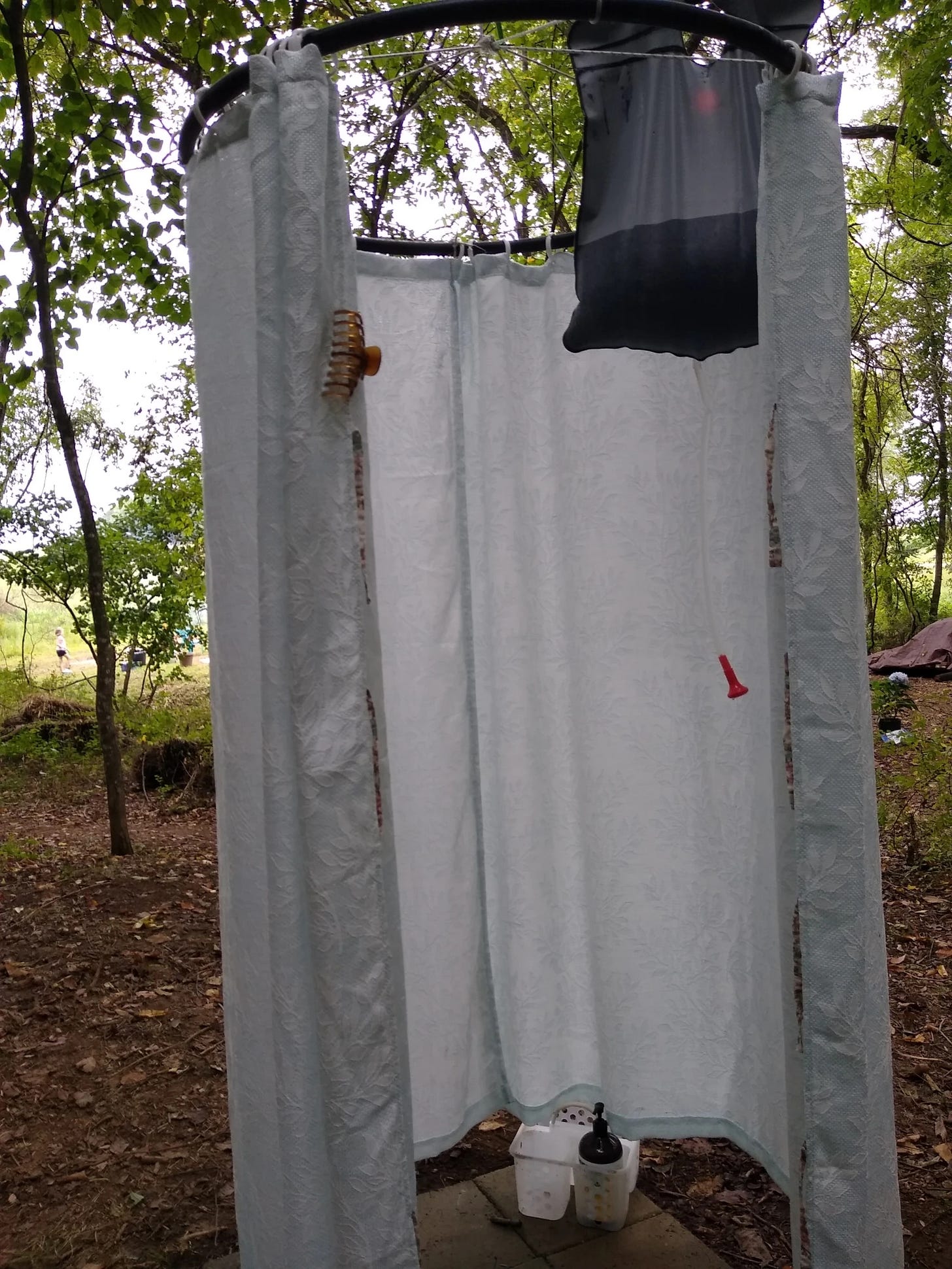 We made a shower out of an old Canyon hula hoop and shower curtains. We hung a solar shower inside with a pulley. It worked, but our shower curtains didn't hold up to washing as often as they needed, so they already have to be replaced. For laundry, we built a clothes line on the other side of the creek in the sunshine. We purchased some large plastic tubs from Menards (not pictured) for washing laundry in.