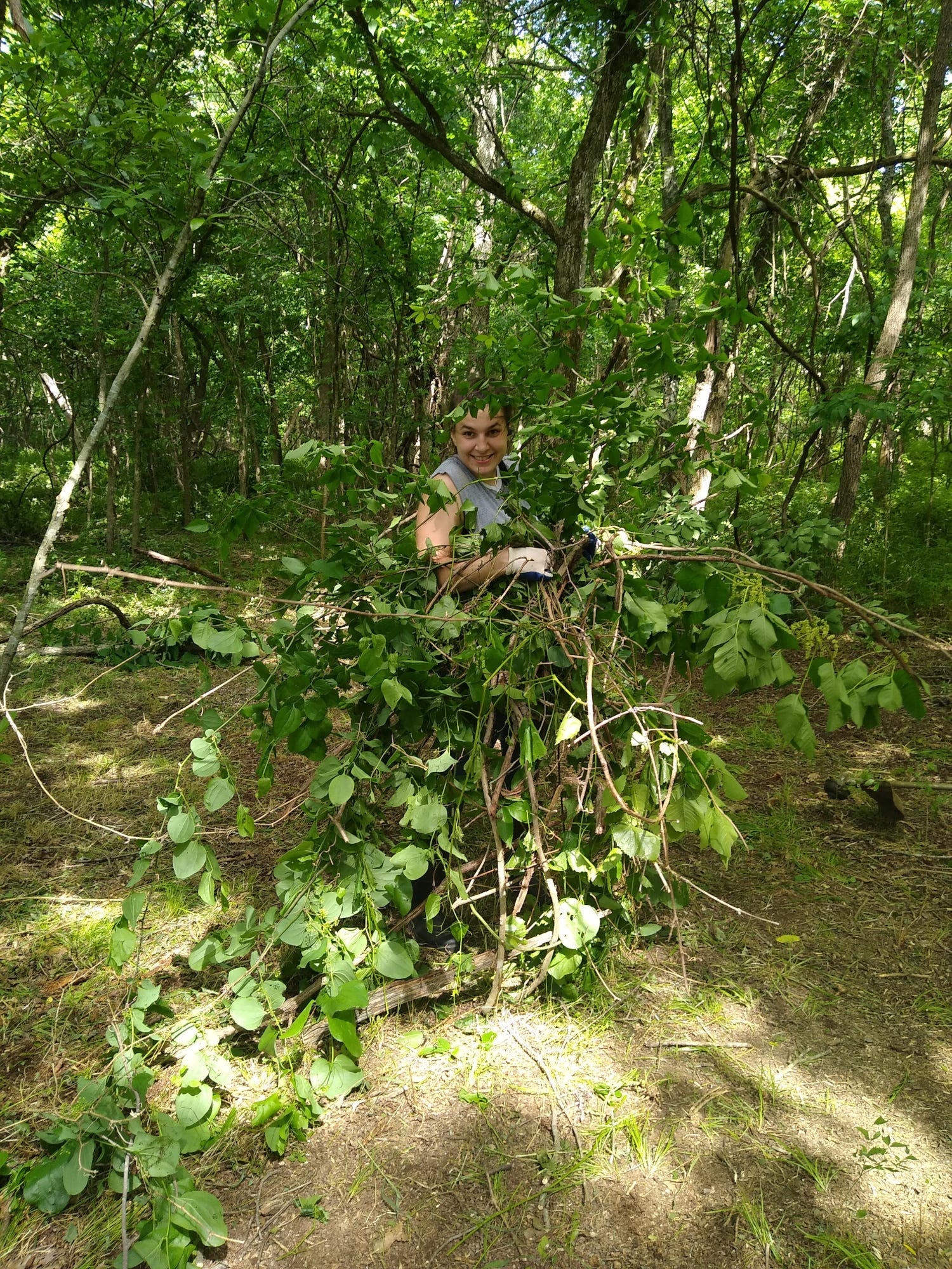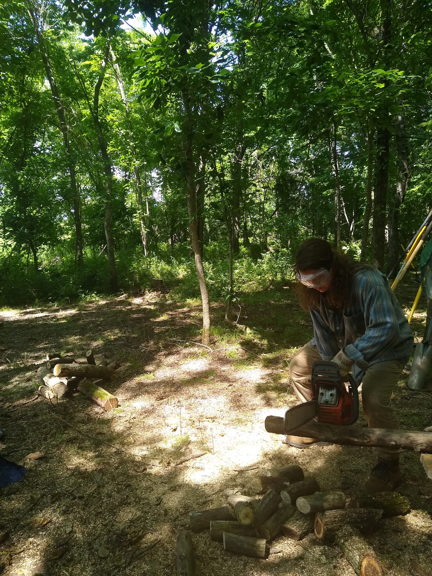 We cut smaller trees into short lengths to create a border for our tent. Our dad used his chainsaw for this project, and he used the opportunity to give Bonnie-Jean some lessons. She did great!