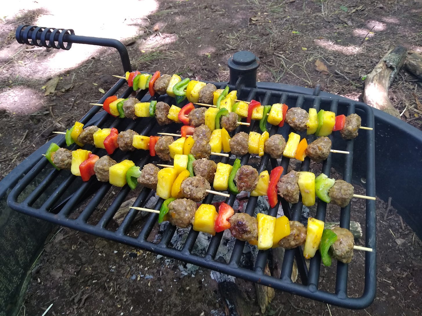 Prepping our campsite was a quite a process, especially considering the 45-minute drive from our apartments. But we packed a lot of lunches, and since we try to avoid gluten most of the time (due to dietary concerns for certain family members), we had to get more creative than sandwiches. Kabobs were always a favorite choice -- usually with precooked meatballs, pineapple, onion, bell pepper, and a glaze made from natural apricot spread and coconut aminos.