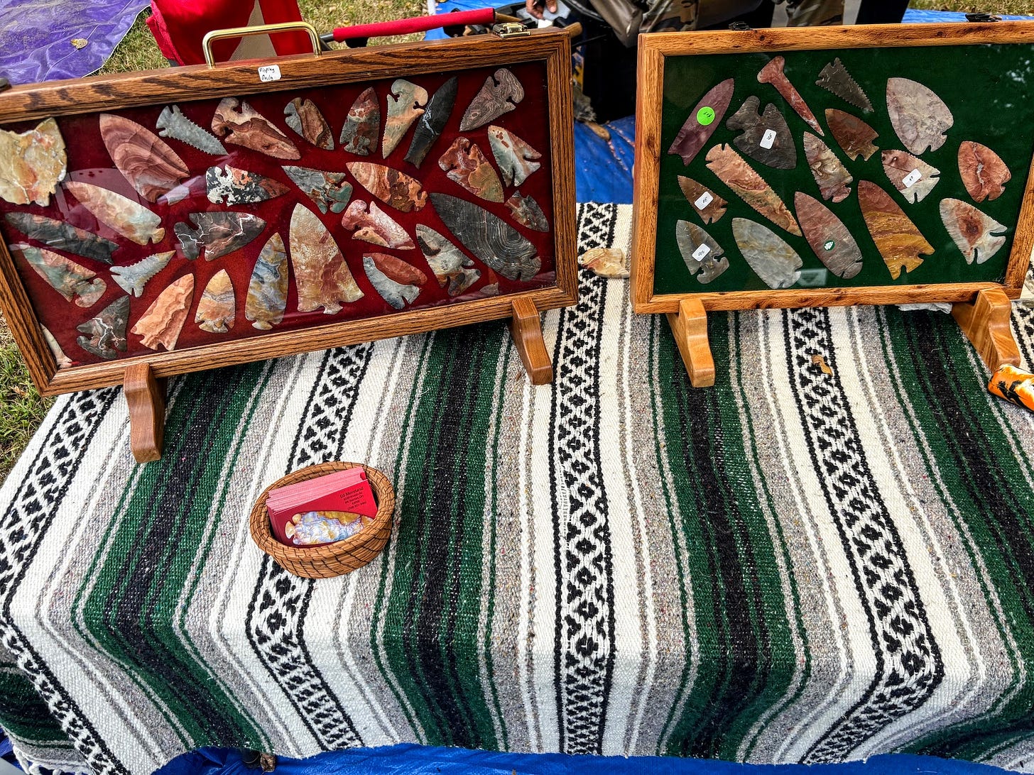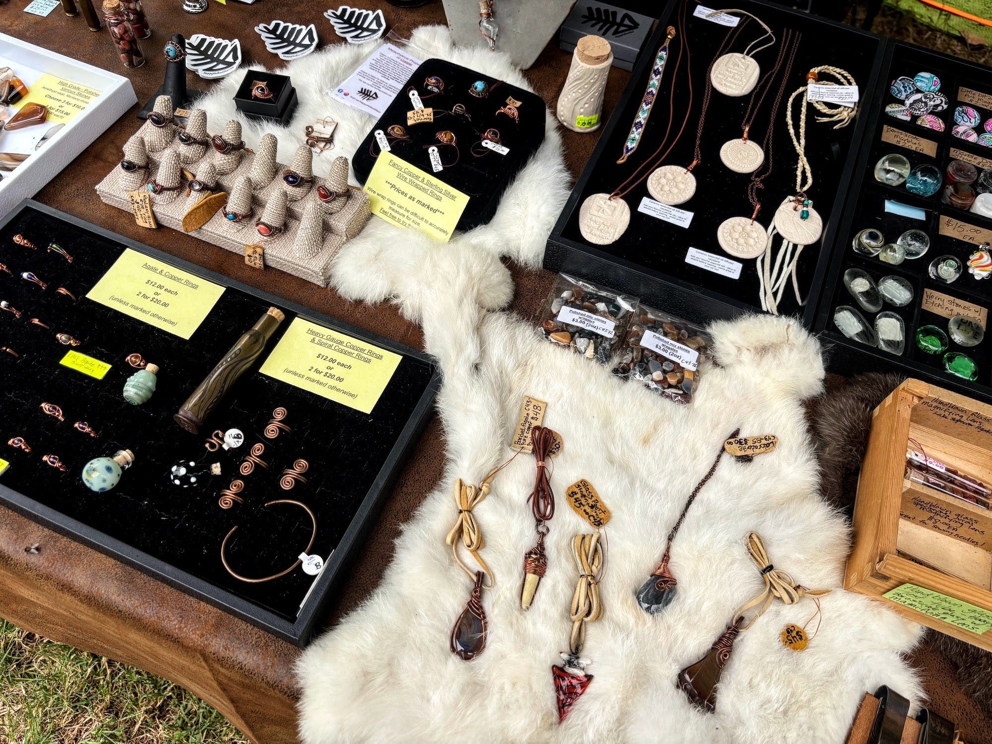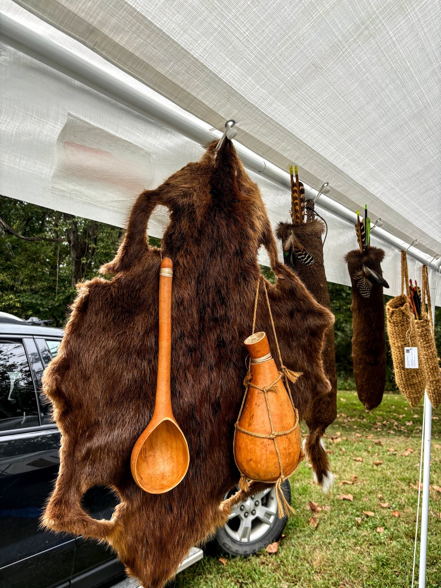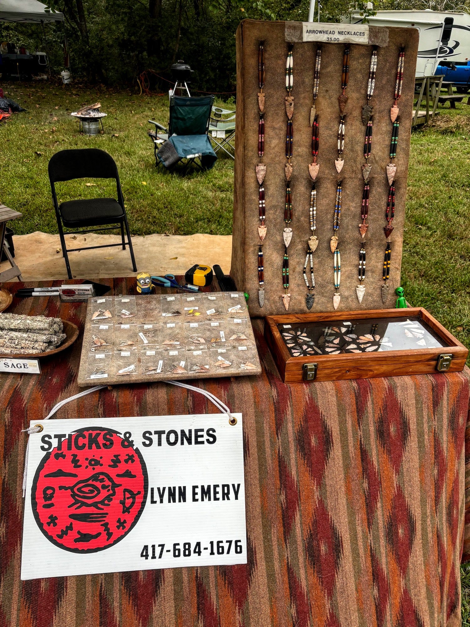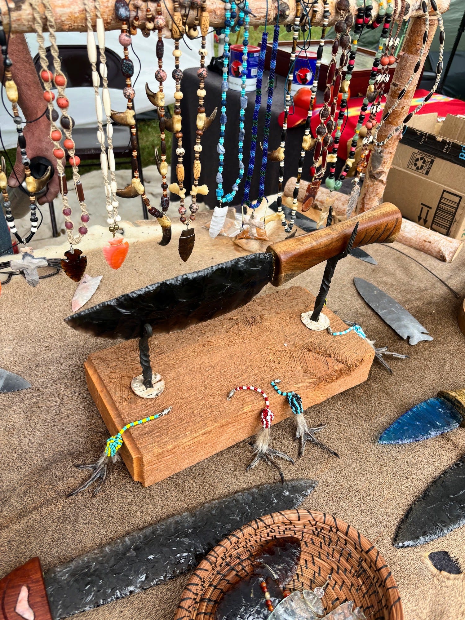 Like last year, there was an impressive array of primitive skills being displayed. We walked past booths where people were learning to carve bows out of branches and shape arrow heads out of flint. Various artists also displayed unique jewelry, decor, leatherwork, and knives.