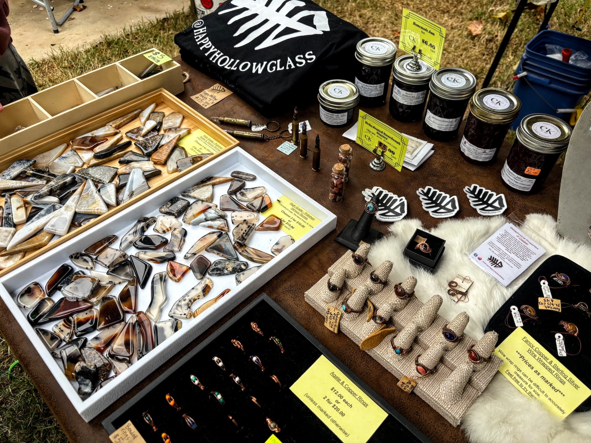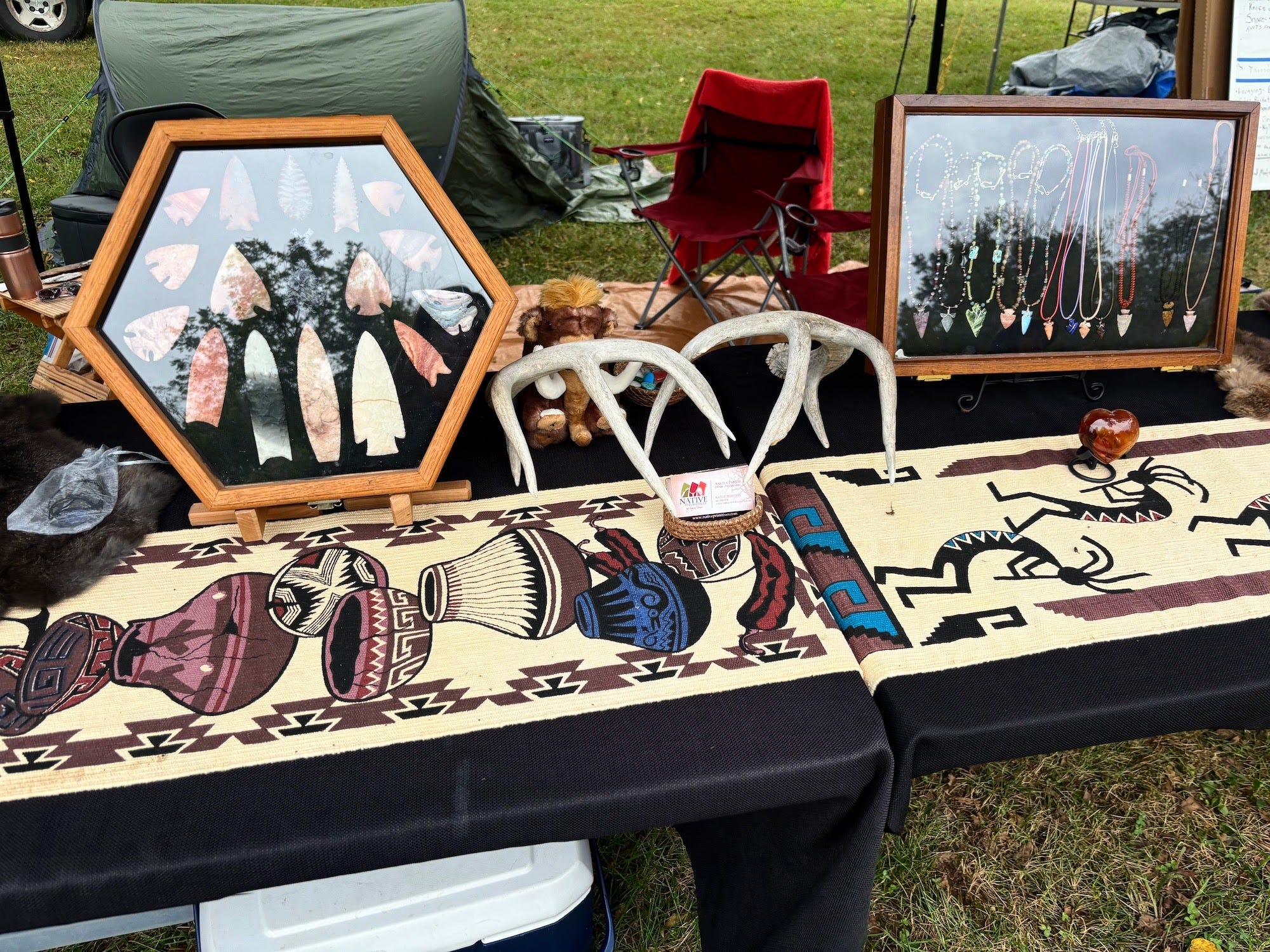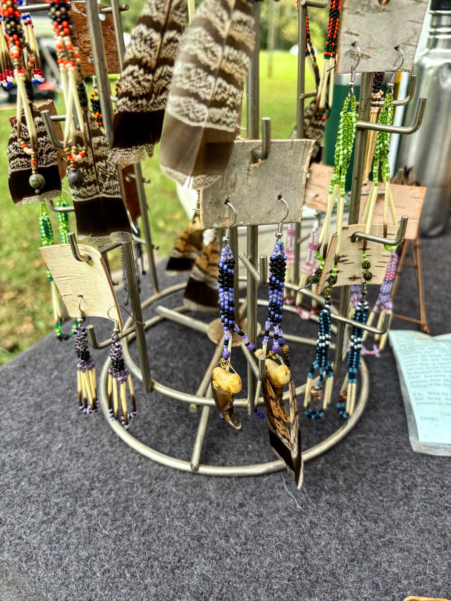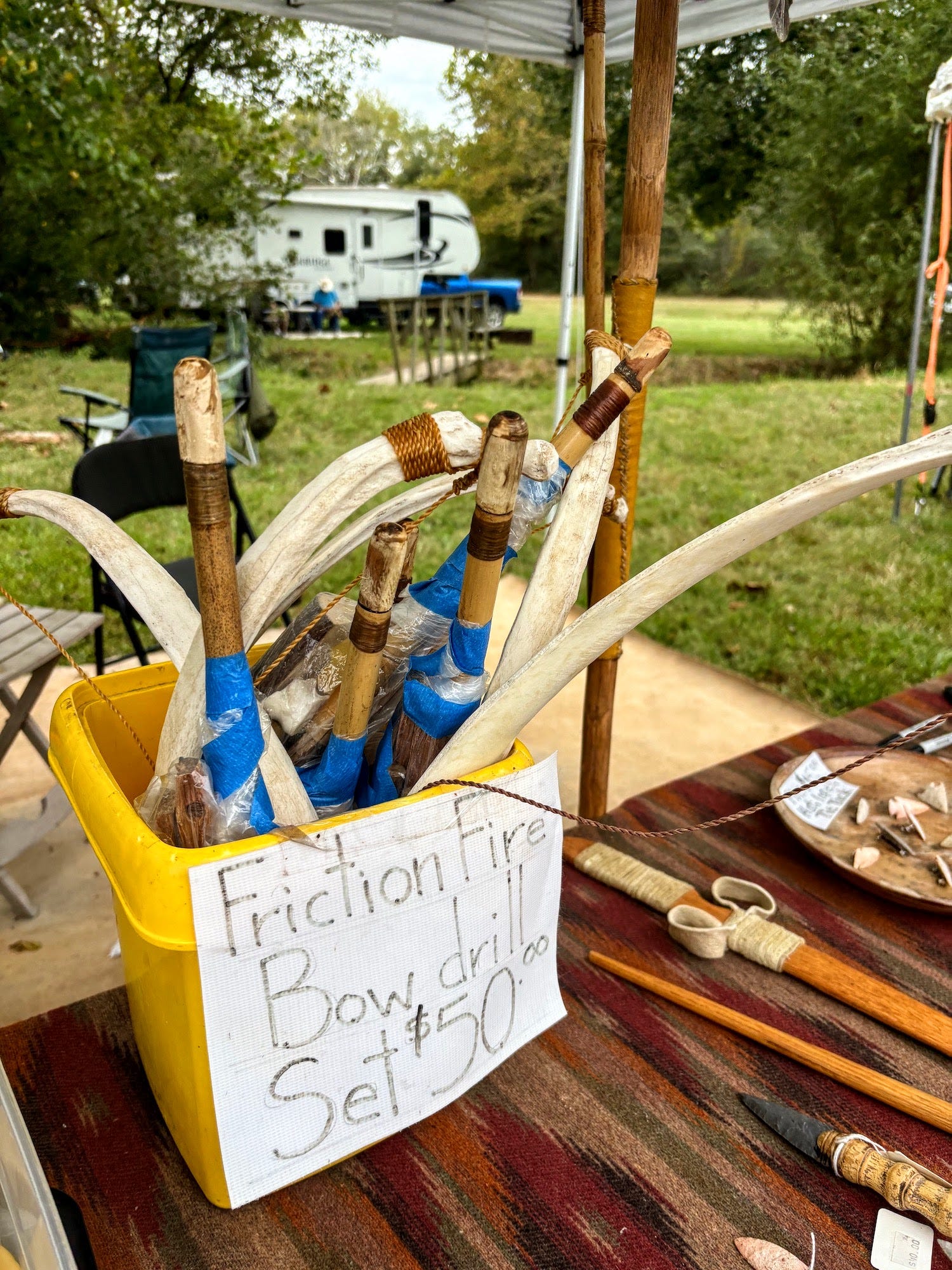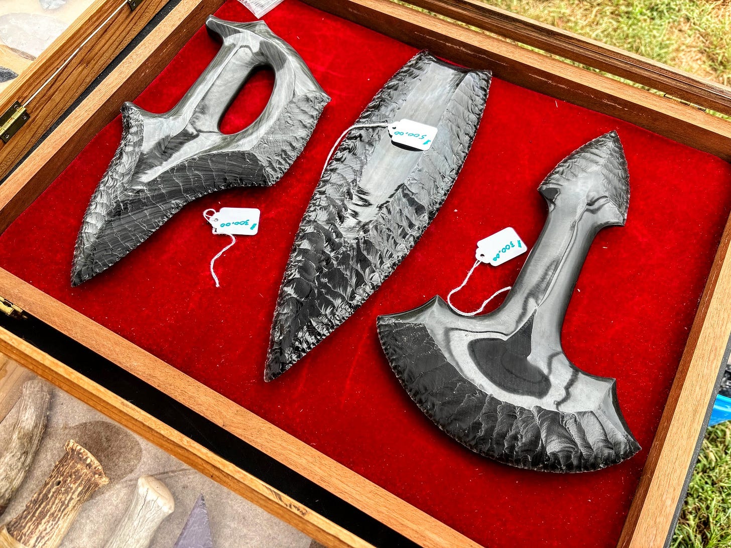 Like last year, there was an impressive array of primitive skills being displayed. We walked past booths where people were learning to carve bows out of branches and shape arrow heads out of flint. Various artists also displayed unique jewelry, decor, leatherwork, and knives.