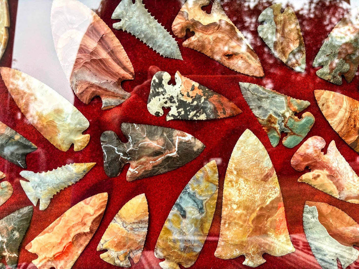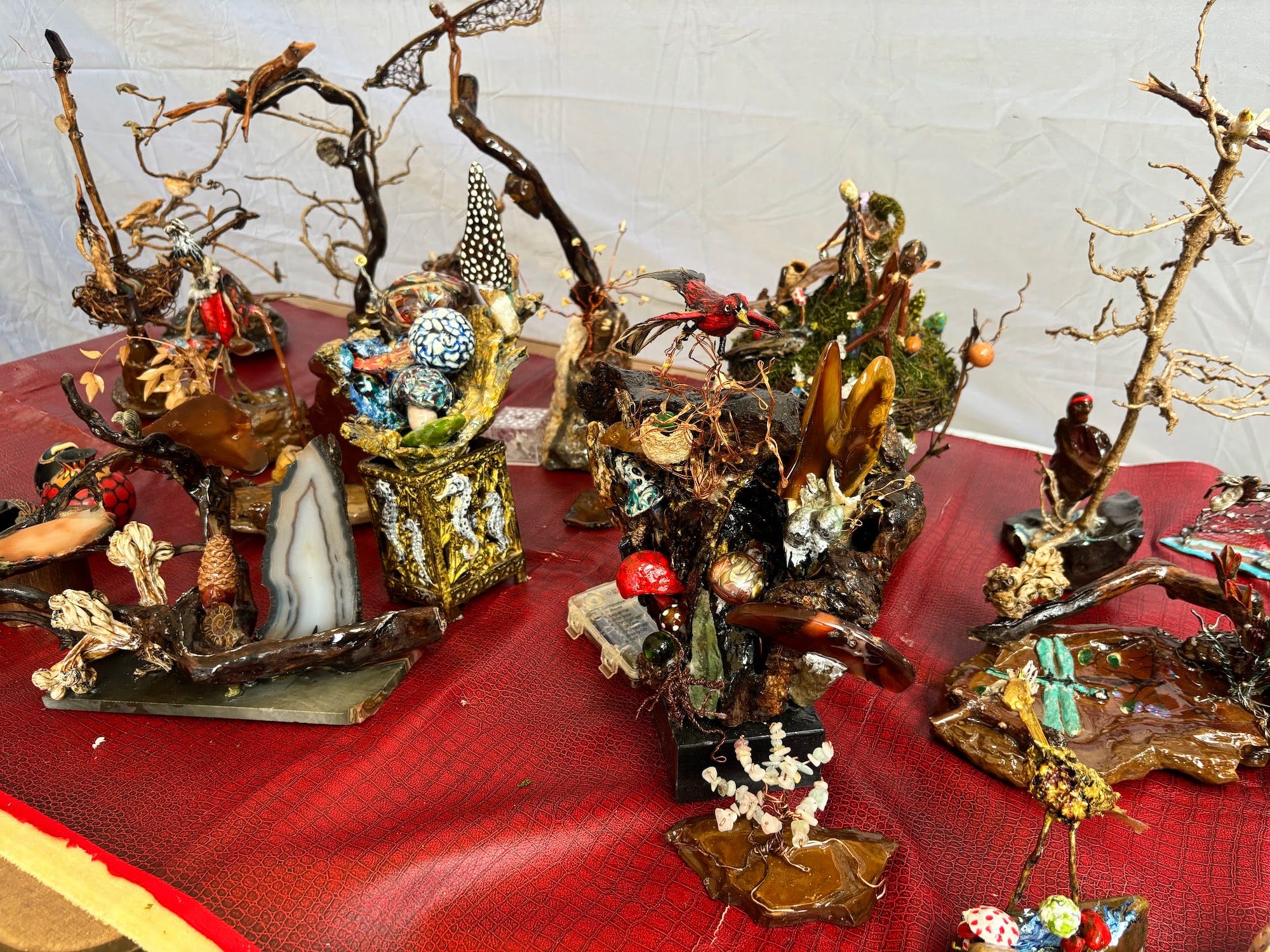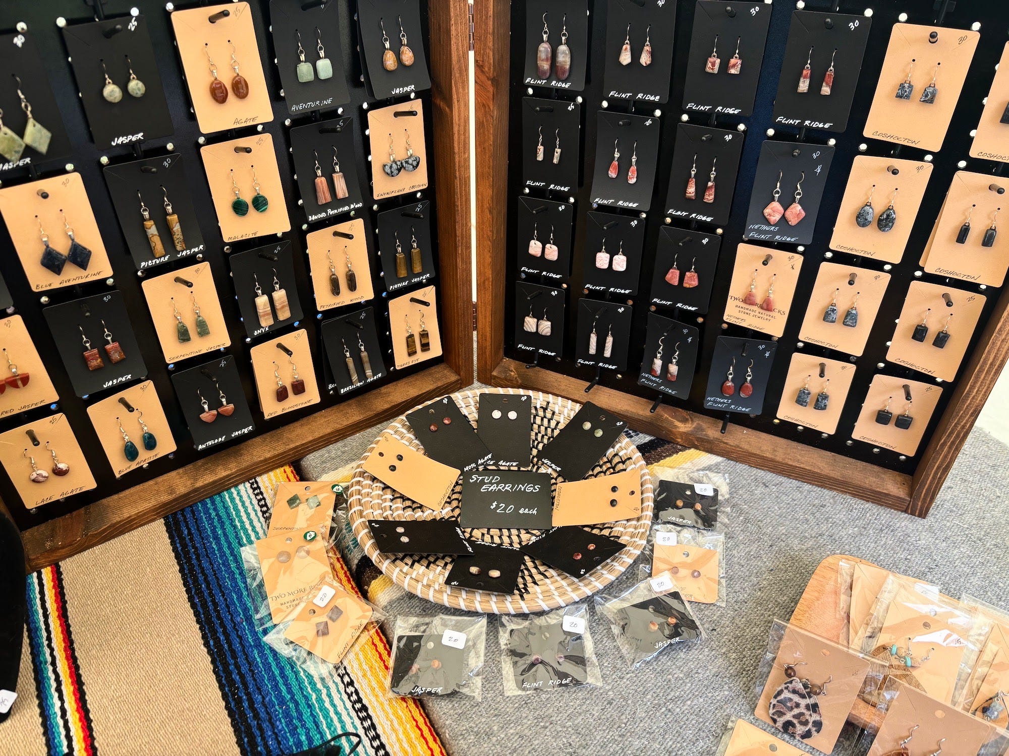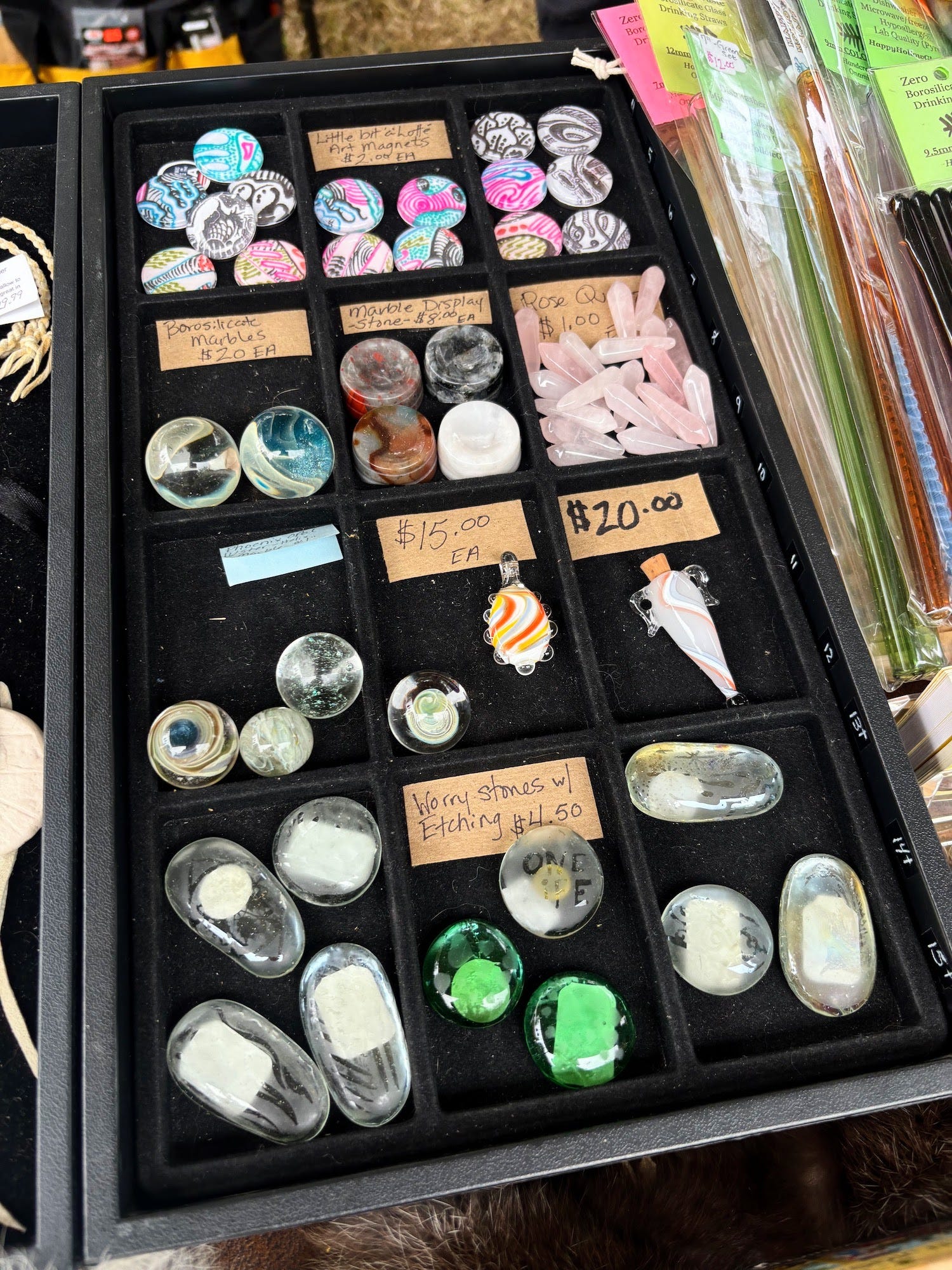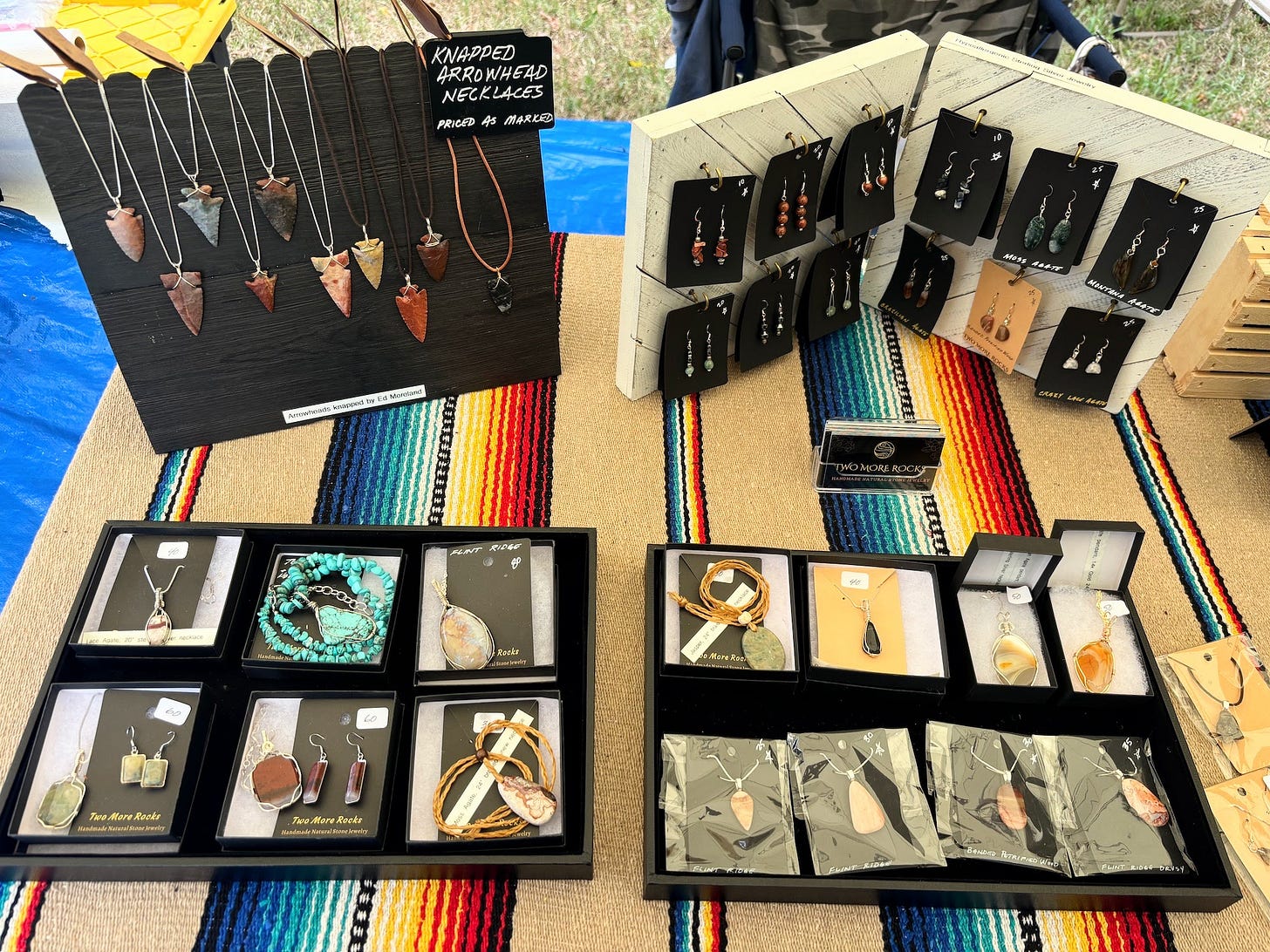 We also enjoyed visiting with Jane Moreland, owner of Two More Rocks. Her husband, Ed Moreland is a lithic artist. Jane uses some of his flint scraps in her jewelry pieces, which are both stunning and unique. The Morelands are from Ohio, and they proudly showed us what makes Ohio flint so special. The colors were so dynamic, the jewelry looked like it was developed from precious stones -- not what I think of as flint.