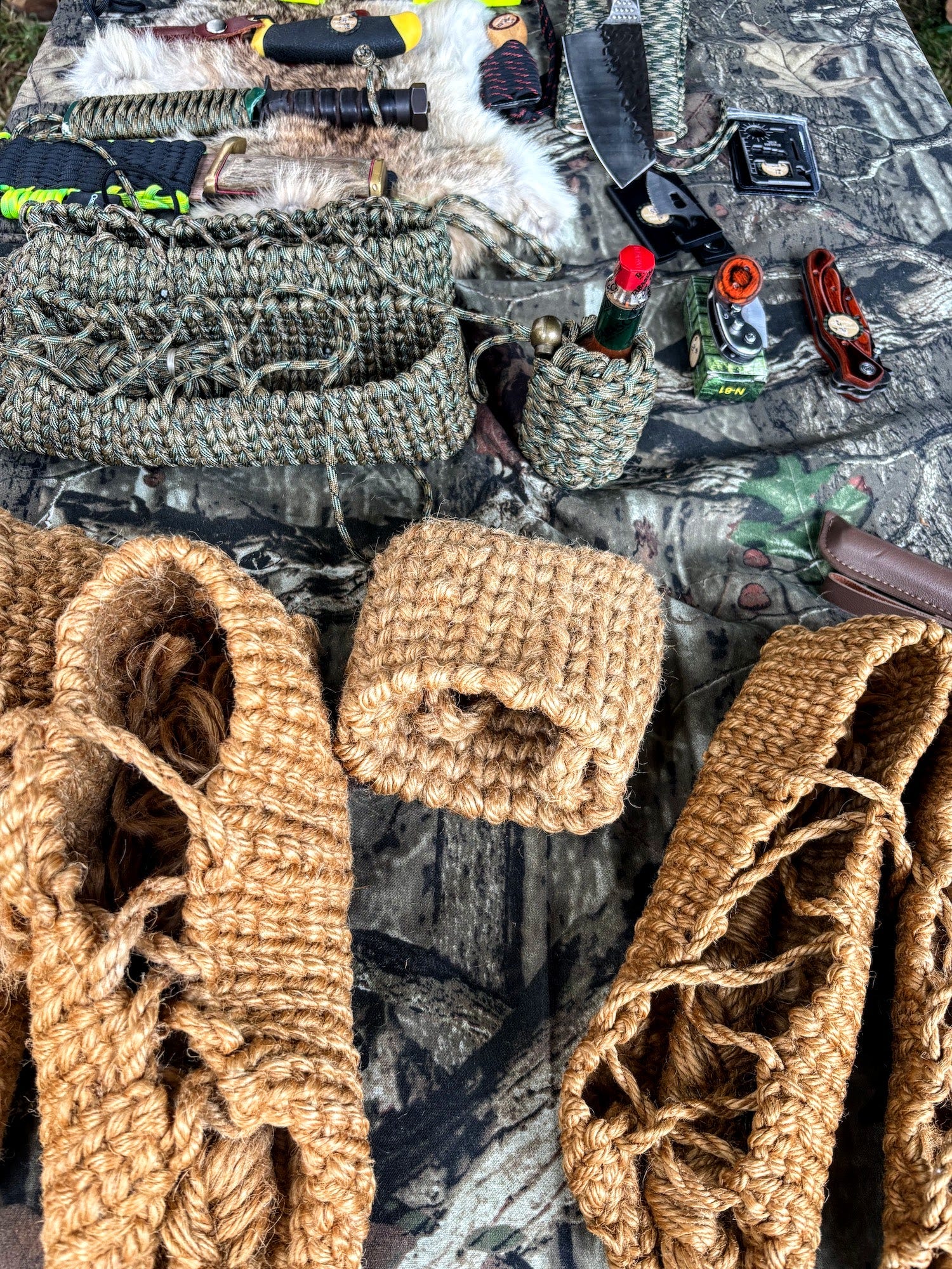 As my sisters and I strolled through the booths, we made connections with several other experts and artists. We enjoyed meeting Jack Mitchel, who specializes in survival and wilderness supplies. He makes backpacking kits of various kinds -- from sewing kits that fit in a straw to tiny fishing packets. He demonstrated a blow gun for his customers, showing how simple items can be used to hunt when needed. He also spoke a bit about cordage -- how you can make rope of various kinds with natural materials. After hearing his brief description of making honeysuckle into twine, I was interested in hearing more.