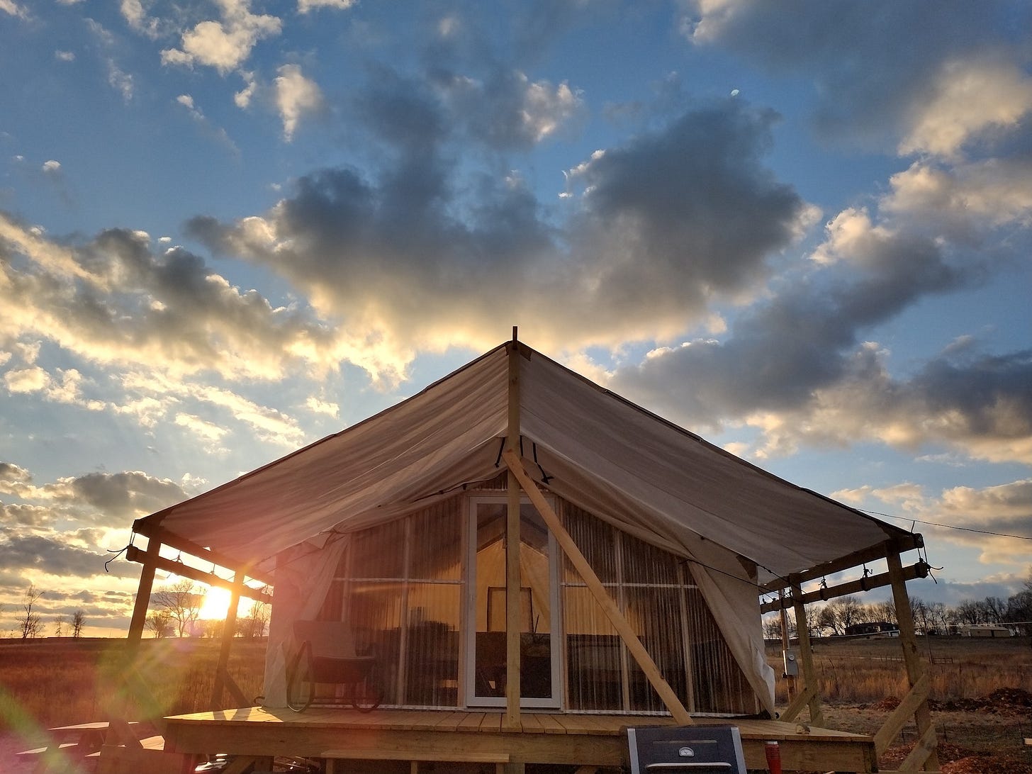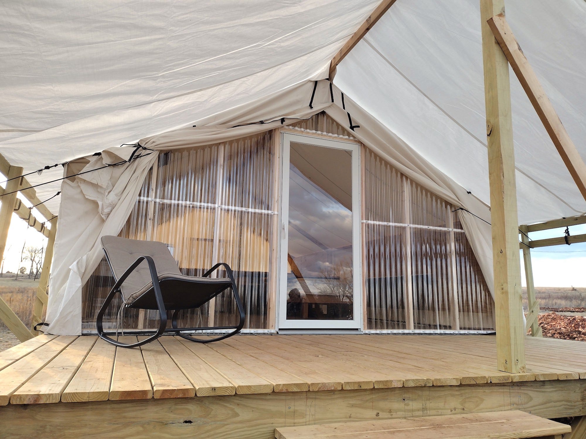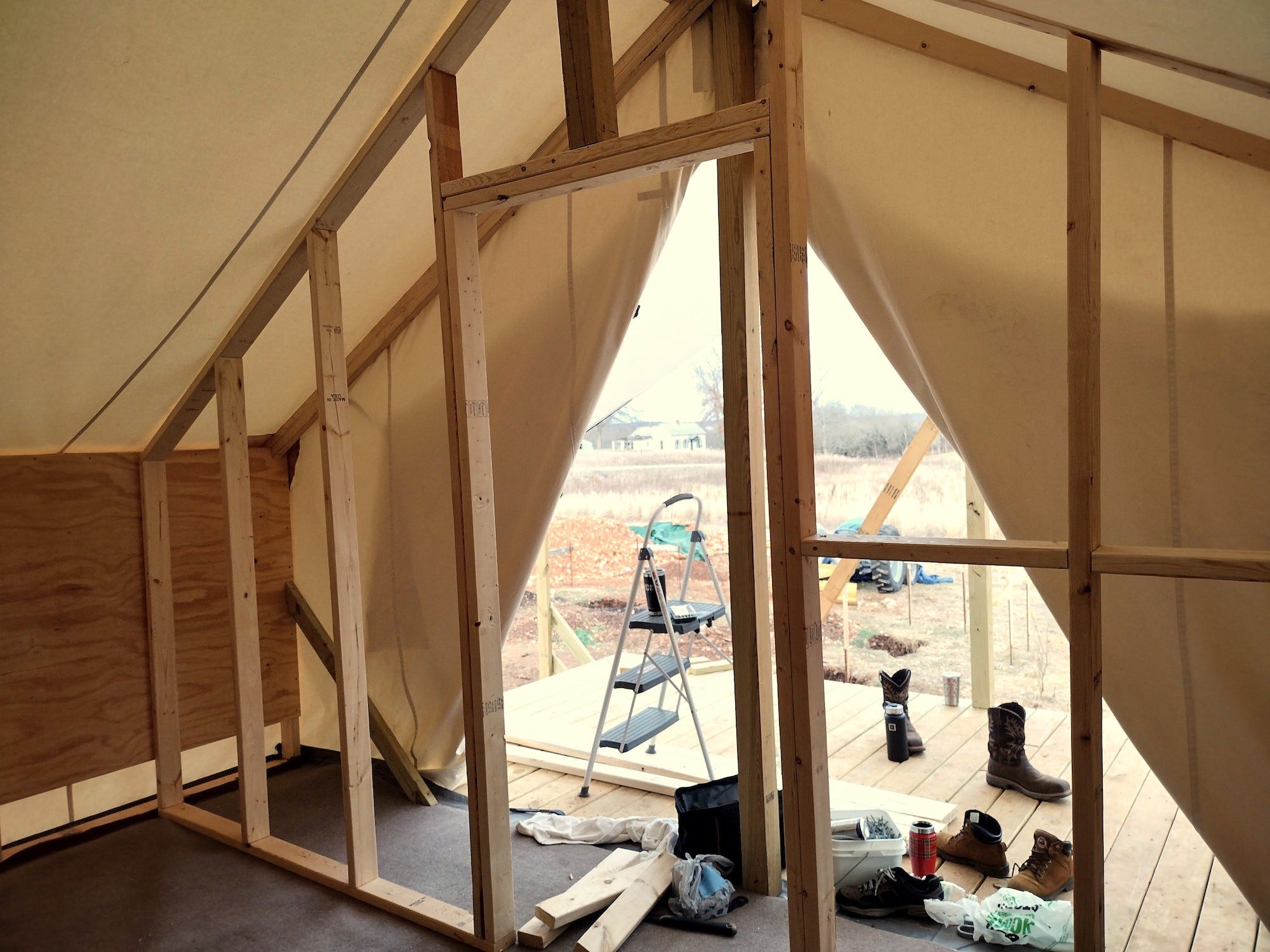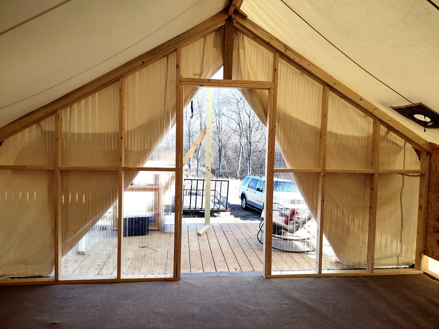 Early in our research process, we had been impressed with the tent entrances on several YouTube videos we watched. Both Dalton Off Grid and Den For Our Cubs built clear polycarbonate walls with real doors for their tent entrances. We loved this idea, but since we were in a hurry and on a budget, we planned to use the tent as is.
