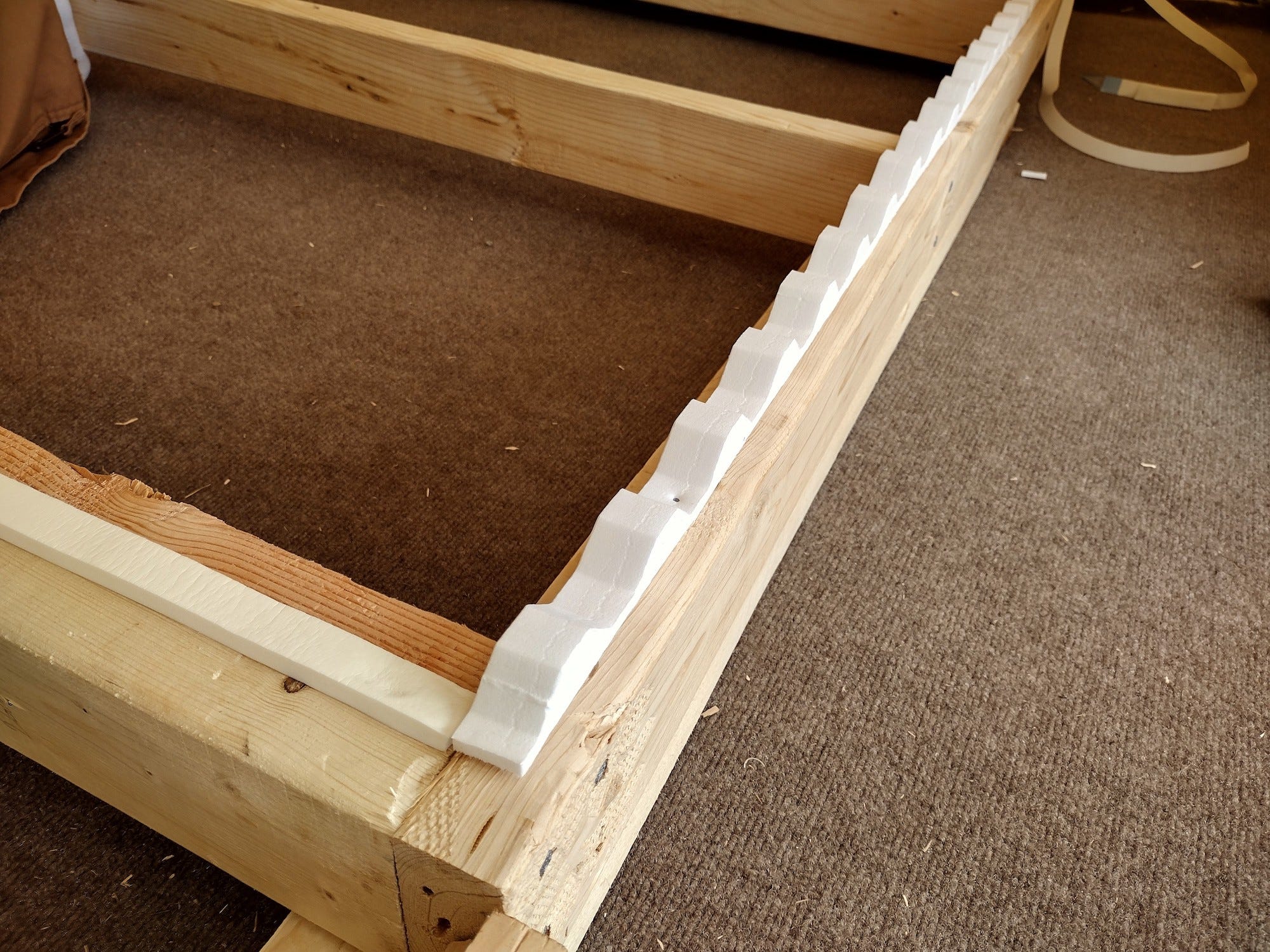 Next, we added the foam closure strips recommended for our Tuftex panels. These have to be in the exactly right spot, or the panels don't line up correctly. We attached the panels as well, but just along the top of our wall, since this spot would be difficult to reach once the wall was in place. We left the middle and bottom loose so that the panels could move freely and not snap during the wall installation.