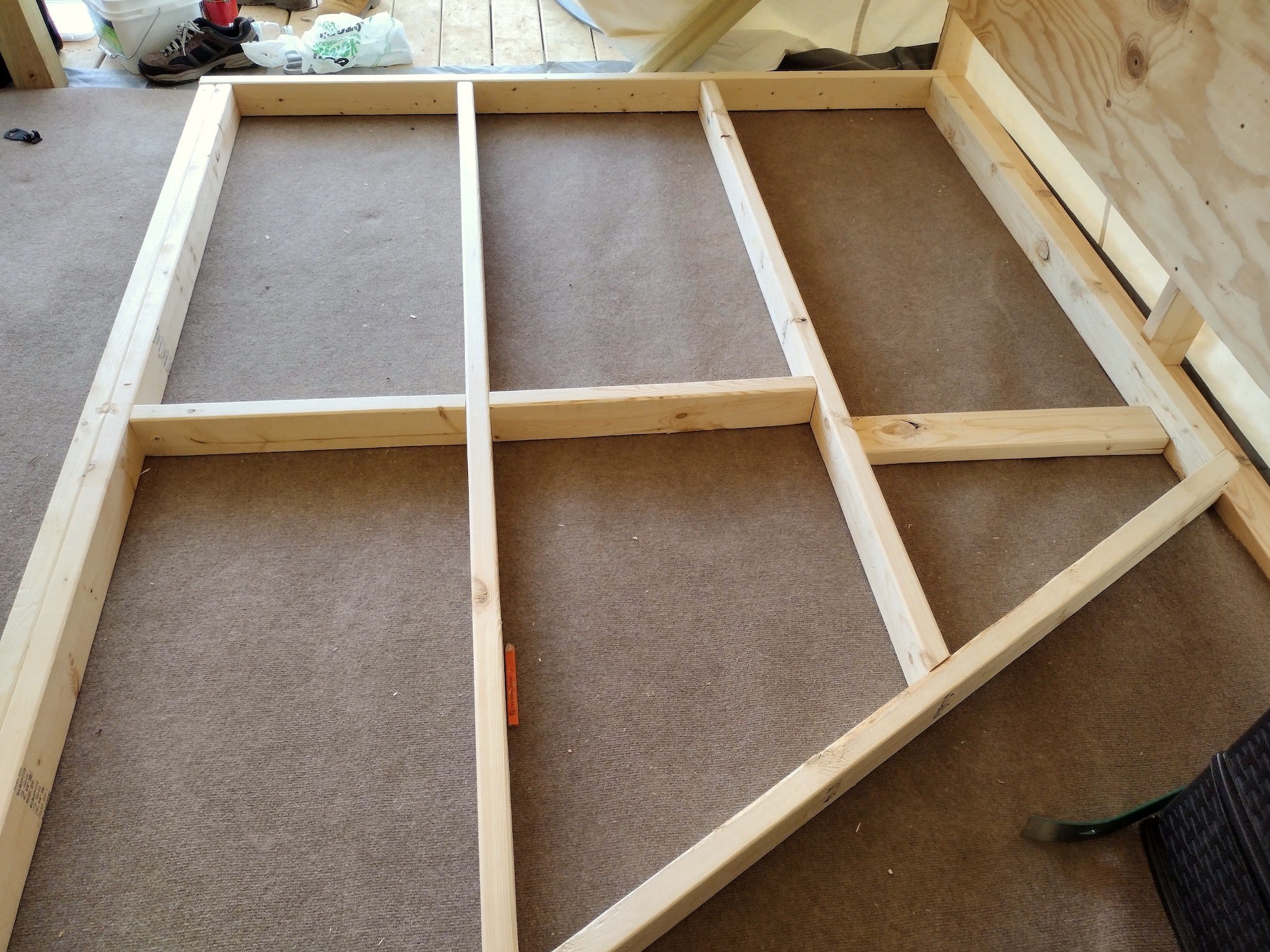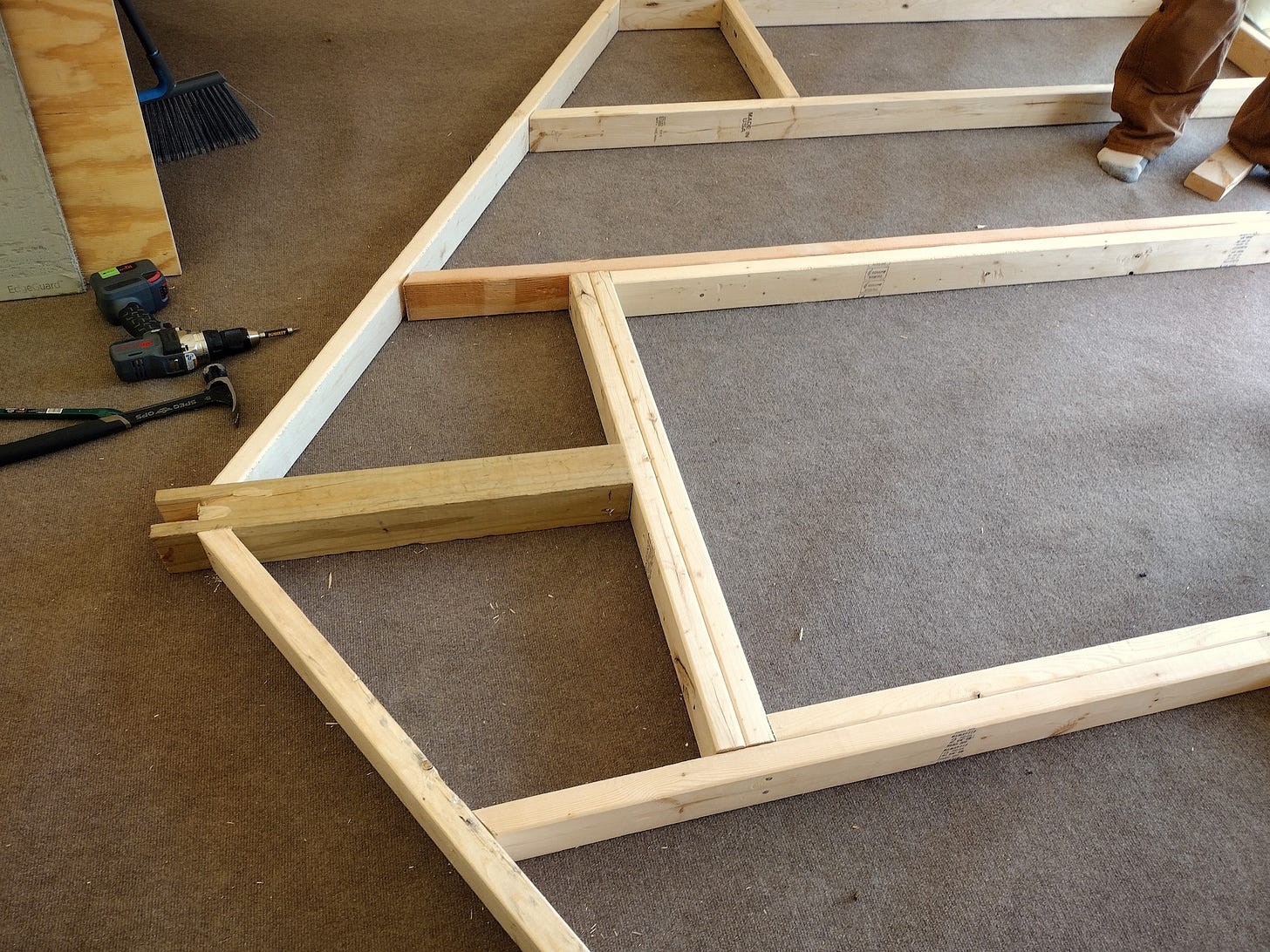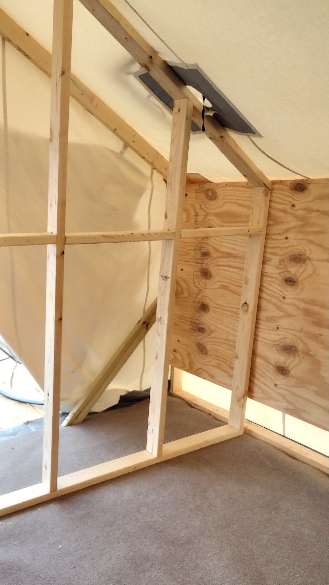 We used 2x4 framing, spacing our studs 24-inch on center. We cut our pieces and laid out our project in the tent. It was a tight space, but we made it work. Because the wall was so long, we built it sort of in two sections. Because we didn't have a continuous bottom plate, it was very tricky to keep things square. That's a mistake I will never make again!