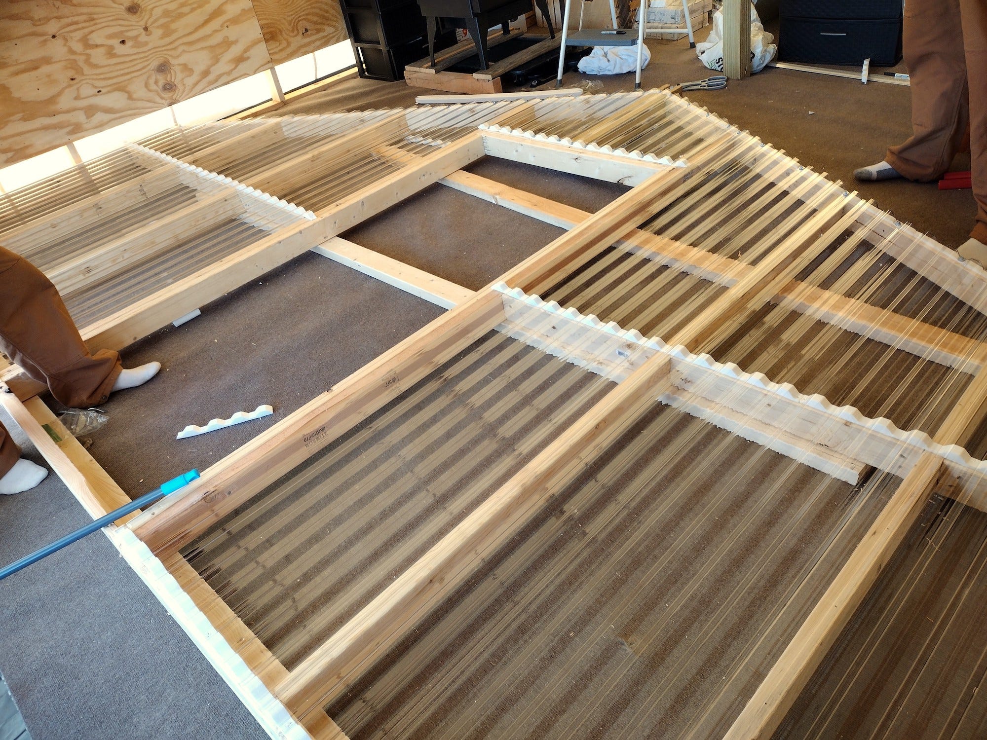 To install the wall, we took down our first set of rafters. After sliding (and shoving, and lifting) the wall into place, we paused to take down the front tent pole. Finally, we pushed the wall so that it lined up with our side walls. We nailed and screwed everything into place. We replaced the rafters just inside the wall. We also took down the braces and finished fastening the polycarbonate panels.