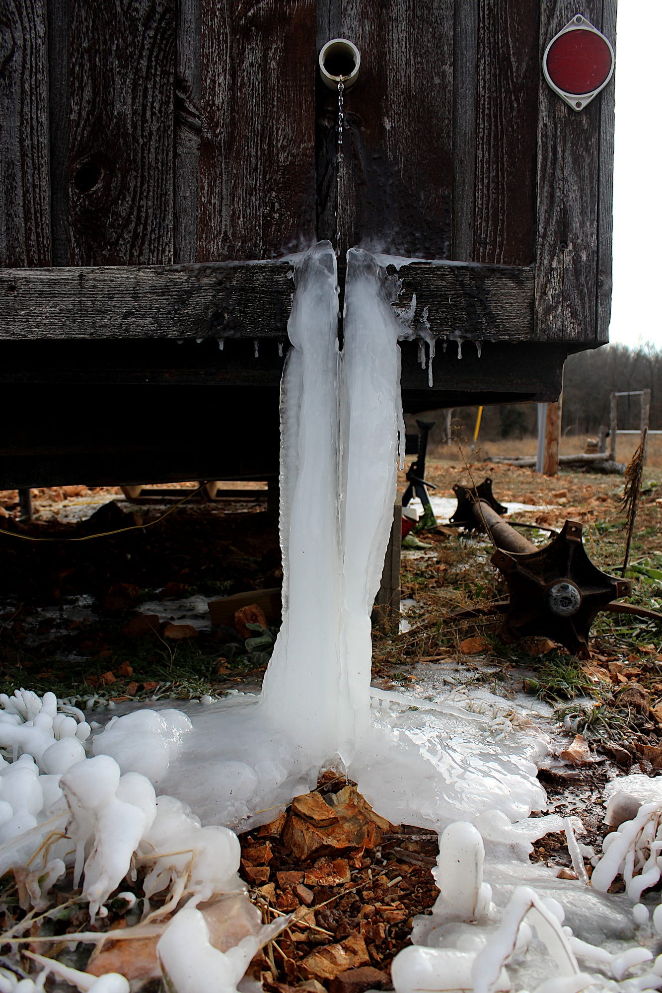 It wasn't just the temps we survived. Because it was below freezing outside, we were not able to have any running water for about a week. We couldn't use our water heater, so we heated kettles to wash dishes. For the first few days, we had cold running water in our office, which helped immensely (small dishes could be washed in the hand washing sink there). We made quite the ice sculpture, as the sink is usually only rarely used and it drains onto the ground. Sadly, on Sunday afternoon, one of us forgot to leave the water dripping after washing some dishes, and by Sunday evening the plumbing was frozen. We hoped it would thaw out on our warmer days this week, but as of today, it still isn't working.