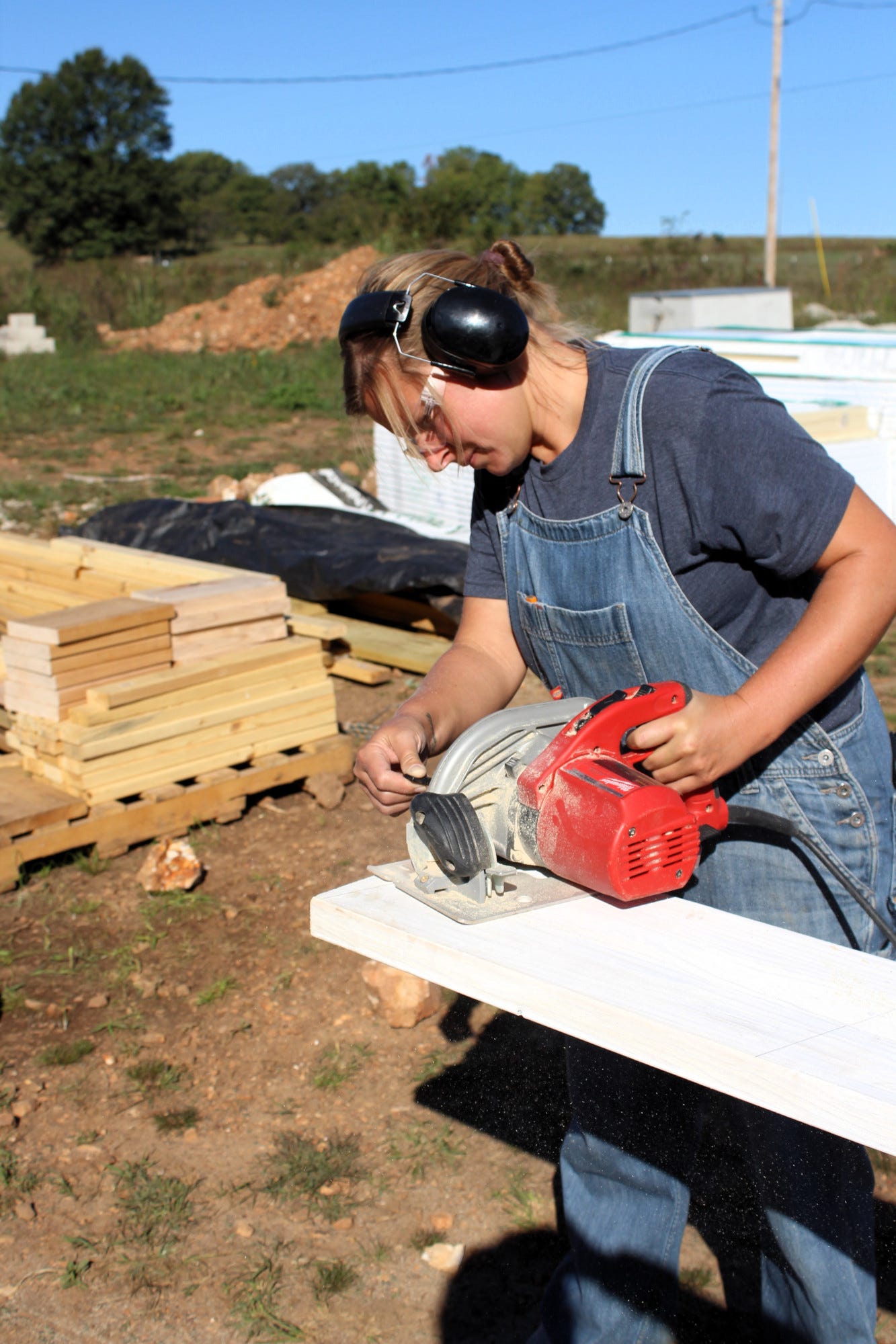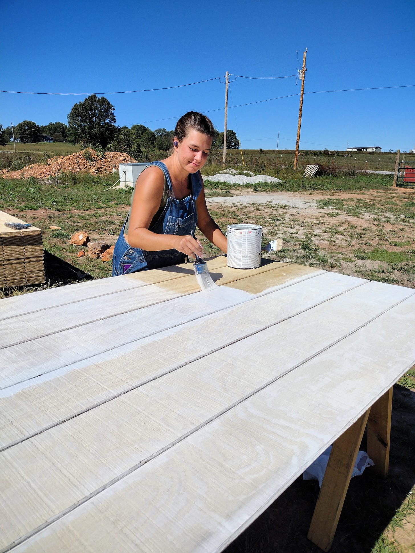 Grace made progress in the white-washing project, finishing the rafters and moving on to our roof decking. We will be using plywood siding for our open-rafter ceiling (a concept we saw online). We have continued to use a whitewash mix of 1-part-paint-2-parts-water, and the wood is turning out beautifully. The whitewashing has taken longer than any of us thought it would, but it doesn't matter, since the rafter installation process is even slower. Bonnie-Jean worked wherever she was needed, moving heavy boards, taking care of the dogs, and helping with the multitude of camp chores that always need to be attended to.
