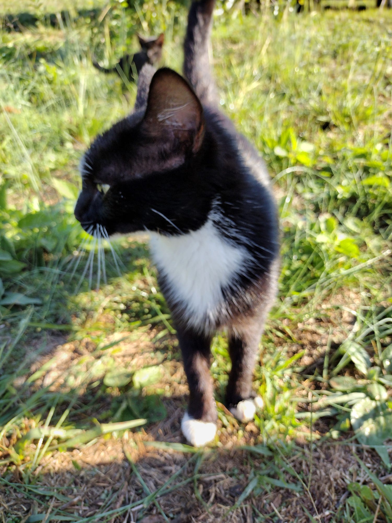 In other news, a cat family joined our homestead this week -- either temporarily or indefinitely. Last Saturday evening, a new cat showed up at dinnertime. Several strays have lurked around for months, but they always keep their distance. This cat was different. She waited by the grill, begging politely for scraps. The next morning, we saw her again -- this time with two kittens. They seemed to be sheltering under our tractor. When it became clear over the next days that they weren't leaving anytime soon, Jeremiah converted our rarely used doghouse into a cat shelter. The mama and the black kitten are friendly, but the gray kitten is very skittish. We have been feeding and trying to socialize them while they are here. We don't know if the cats are strays or if they were dumped. It's also possible they are visiting from one of the many nearby barns. We aren't getting overly attached, since the cats may move on. But if they stick around much longer, I think we will have to name them.