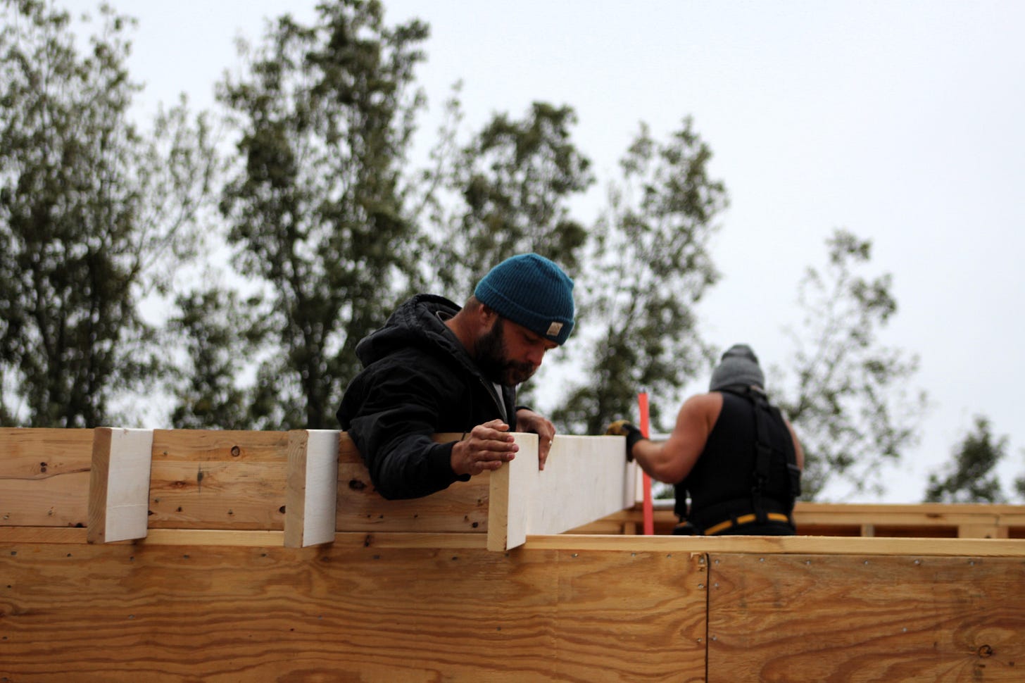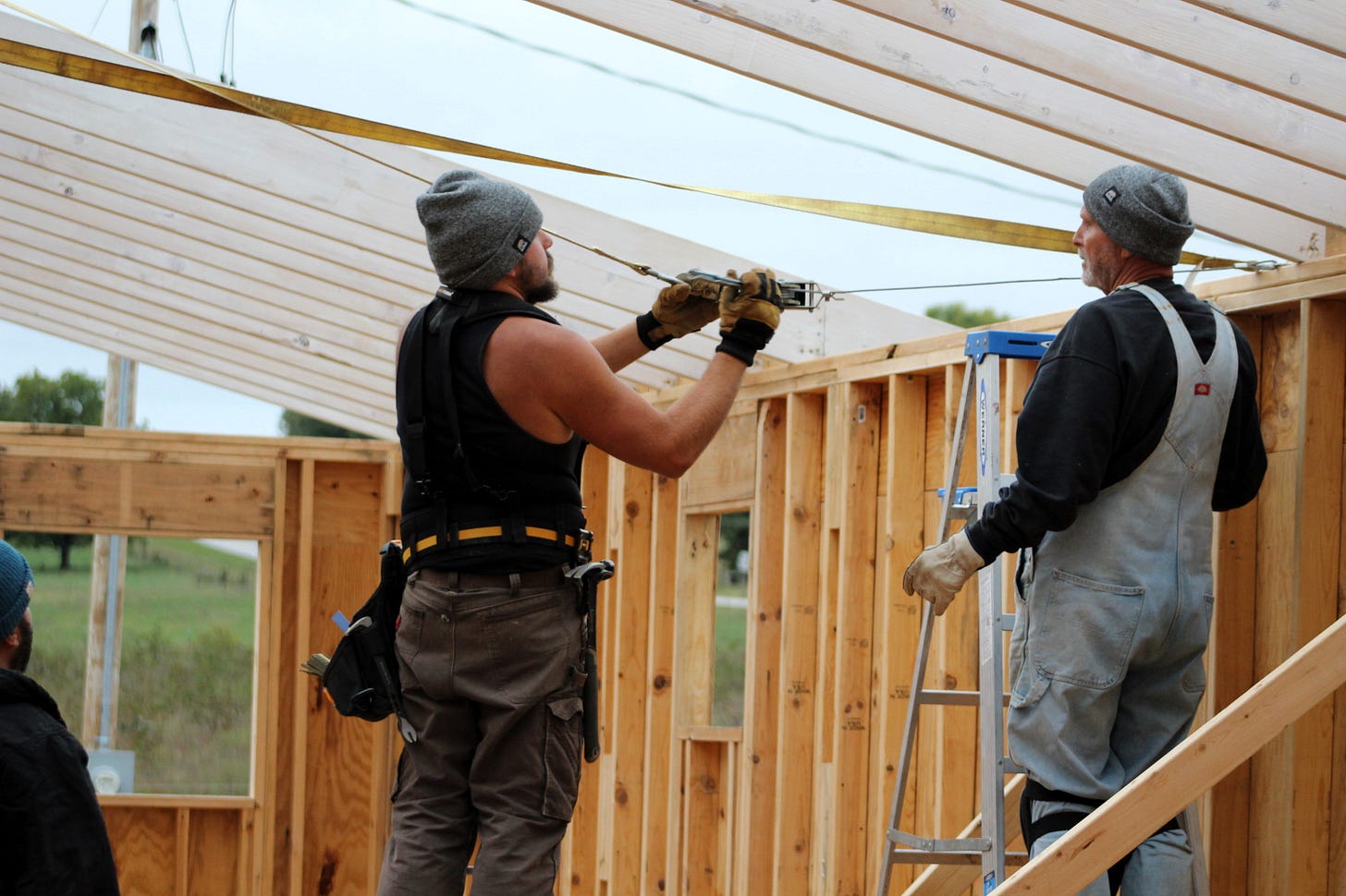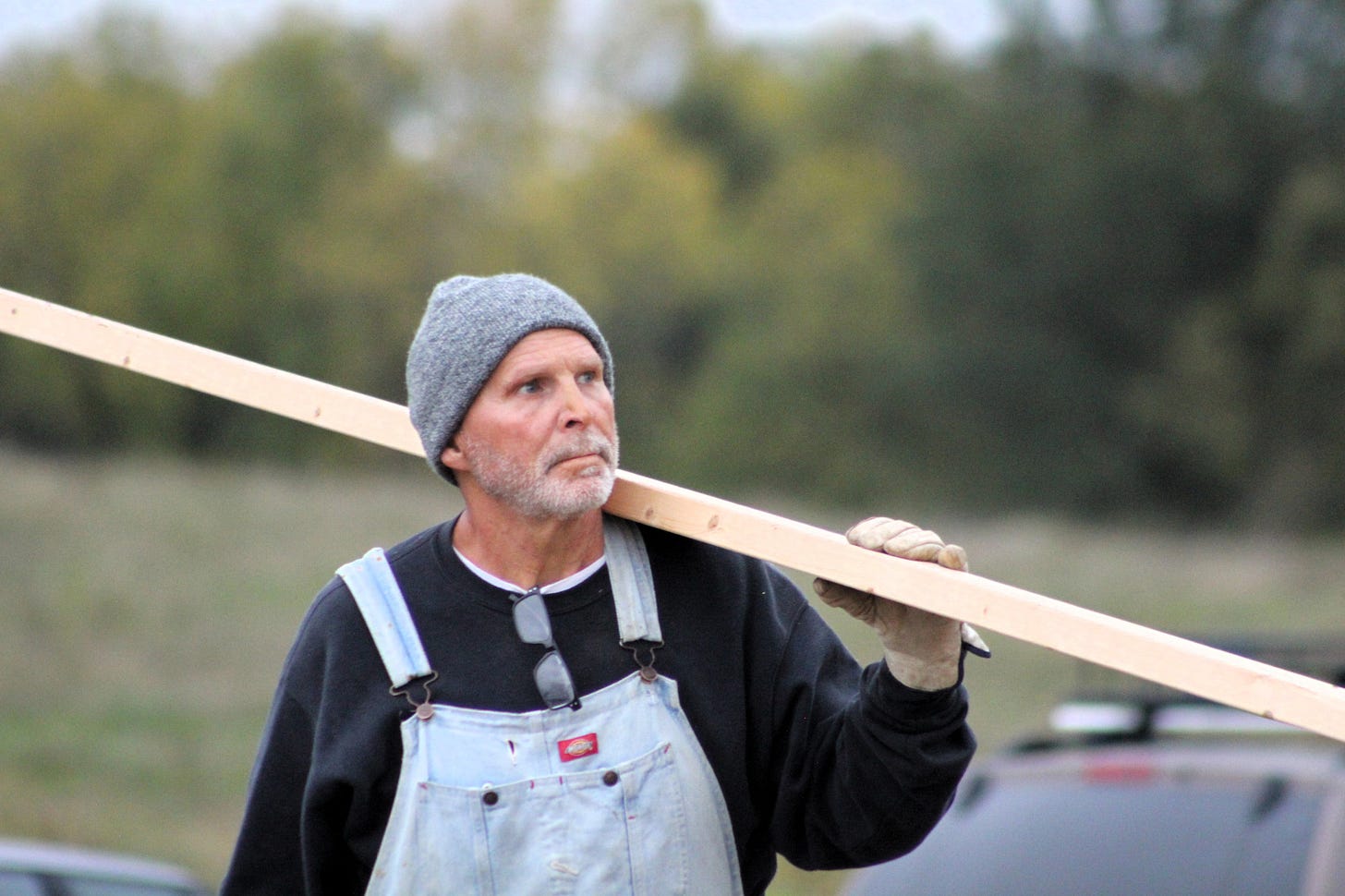 On Saturday, we started the day planning to get a good chunk of our rafters up. It was a cold, windy day. Before we got to work, we enjoyed the campfire our brother Jeremiah started and a few of us partook in some of his stick-roasted biscuits. They turned out delicious -- and I was glad we had only picked up a couple cans of dough or else I would have been seriously tempted to splurge myself.