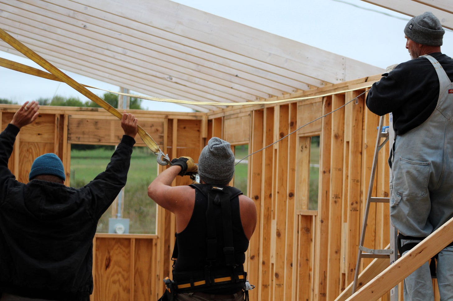 We had all been a bit discouraged with our slow progress with the rafters, so having such a successful weekend gave us all renewed energy for the rest of the week. On Monday, we tackled the rake walls on both ends of the house. I had been a bit overwhelmed with all those angles, but it wasn't bad at all. We just set our miter saw to 14 degrees, and everything fit just like it should have. We had both walls framed and sheathed by late afternoon.