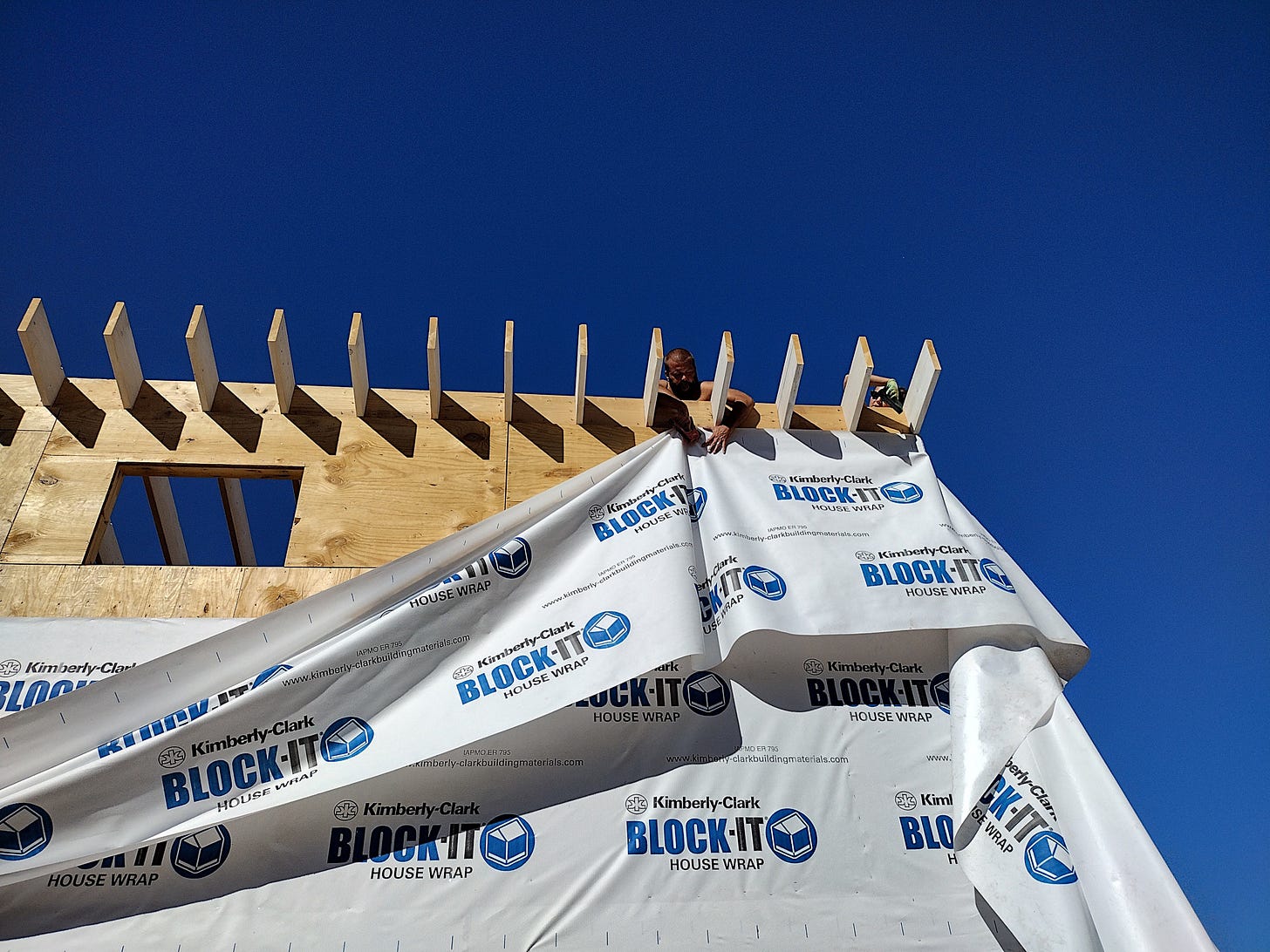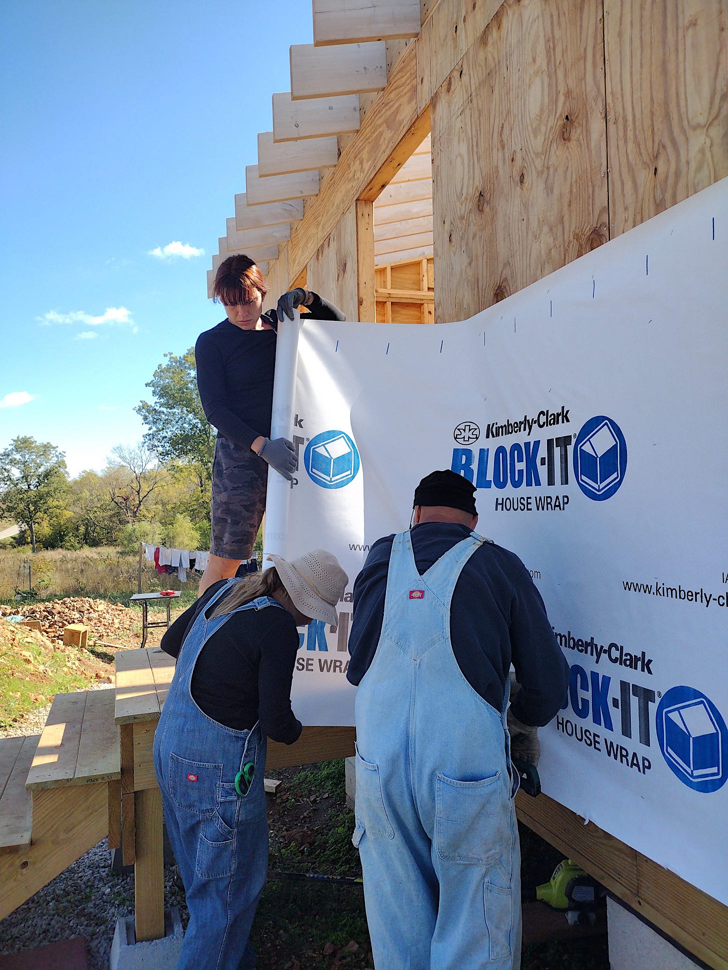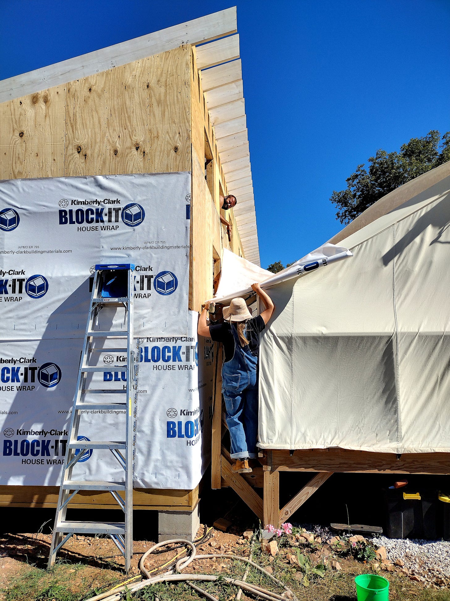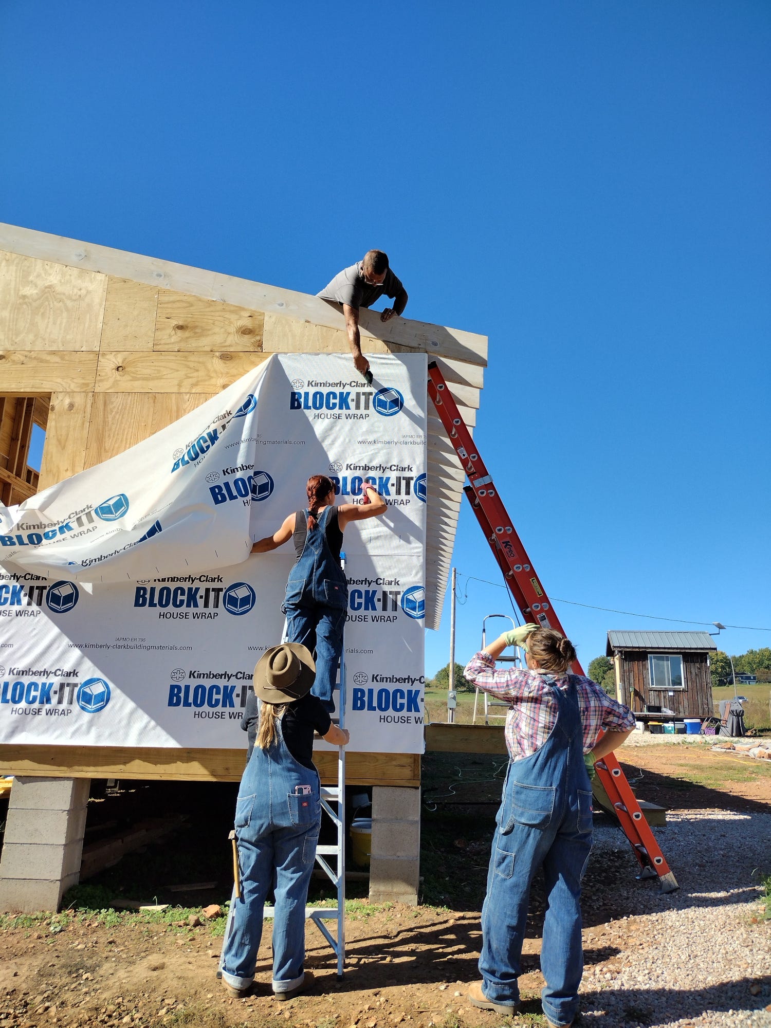 On Thursday, we hit the ground running again. Our dad helped all of us ladies work on installing the house wrap. First, we did a detailed examination of the sheathing all over the house, looking for sections we had forgotten to nail properly. When we were ready to start with the wrapping, we decided to cut our 10-foot rolls in half to make them easier to work with. It was tricky to put up the wrap between the tent and the house, but we wrangled it in there. We had to quit working early to go to the dentist (a bunch of us had scheduled cleanings for the same afternoon), but we made a good start. We love the folks at Willard Family Dental, and we are thankful to have such a great clinic so close to home!