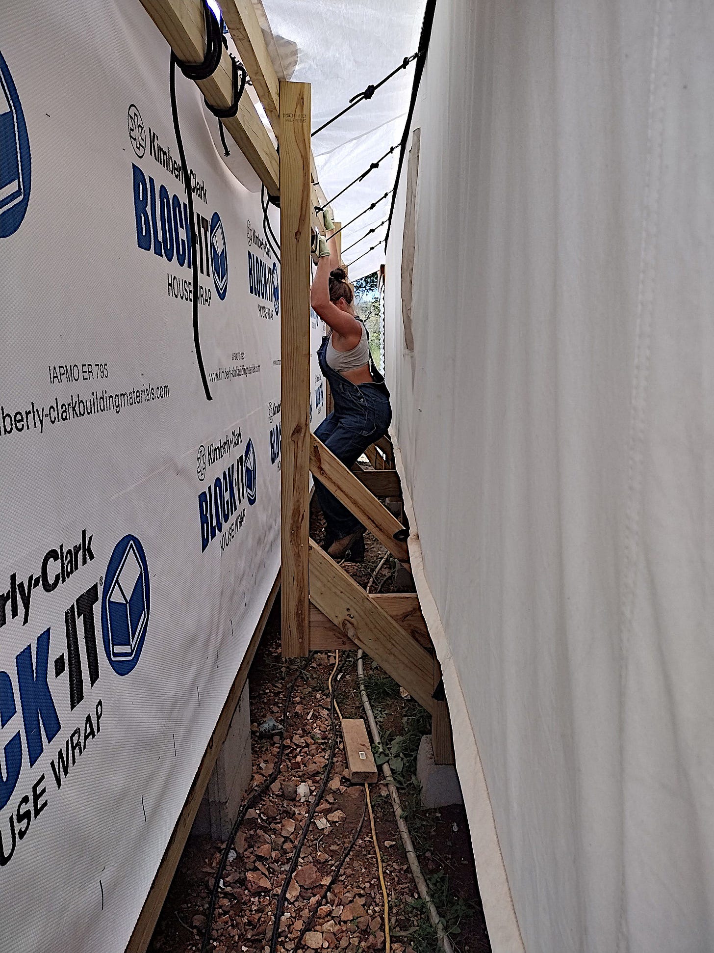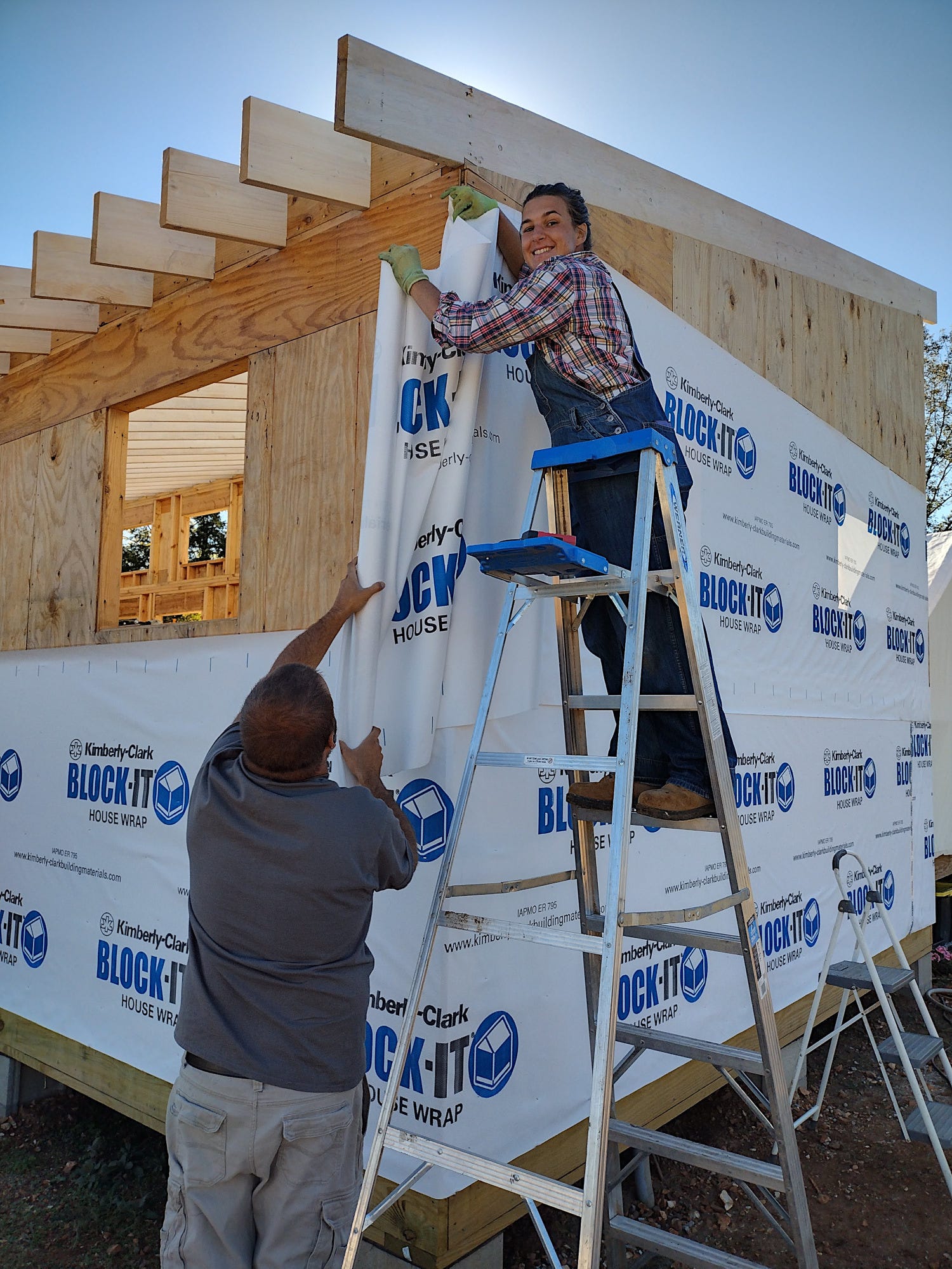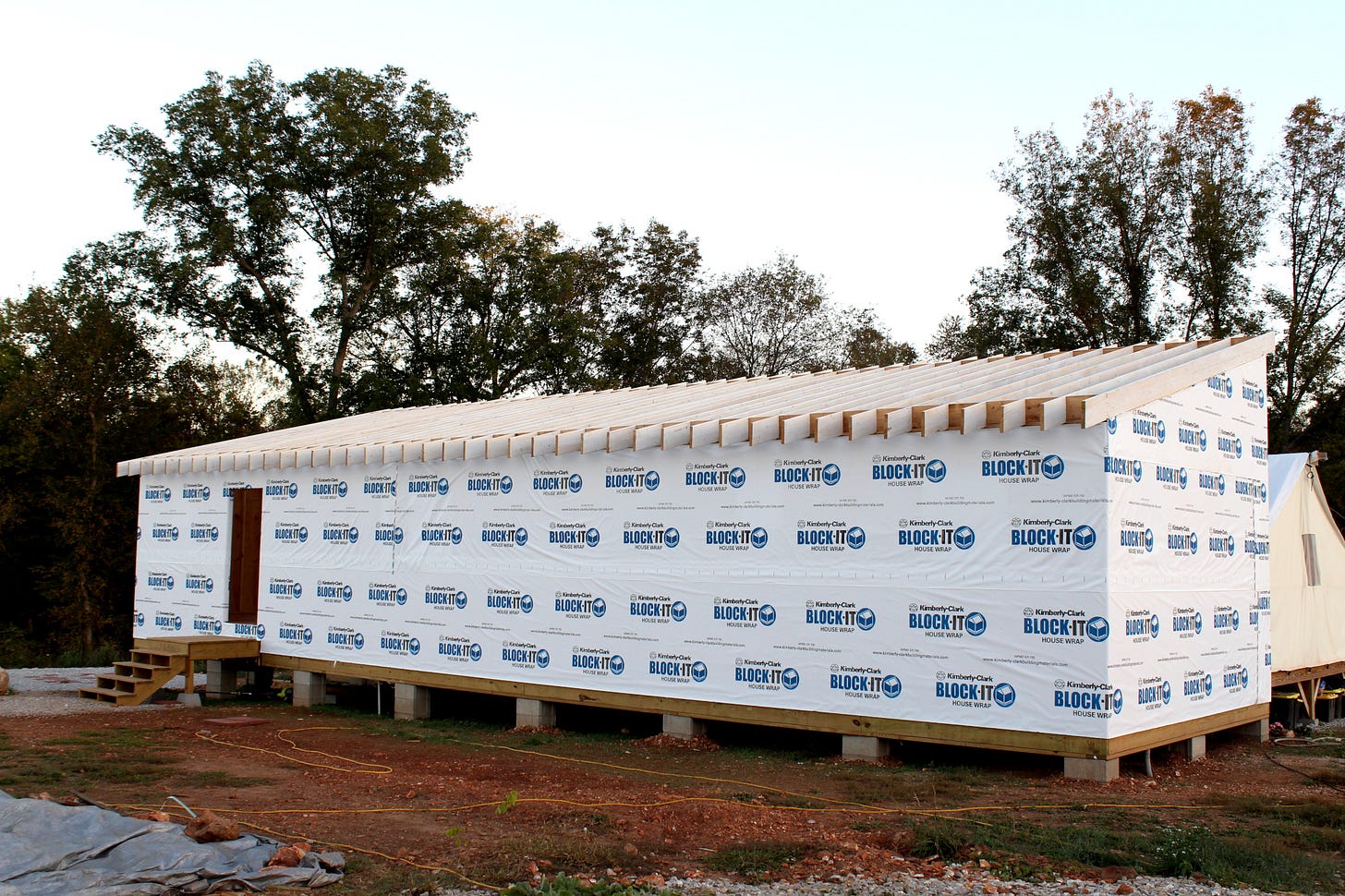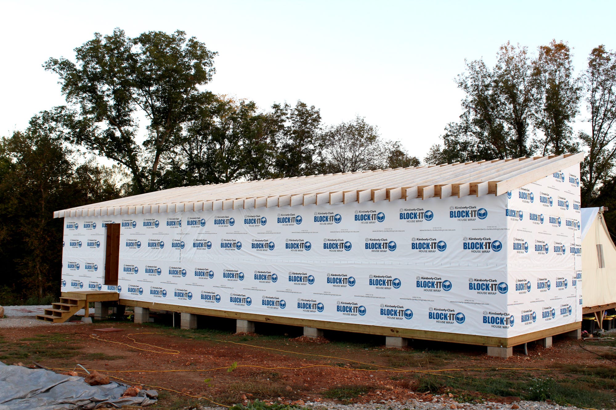 On Thursday, we hit the ground running again. Our dad helped all of us ladies work on installing the house wrap. First, we did a detailed examination of the sheathing all over the house, looking for sections we had forgotten to nail properly. When we were ready to start with the wrapping, we decided to cut our 10-foot rolls in half to make them easier to work with. It was tricky to put up the wrap between the tent and the house, but we wrangled it in there. We had to quit working early to go to the dentist (a bunch of us had scheduled cleanings for the same afternoon), but we made a good start. We love the folks at Willard Family Dental, and we are thankful to have such a great clinic so close to home!