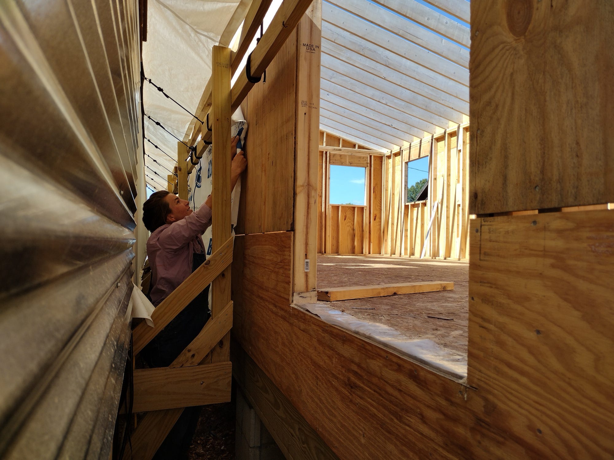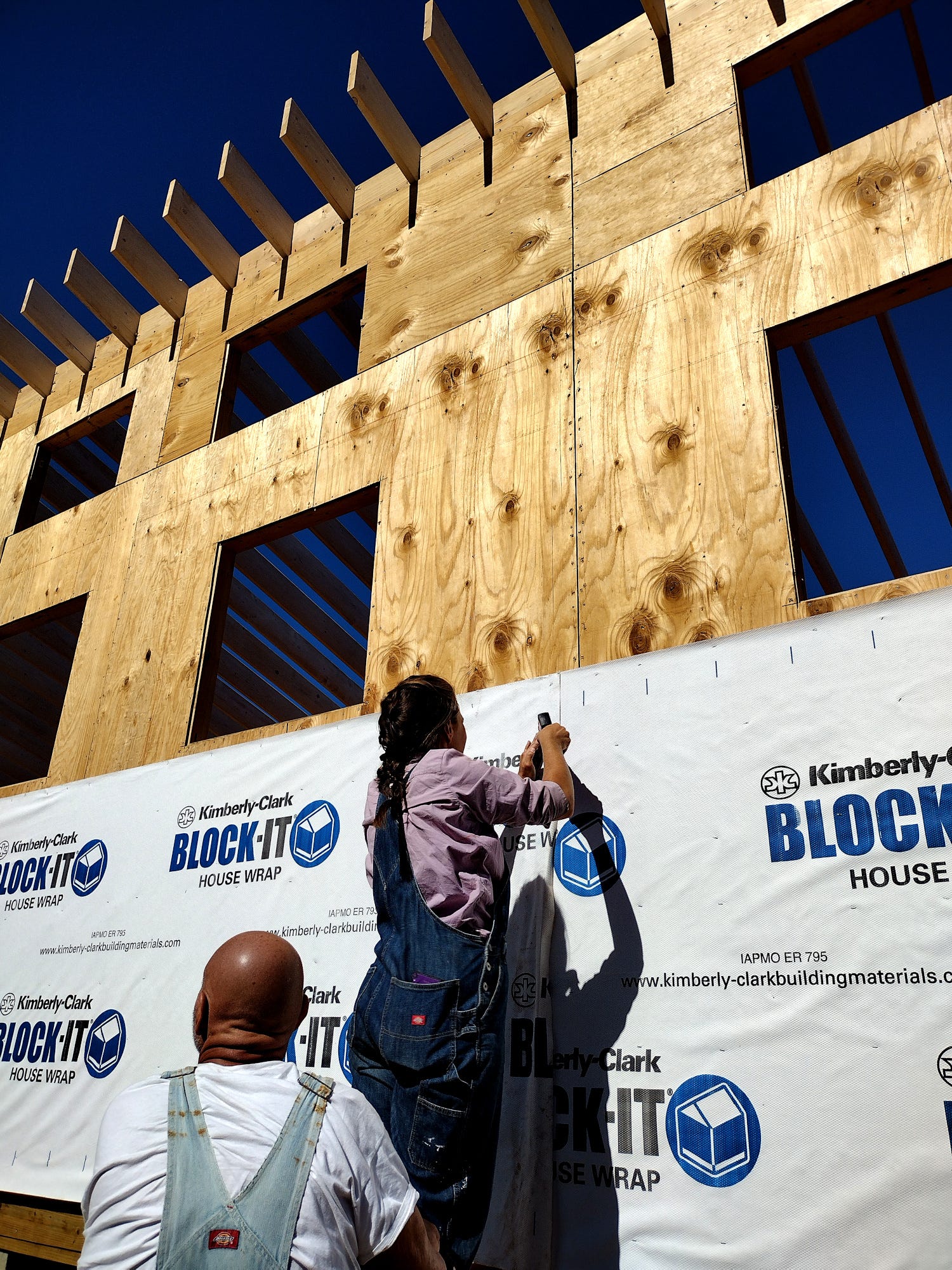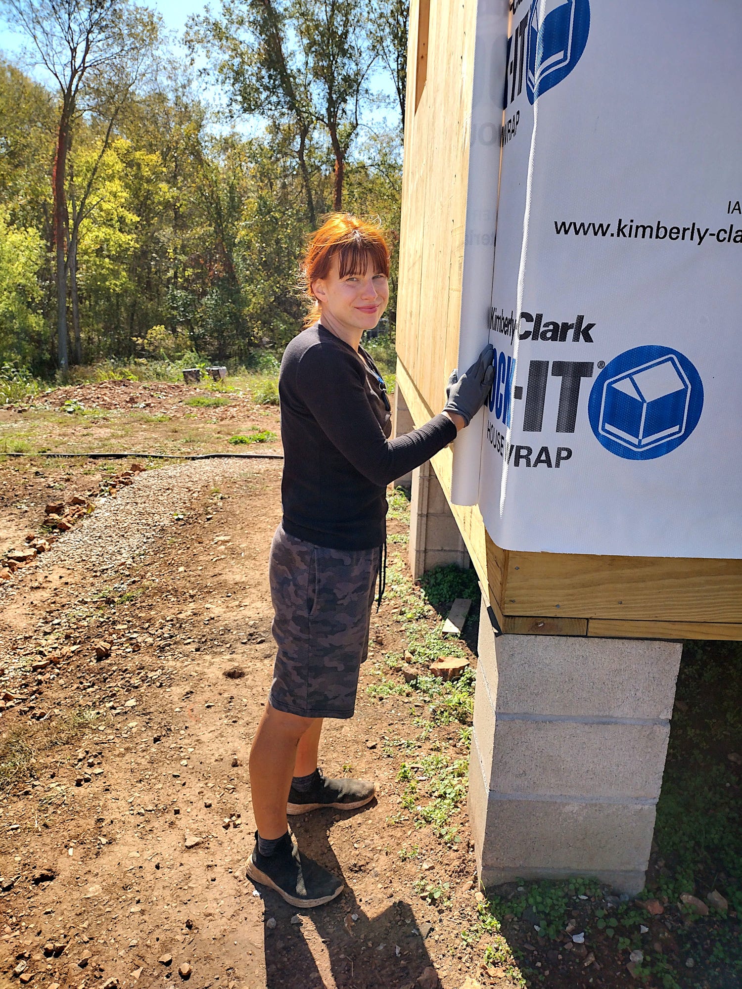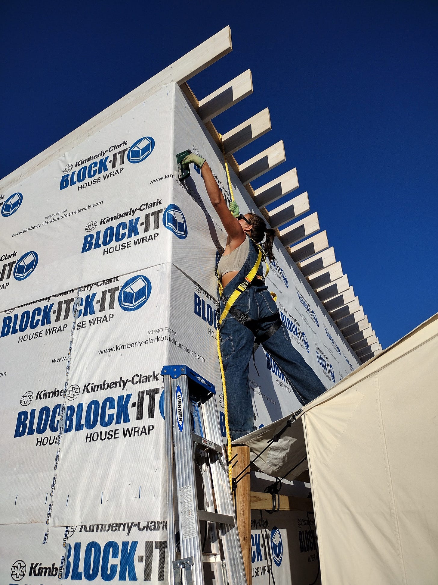 On Thursday, we hit the ground running again. Our dad helped all of us ladies work on installing the house wrap. First, we did a detailed examination of the sheathing all over the house, looking for sections we had forgotten to nail properly. When we were ready to start with the wrapping, we decided to cut our 10-foot rolls in half to make them easier to work with. It was tricky to put up the wrap between the tent and the house, but we wrangled it in there. We had to quit working early to go to the dentist (a bunch of us had scheduled cleanings for the same afternoon), but we made a good start. We love the folks at Willard Family Dental, and we are thankful to have such a great clinic so close to home!