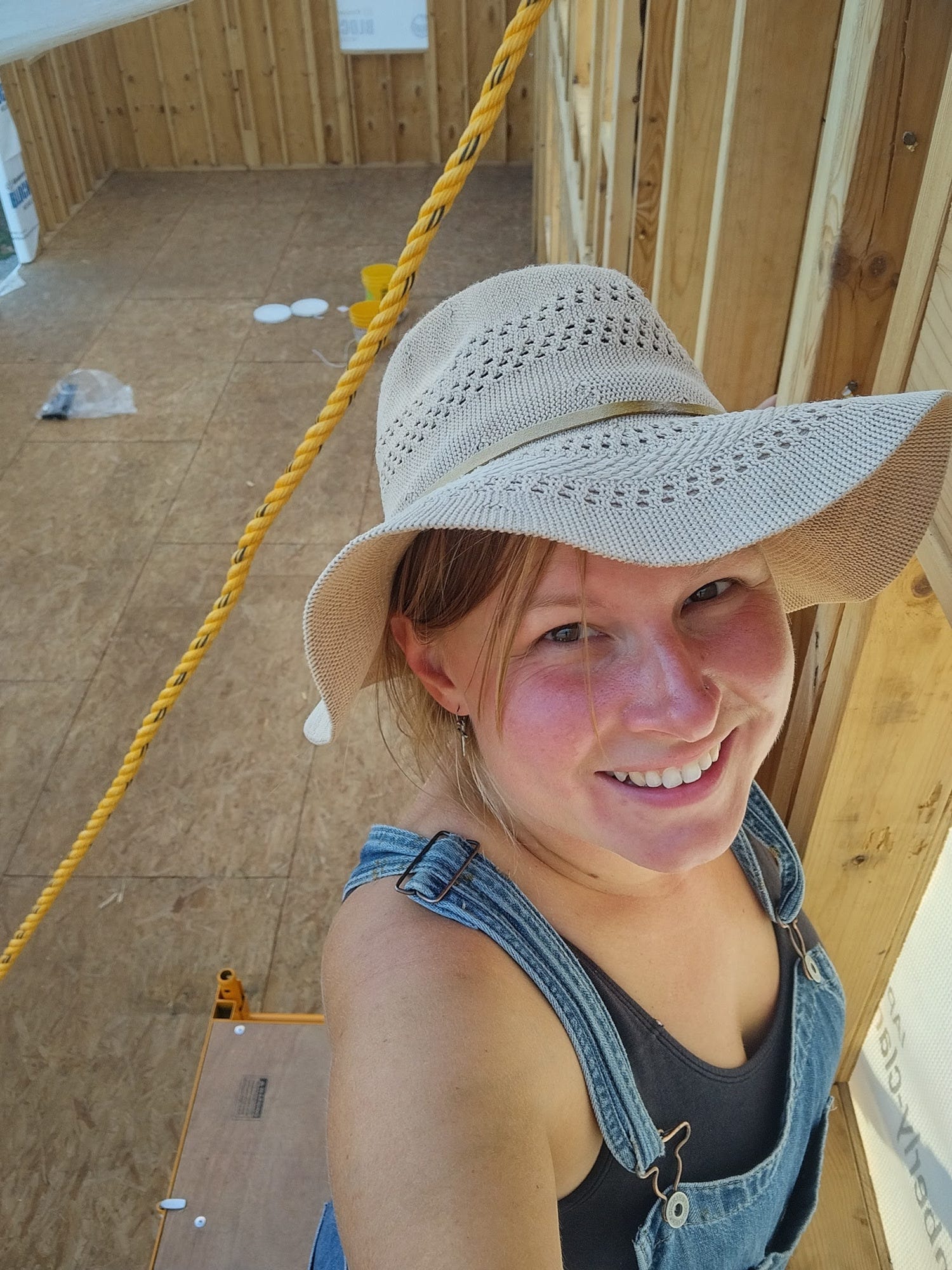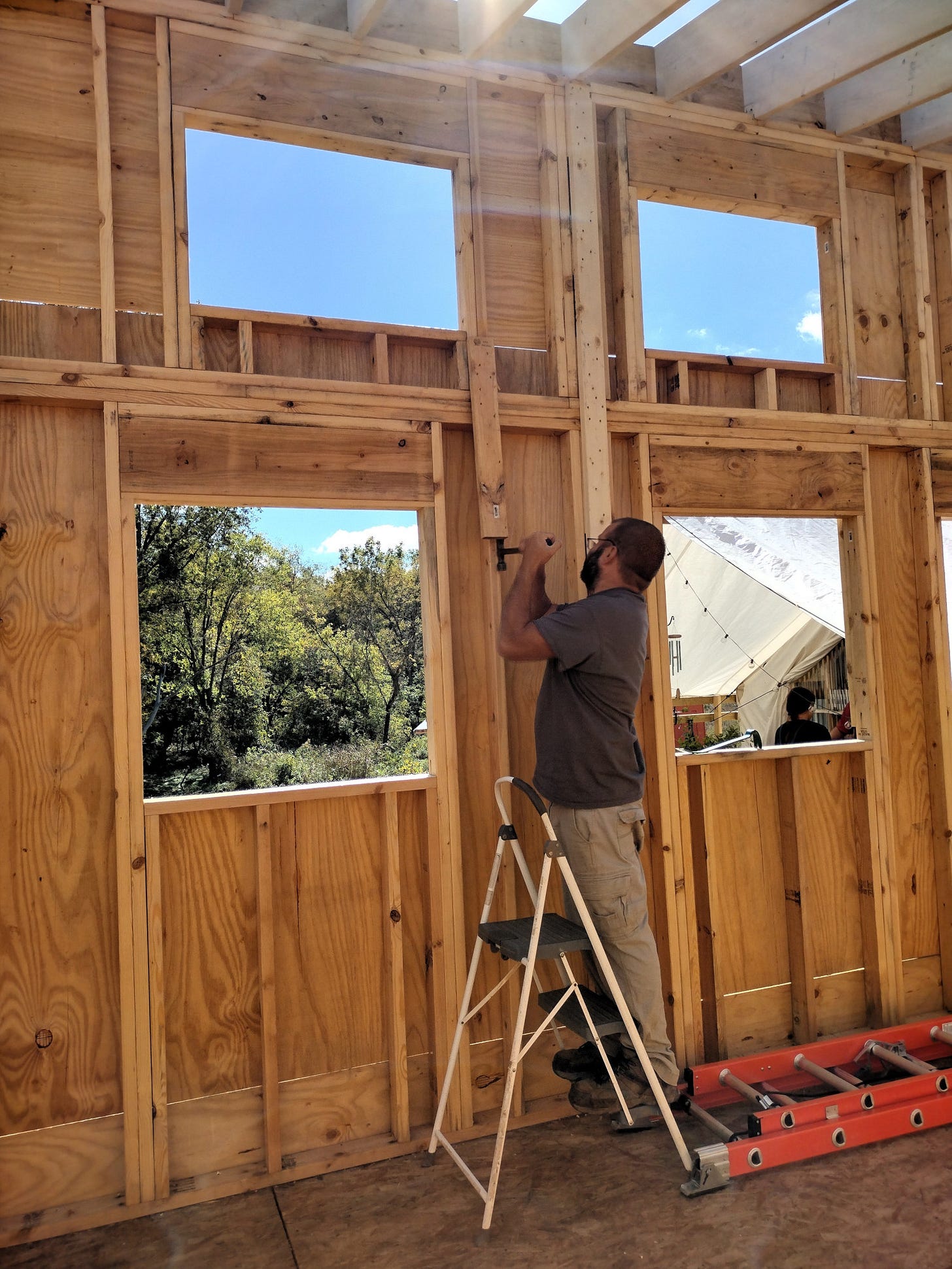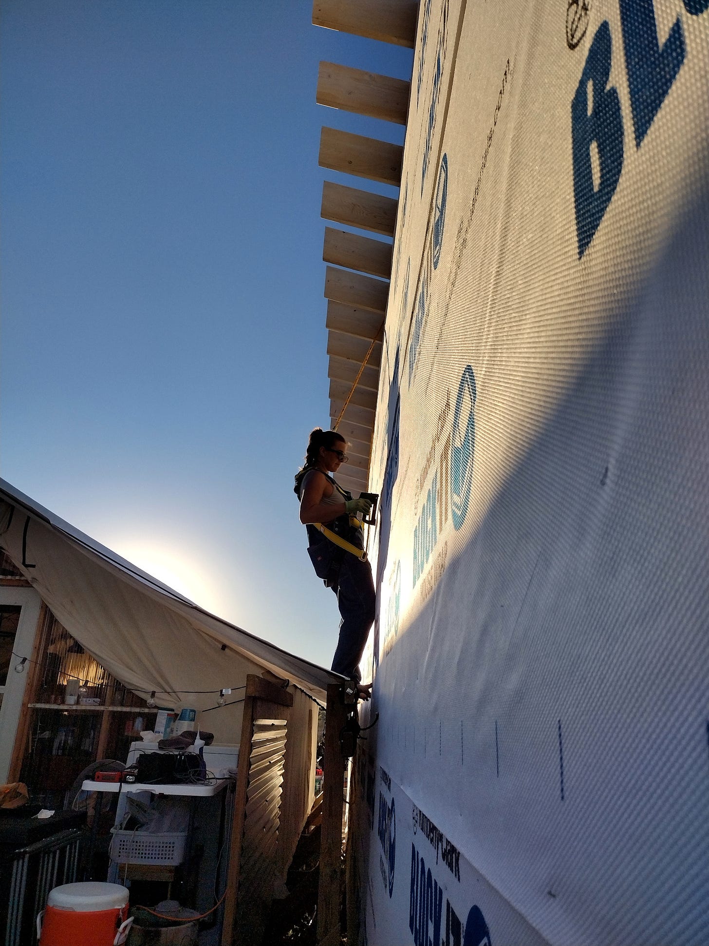 We had Levi home with us on Friday, and we finished the house wrap. I honestly wasn't sure we could even do it, as we had some crazy awkward areas to reach. It took a lot of team work and creativity, but we managed it. It was hot, and by afternoon we had all lost our coats and long-sleaved shirts. I hate heights, but I was prepared to do my part if necessary. Thankfully, Grace and Levi do much better than I do, and they spent most of the day up on a ladder or scaffolding. For the most difficult to reach places next to the tent, Grace put on the safety harness and worked her way along the wall balancing on the tent frame. Inside the bunkhouse, I finally took my turn on the scaffolding as I walked two different safety ropes down the wall for her. Grace made her balancing act look easy, clipping herself from one rope to the next as she stapled the house wrap in place.
