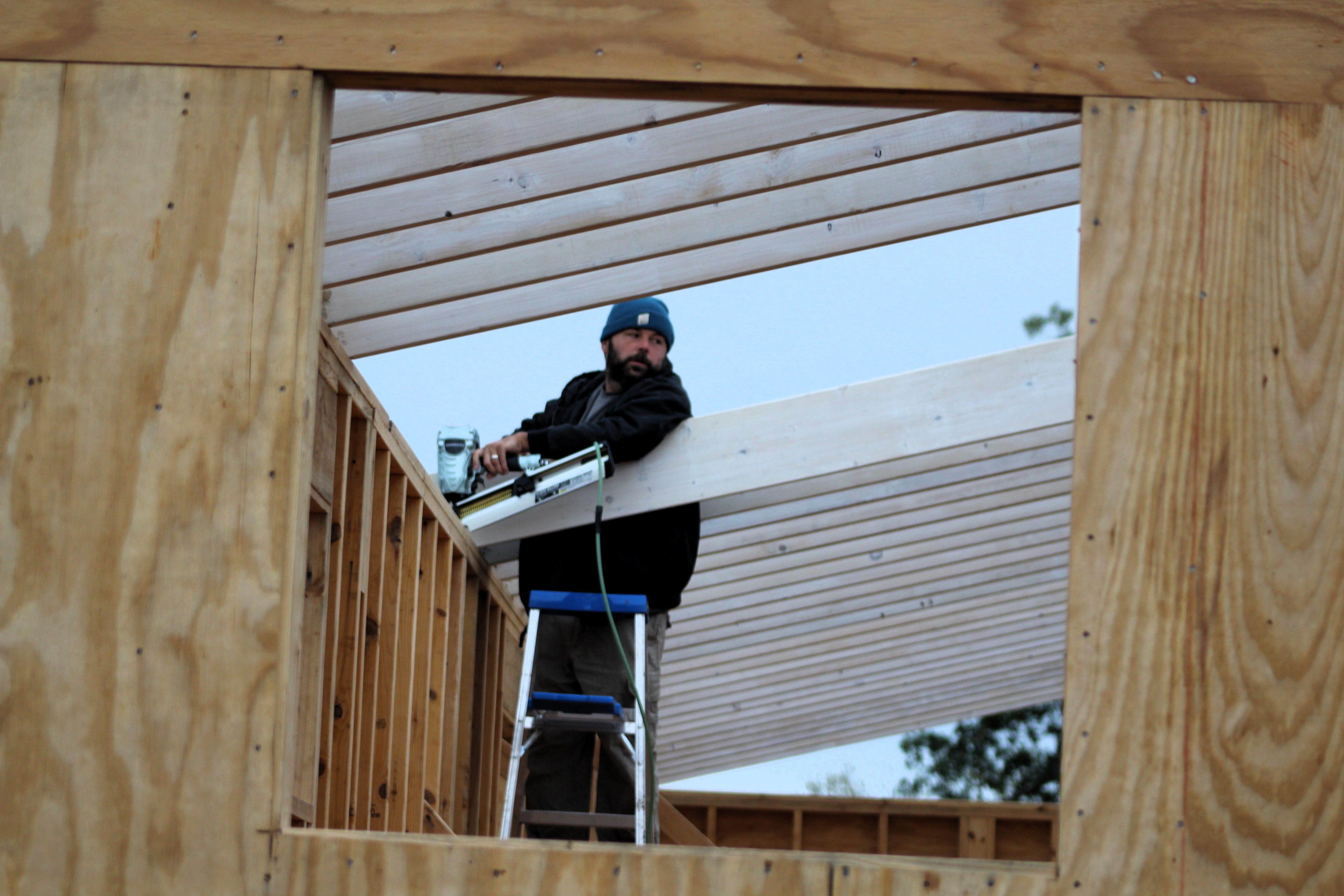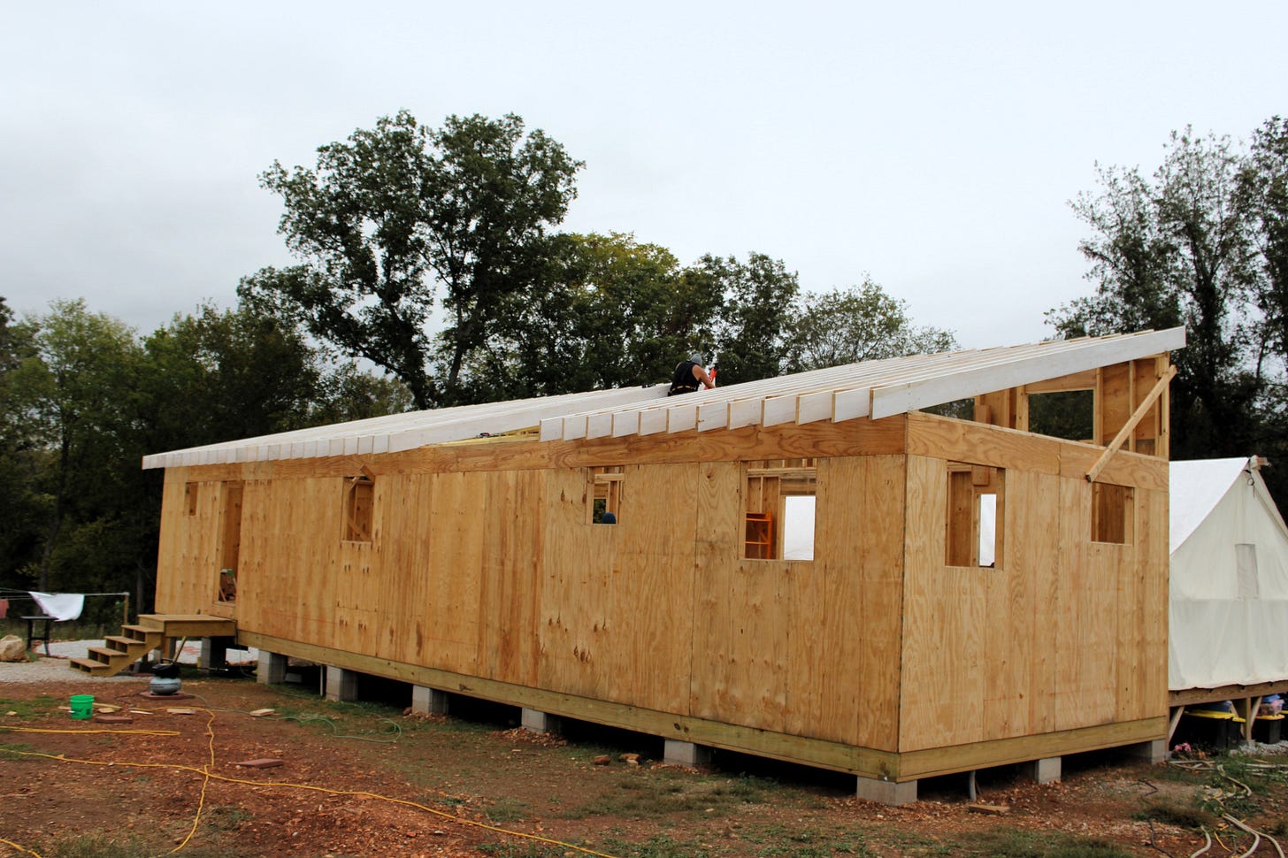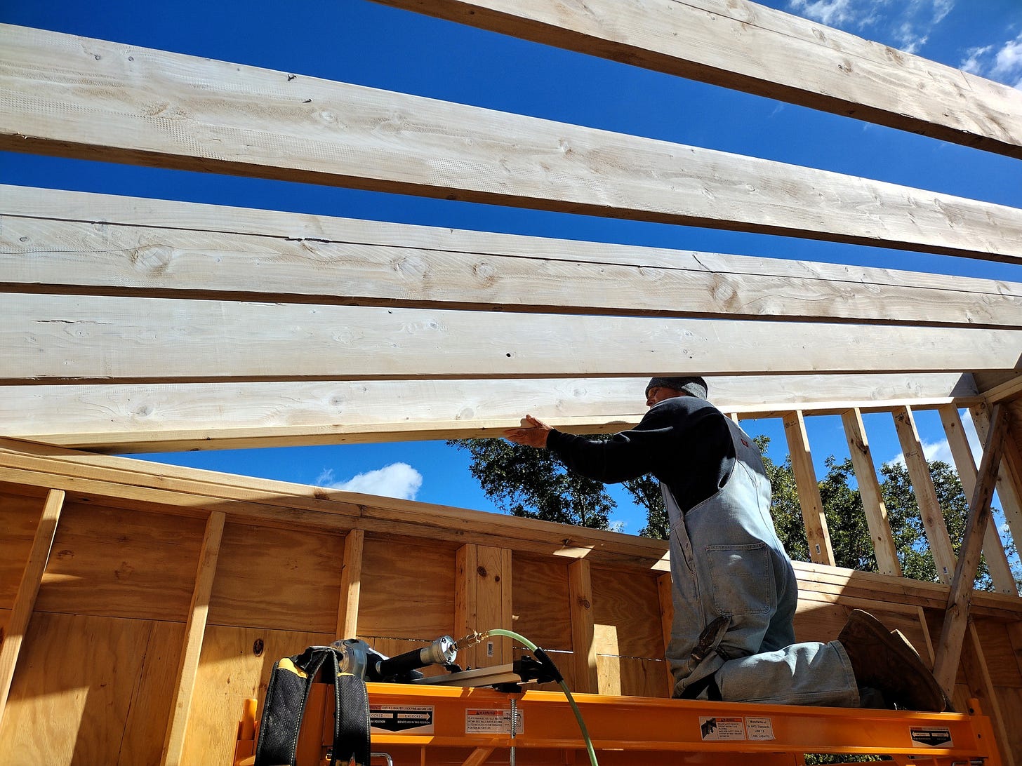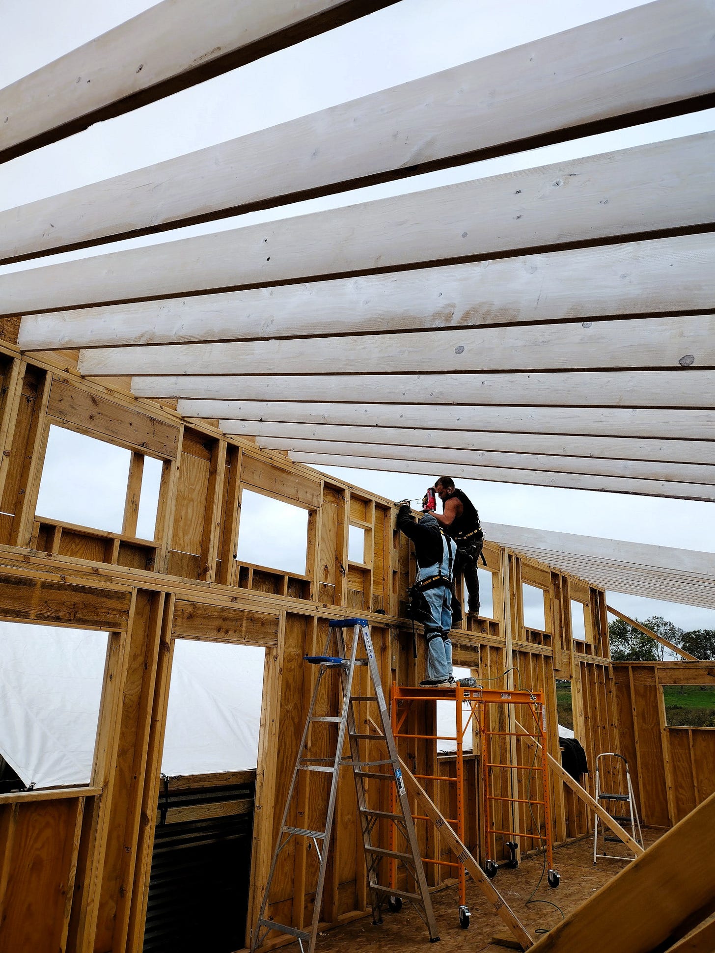 Looking ahead to next week, the forecast is calling for several rainy days. We really don't want to take any more water damage, so we are planning another push over the weekend to get the fascia, eaves, decking, and tarpaper on. We also need to trim three inches off of each rafter as (unfortunately) I missed calculated their length. If we can finish all of that, we will be dried-in. Rain will no longer wreak havoc on our build site, and it will no longer slow us down -- we will be able to work inside even in wet weather.