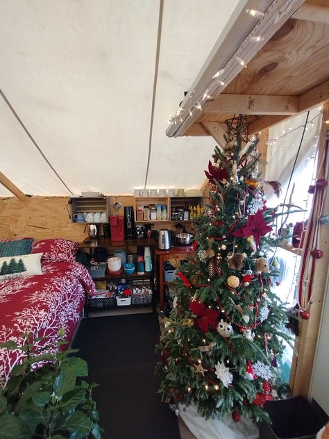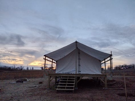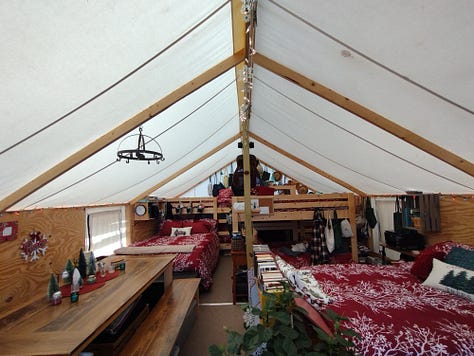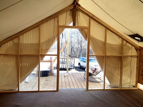 Our family spent two years in that tent, experiencing all four seasons — twice. Summer in particular had it’s challenges, as keeping the tent cool wasn’t always possible. And the occasional winter storm could be a bit chilly, though we stayed warm enough with our wood stove and propane heater. Spring and autumn in the tent were sublime, though. I loved the cool quiet mornings with bird song so close that it felt like sleeping outside. I loved the owls, crickets, and cicadas in the evenings. I adored all the natural light that filtered through the entire white canvas roof. And there is absolutely nothing as cozy as a tent with a roaring fire in its woodstove.