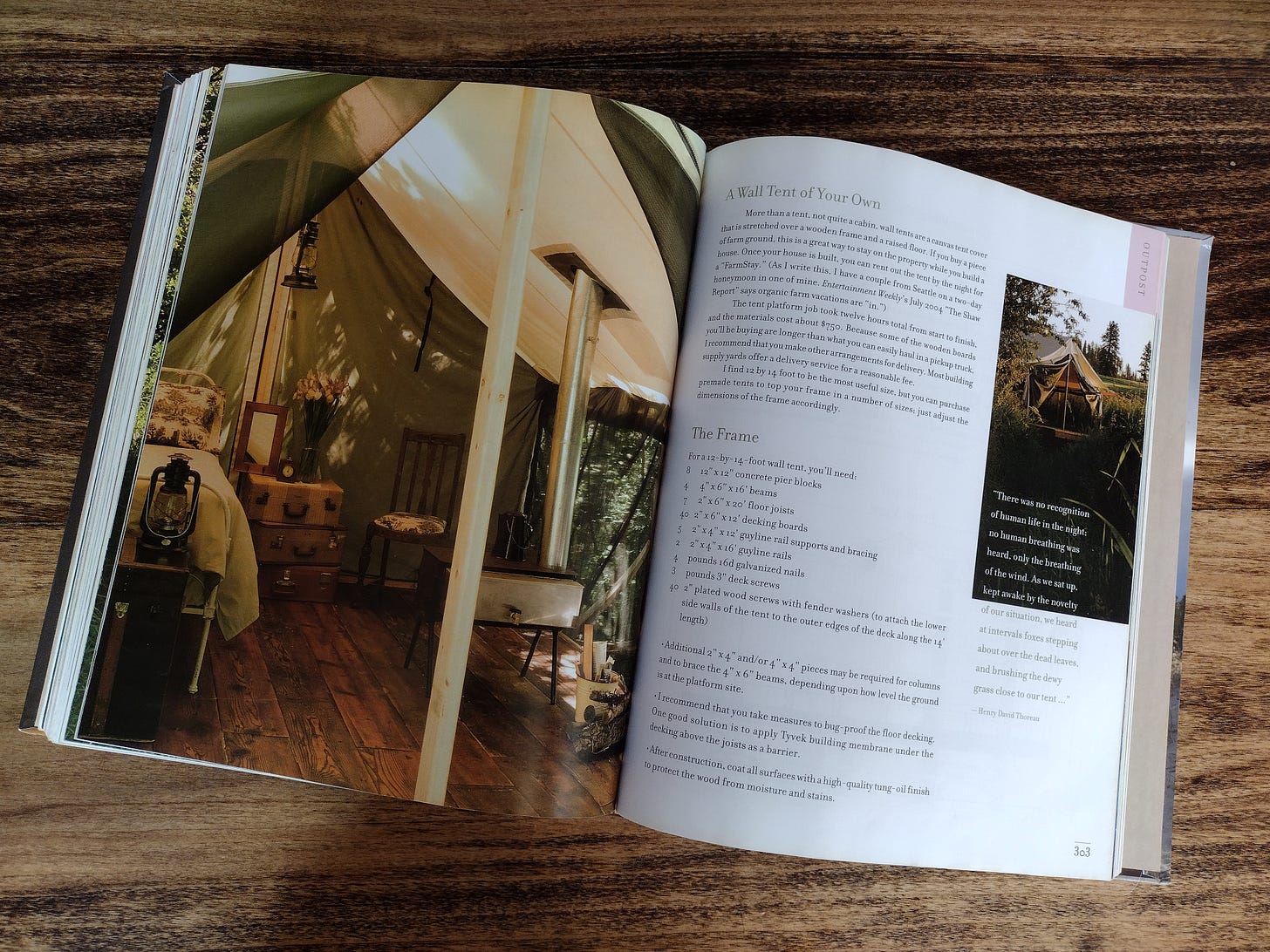 Living in our wall tent was one of the best, most adventurous seasons of my life. I’ll never forget the anticipation and excitement of getting it set up. I had dreamed of living in a wall tent since I was a teen. As a young adult, I remember pouring over Mary Jane’s Ideabook, Cookbook, Lifebook, admiring the glamping style tent in the Outpost section.