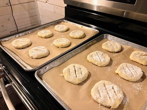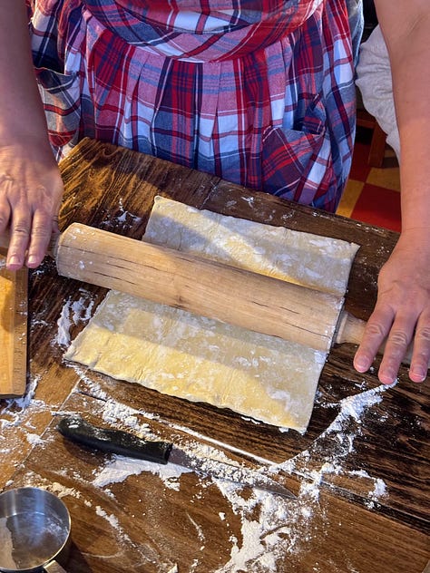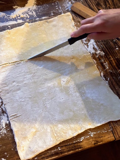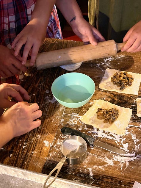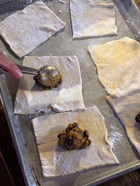 We rolled out puff pastry and filled it with spiced raisins and butter, listening while we worked to the melodic sound of rain falling on our metal roof. Banbury cakes (sometimes called Banbury tarts) are a traditional autumn treat in parts of England, and they have become associated with St. Luke’s feast day over time. The pastries couldn’t have been more perfect for this year’s delightfully rainy autumn day — filling the house with the sweet aroma of spices while they baked.