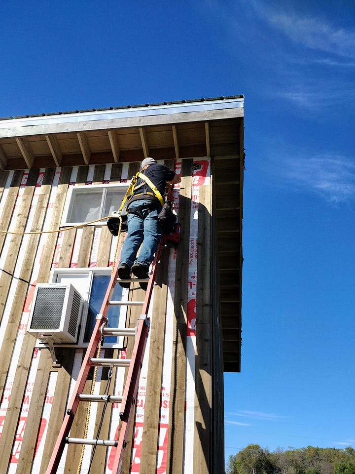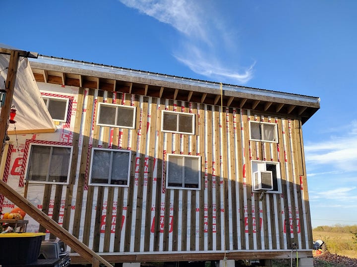 In the afternoons, we made progress on our exterior siding. We’ve been working on the tall side of the bunkhouse, which is time consuming since it is the highest off of the ground and requires the most ladder work. Jeremiah does all the climbing, while we sisters hold the ladder and cut boards for him. On Thursday, our dad climbed up to work on installing a flood light.