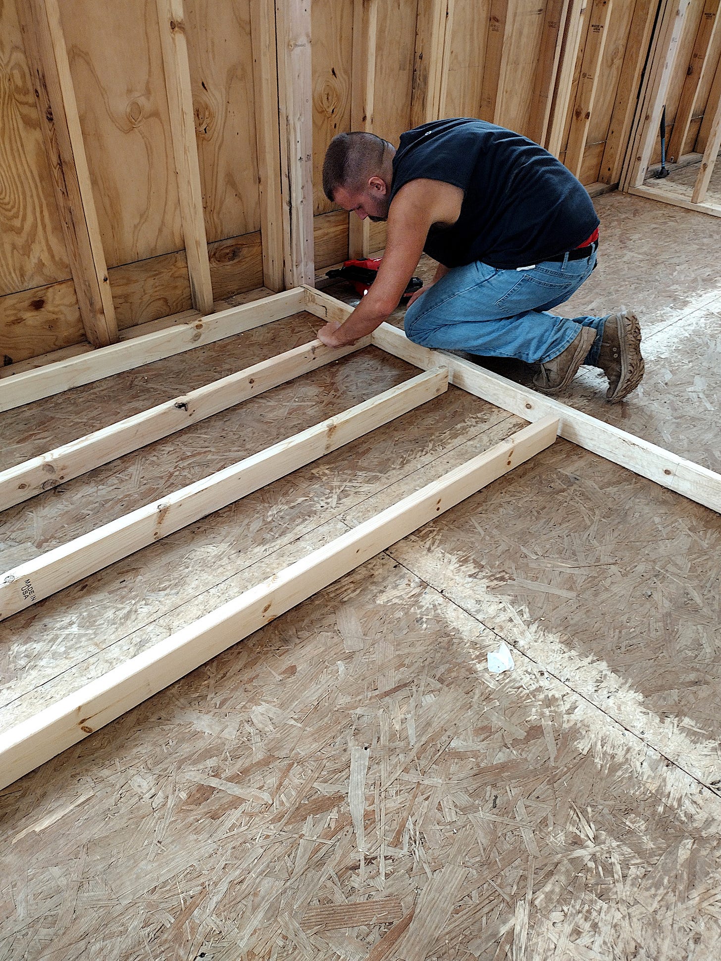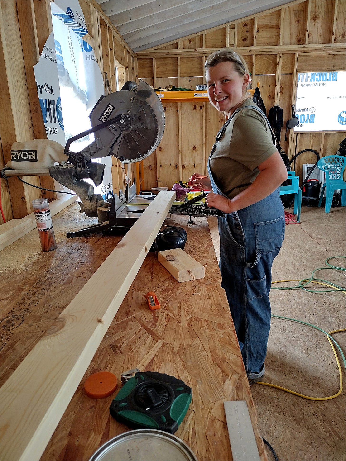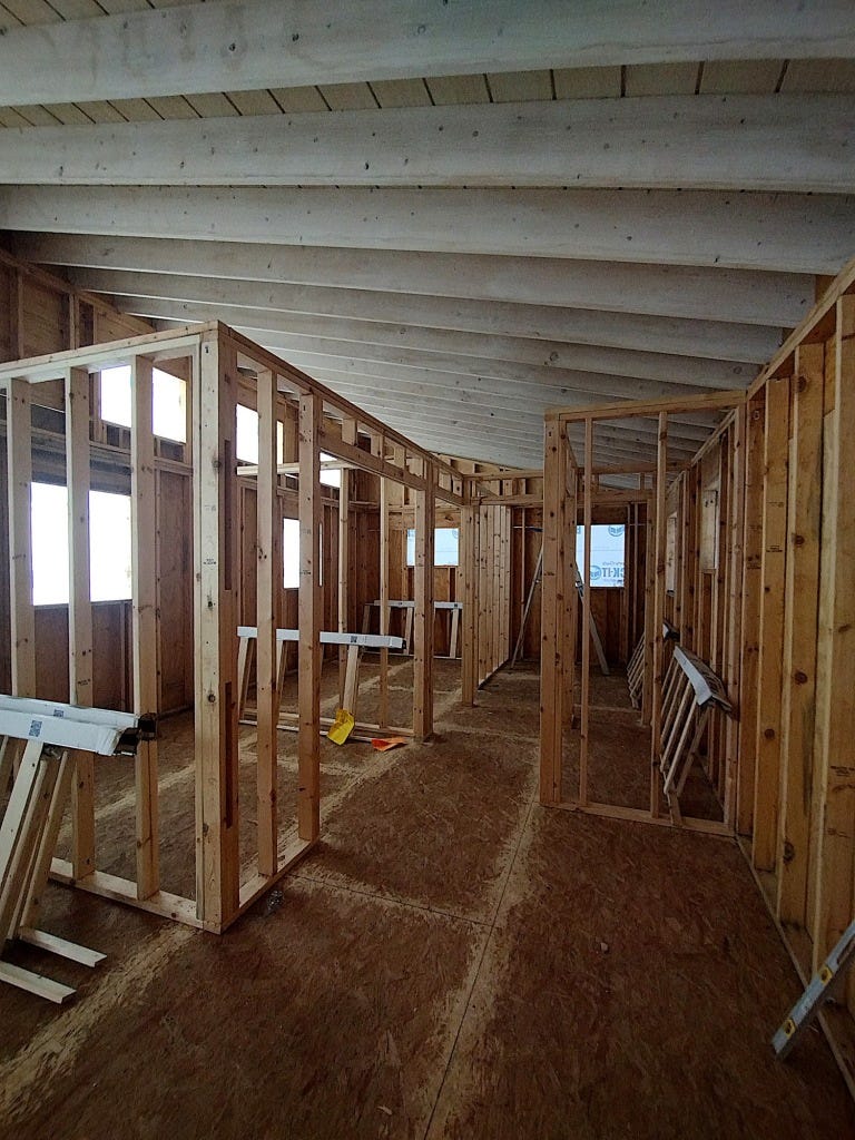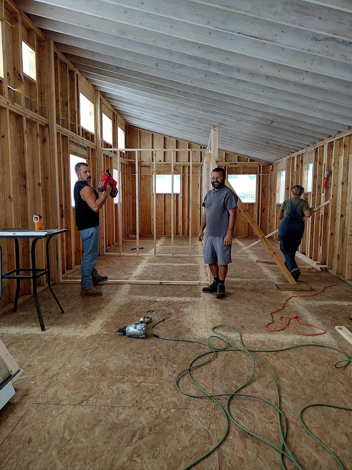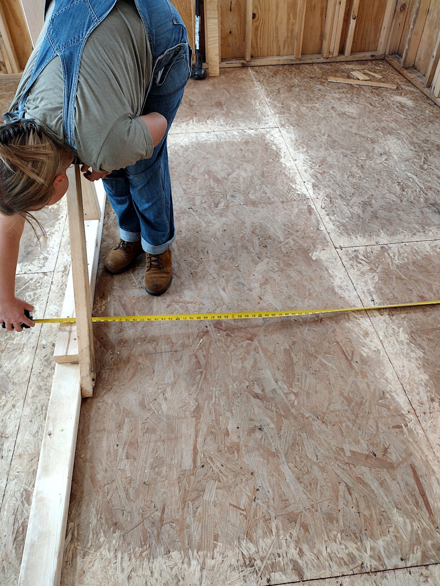 One day, Grace and I prepped for putting up more walls. Grace worked on sanding the water damage off of the floor while I cut jack studs, headers, and Ts for the rest of the interior walls. We had fun and got a lot done. We had a small mishap when poor Grace actually sucked the belt-sander cord into the machine. She thought she had broken it, but Jeremiah was able to repair the cord, and we were back to work in no time.