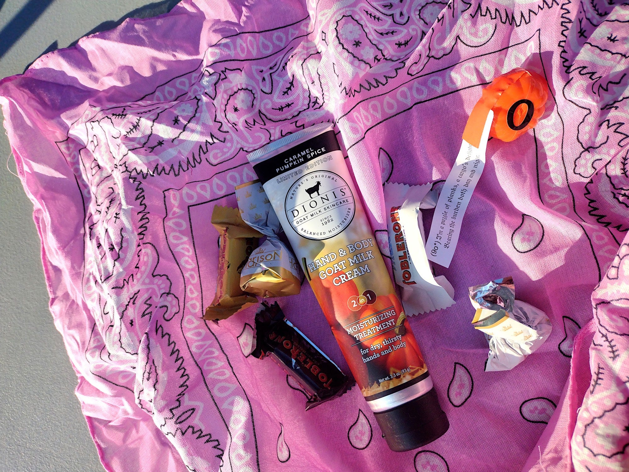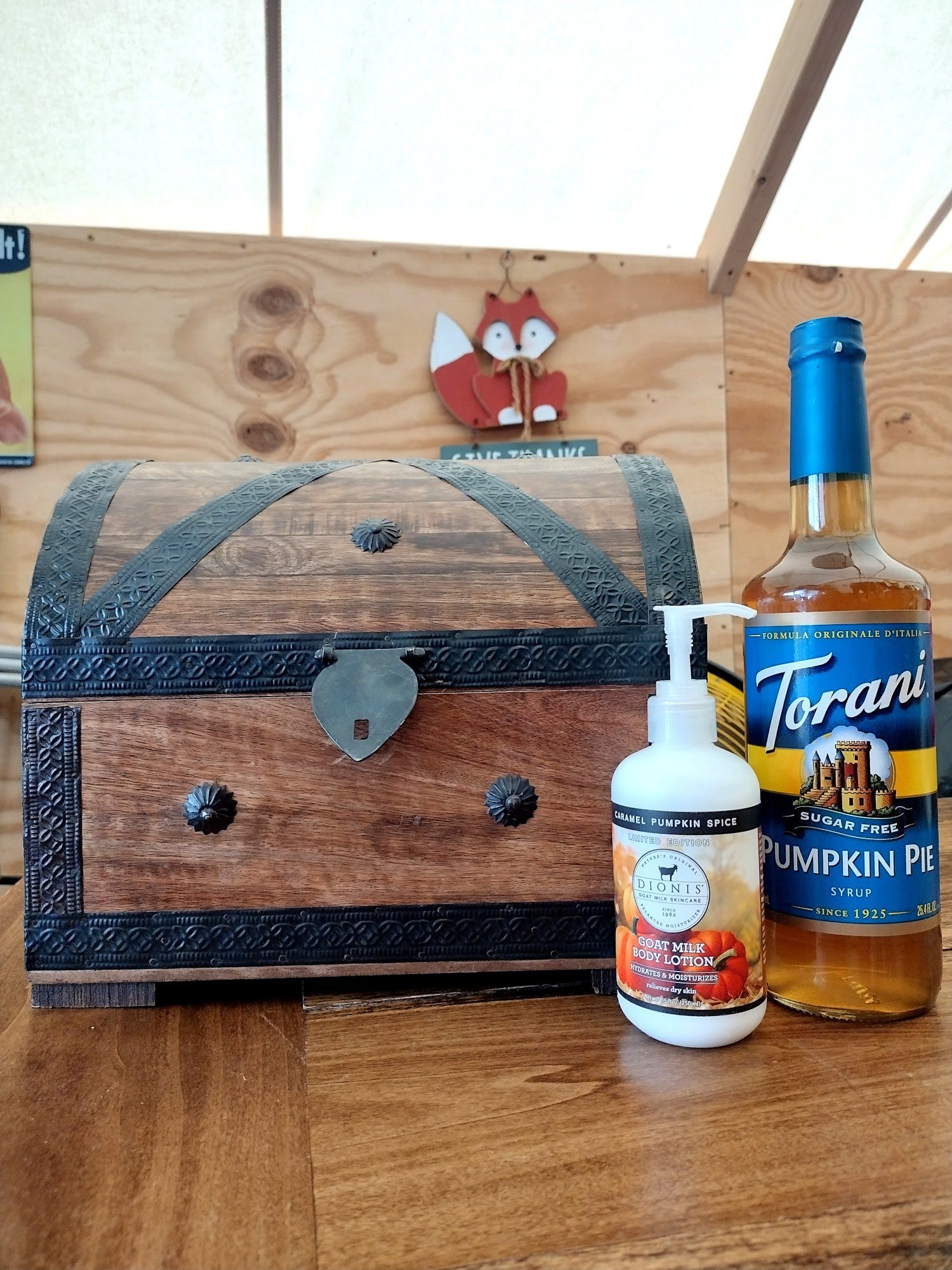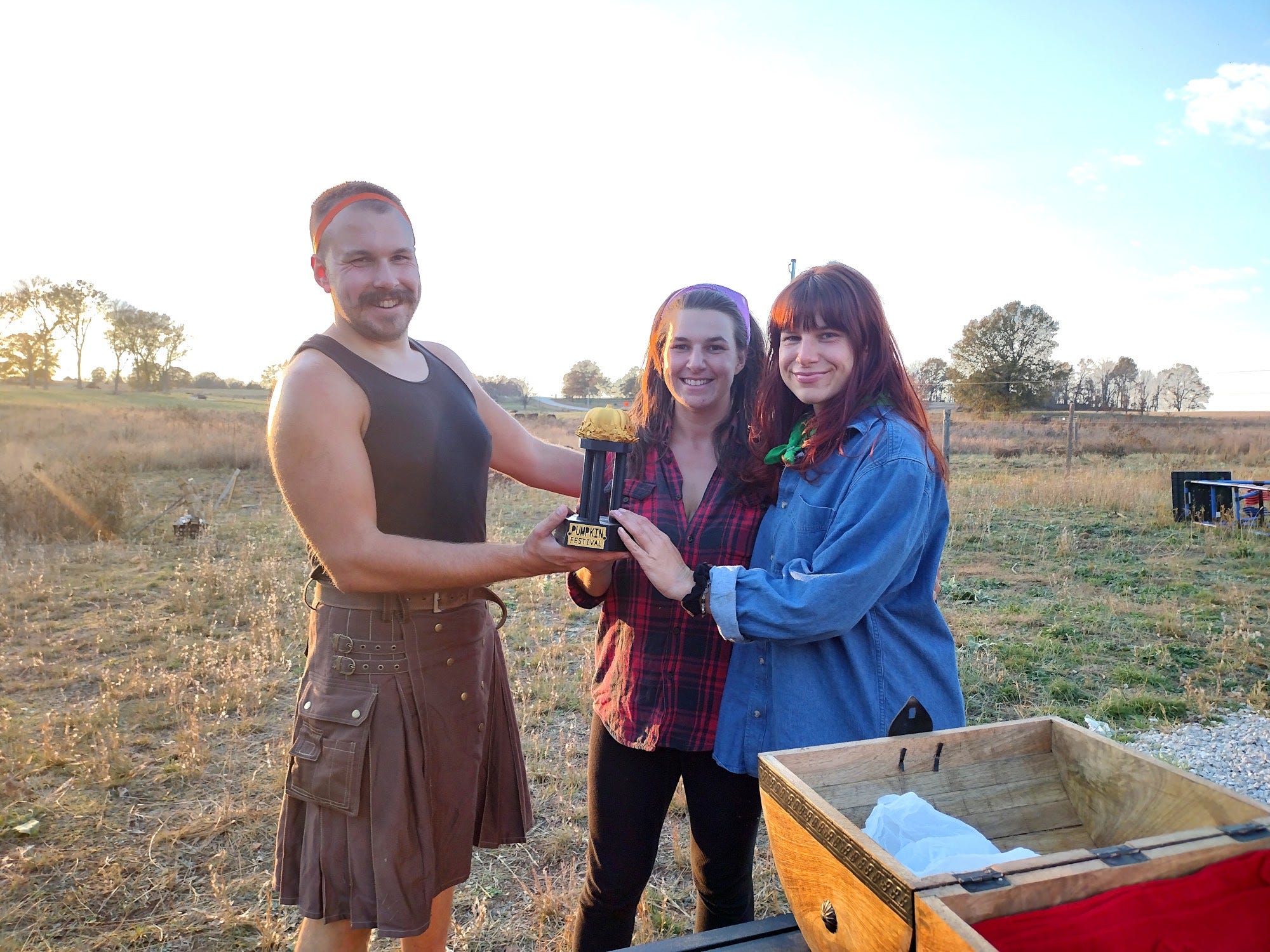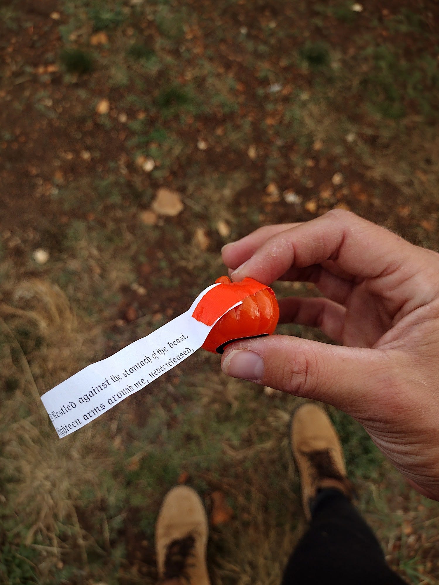 My mom organized a treasure hunt for the kids -- something she started doing when we were young. And our youngest brother Jeremiah organized a Survivor challenge-style treasure hunt for the grown-ups, complete with buffs, clues, prizes, and impossible riddles. He teamed us up to make it more fun (and doable). This year, Bonnie-Jean and Grace were the victors, as they found all their mini-pumpkins first, unscrambled the phrase on the back, and used the phrase to discover the number to open the treasure chest. Jeremiah presented them with a trophy he made to memorialize each year's winner.