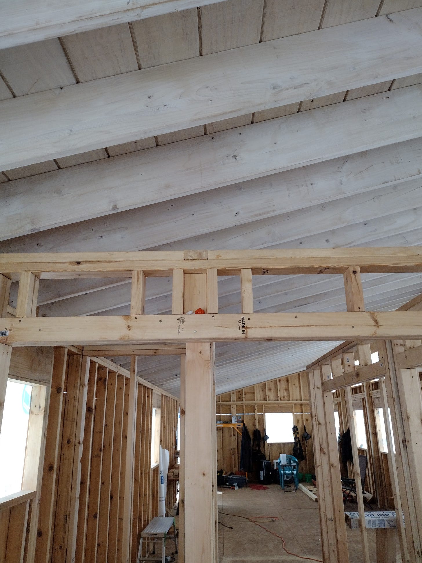 On Saturday, we got about half our interior walls up -- well, at least 8-feet up. The rake portion we will finish as we find time. Our brothers Levi and Jeremiah made quick work of raising the walls while I worked ahead of them, cutting lumber and marking layout.