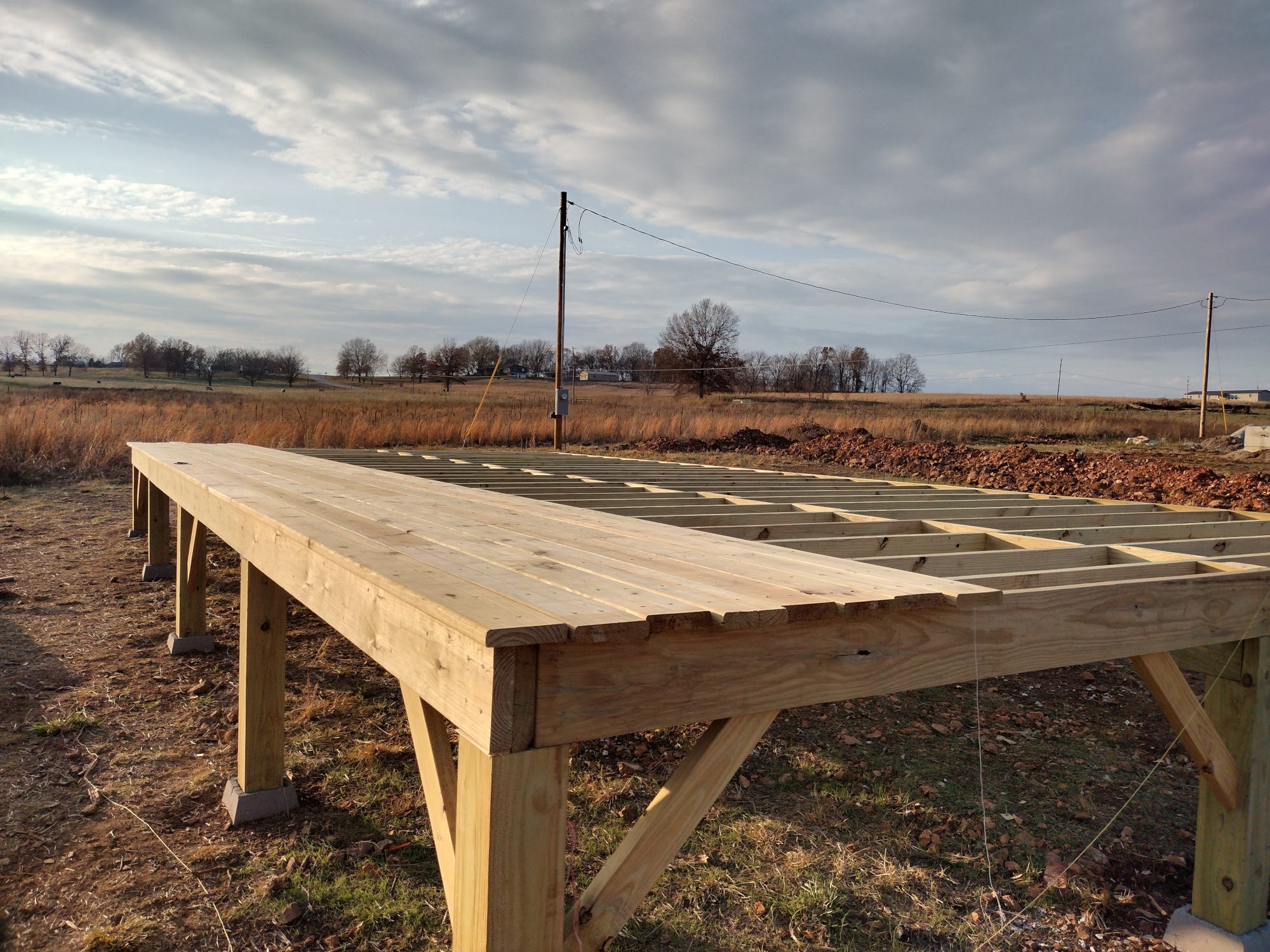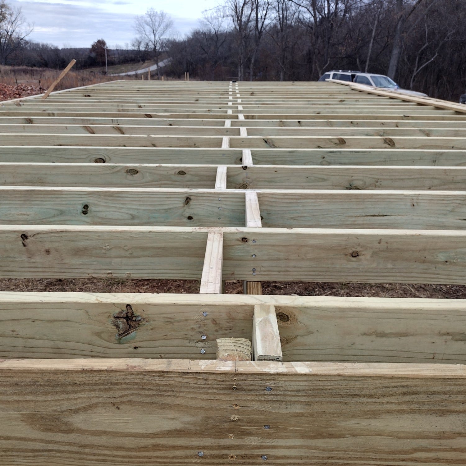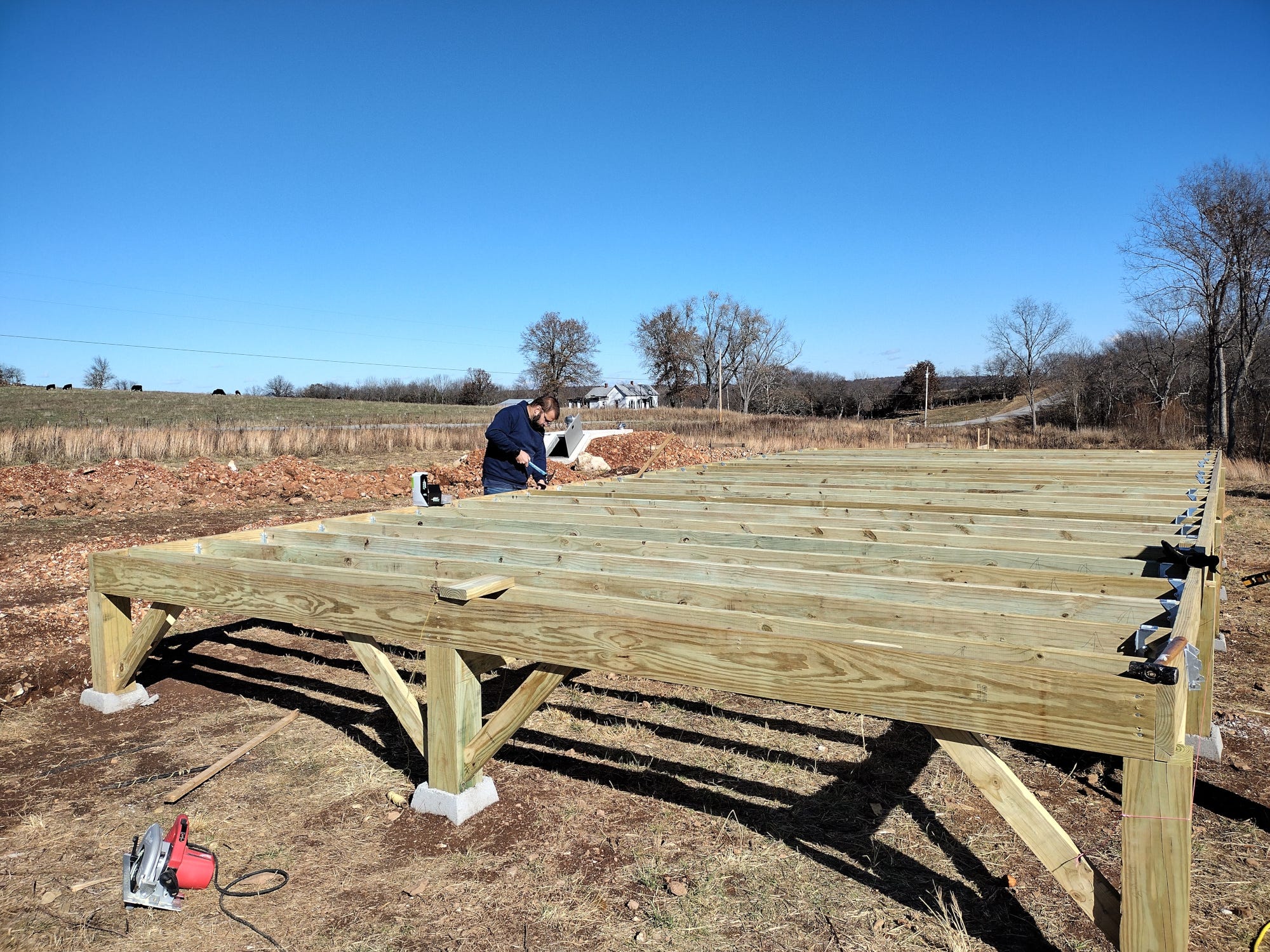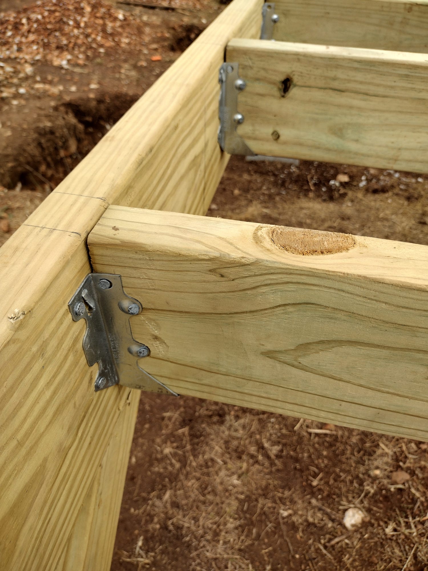 We are still working on our deck. We finished hanging our joists on Saturday. Both our brothers were off work, so the whole family worked together, and we made a lot of progress.