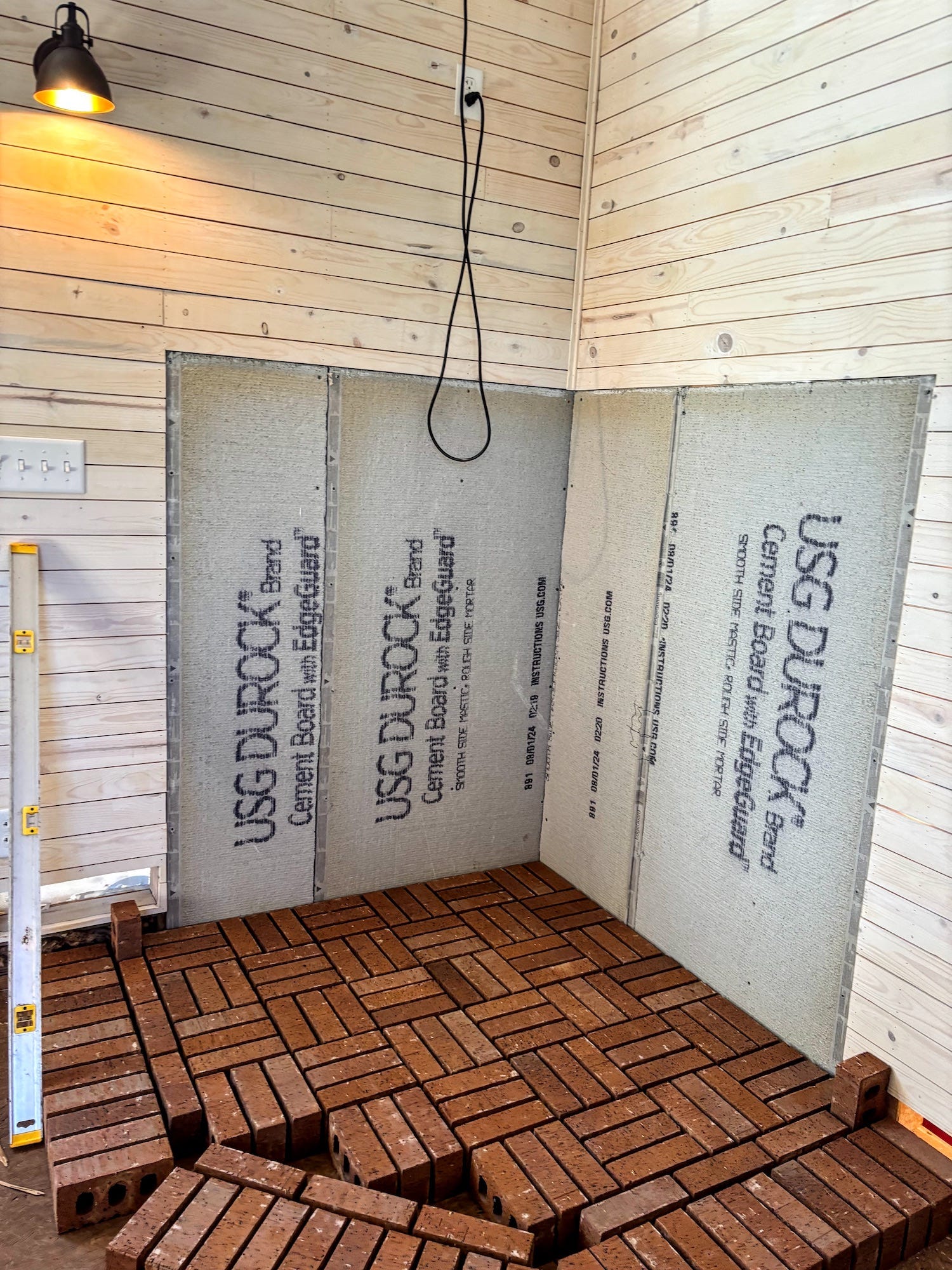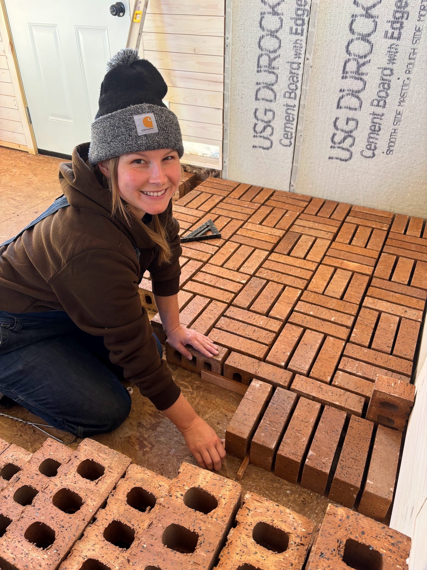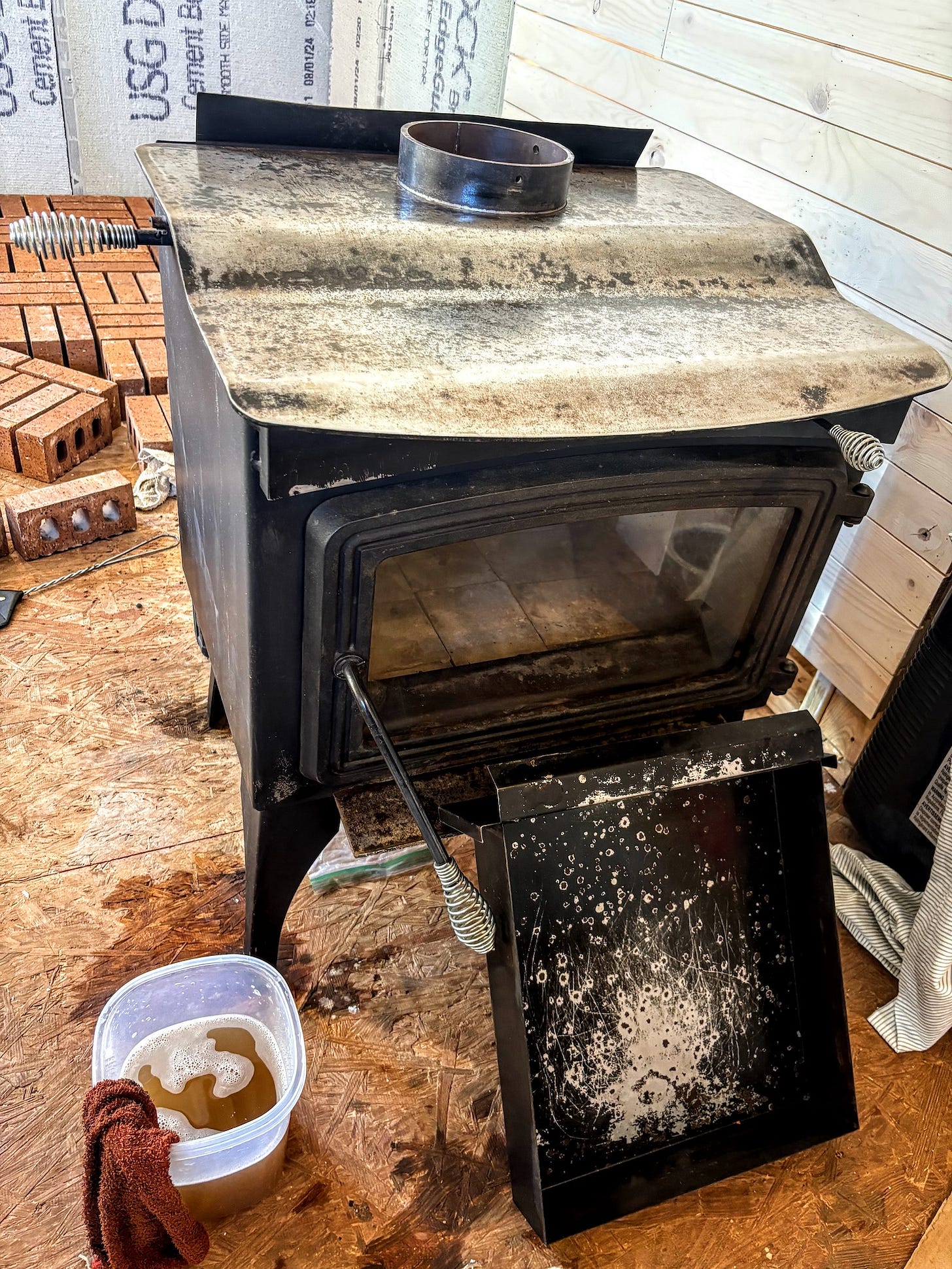 We worked on some trim in the living room, and Grace did some cosmetic caulking. Dad installed a light, which is making the living area positively bright in the evenings. We also worked on our hearth. I laid out all of our brick in a hearth mock-up, so we could decide exactly how we wanted it to look. While I played with bricks, Grace scrubbed down the woodstove, first with water, and then with vinegar. Levi had sanded most of the rust off, so we hoped the vinegar would take care of the rest. Unfortunately, we still think some rust remover will be necessary before we can paint the stove.