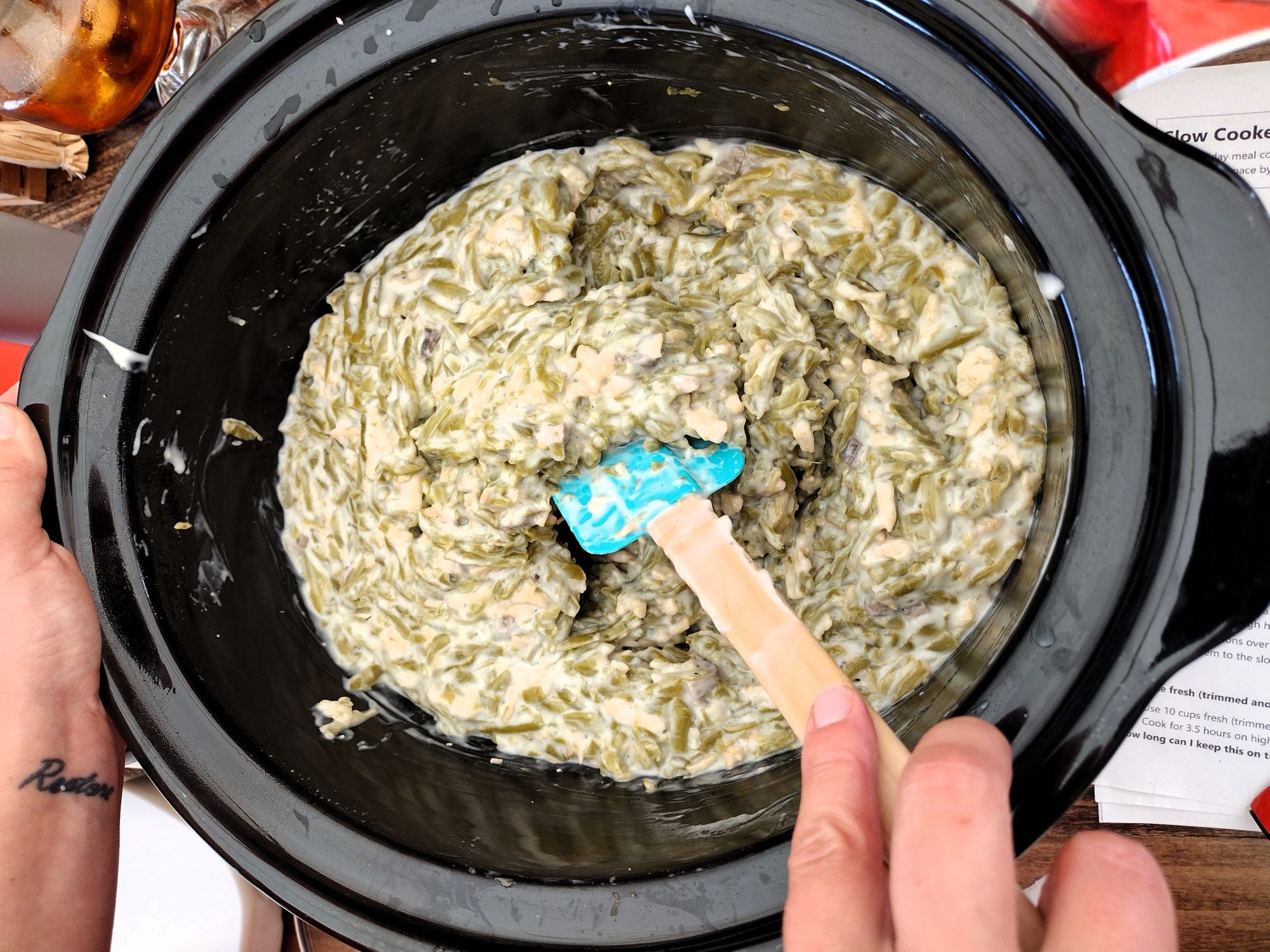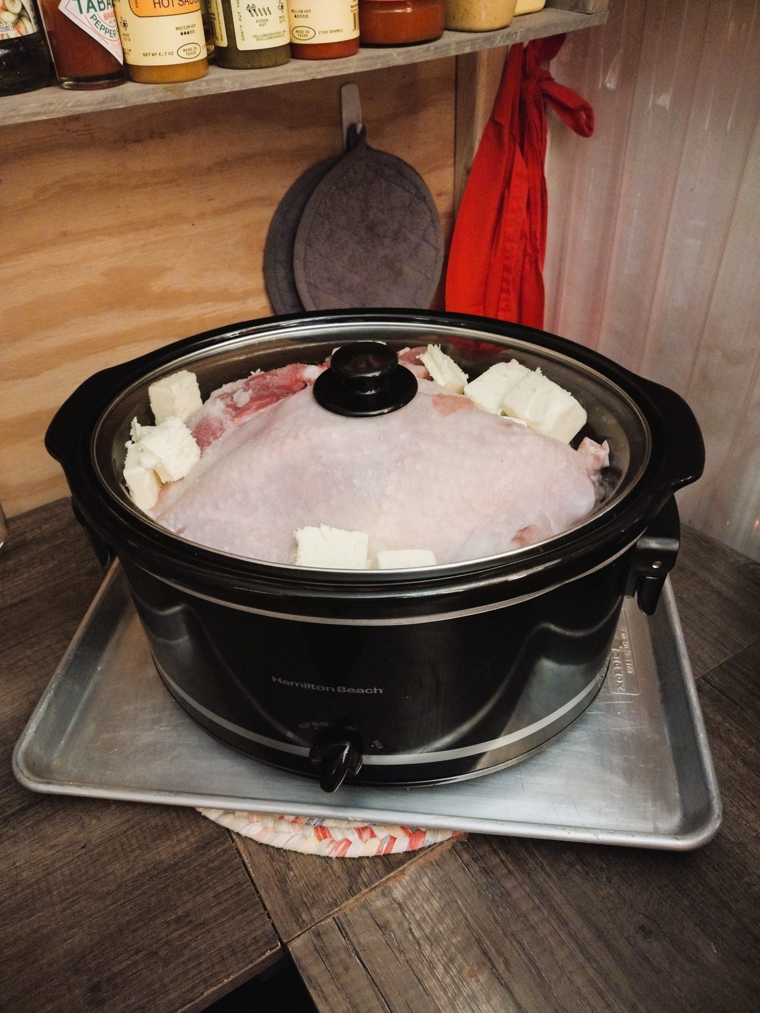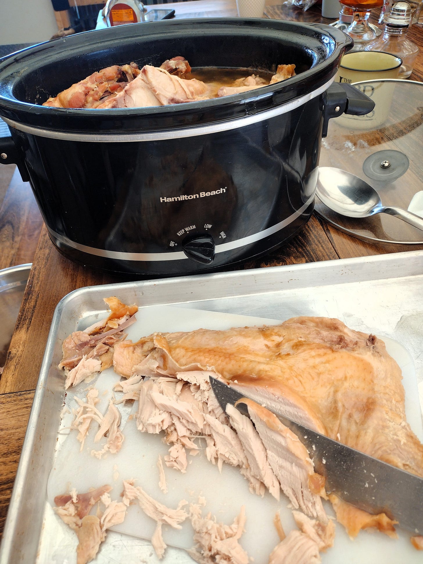 We planned to deep fry the turkey. About a month ago, we purchased a 30-quart fryer. We loved the idea of cooking our turkey this way, and we looked forward to using the big pot for soup and maybe even a batch of hard cider. I started to unbox the fryer on Wednesday, only to realize that the directions said you could not fry a turkey in our set up. We had accidentally bought a huge crawfish boiling and fish fry (in an included smaller pot) set. While many of the components of a turkey fryer were there, it did not have certain safety features necessary for heating a huge pot of oil. We didn't have time to replace the fryer, so we scrambled to figure out what to do with the 12-pound turkey we had already thawed out. We considered grilling it or frying it in small batches, but ultimately we opted to put the whole thing in our 8-quart slow cooker.