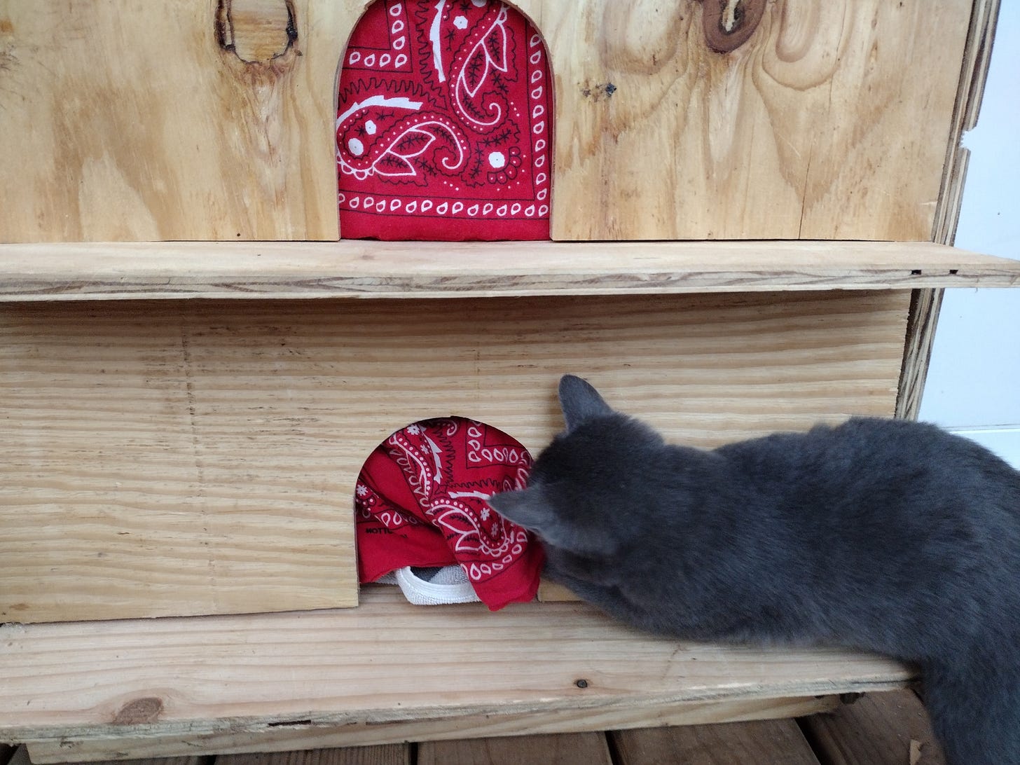 Grace found some time to build a cat tower. The stray kittens that joined our homestead have stayed, even though their mama hasn't been here for a couple weeks. We found out that the stray cats also spend time at a neighboring farm, and the mama cat has been there for awhile now. It appears she purposefully left the kittens here. We decided to call the cats Tolkien-themed names -- the gray kitten Gandalf the Gray and the black kitten Arwen. There is also a gray and white cat (whom the kids have been calling Galadriel) that spends most of her time at our place, though she won't let us get too close to her. She typically sleeps with the kittens and will sometimes call them into the woods to, ostensibly, go hunting. After talking to our neighbor, we believe she is the older sister of the kittens. I had no idea cats would move around in extended family groups, but I guess they do.