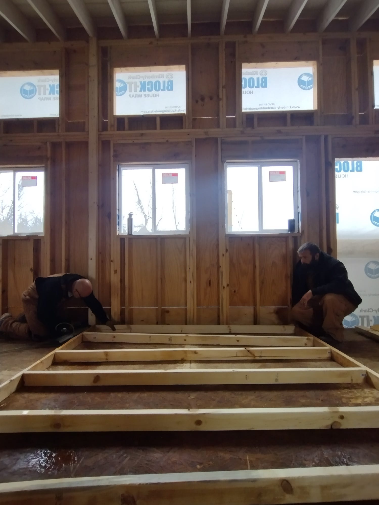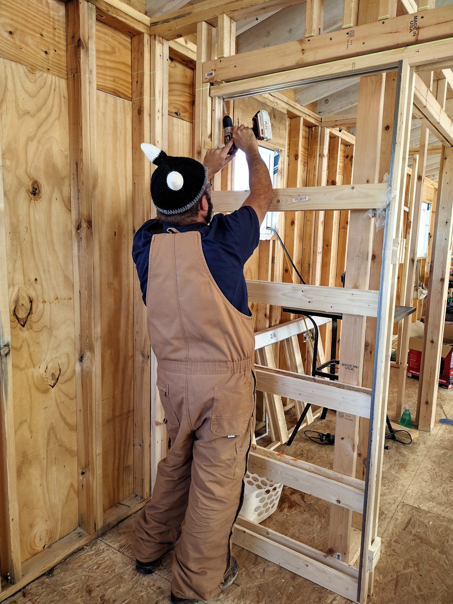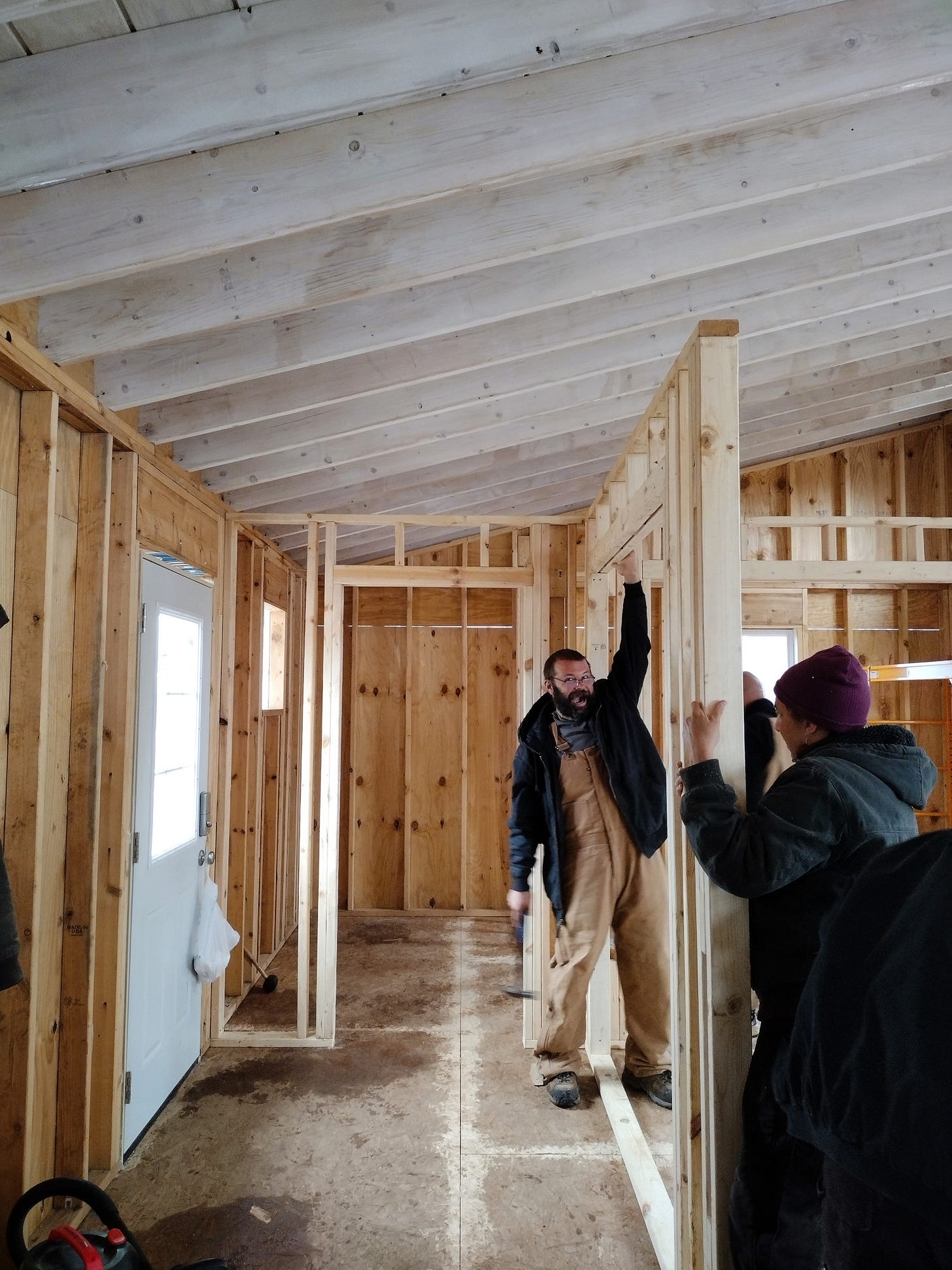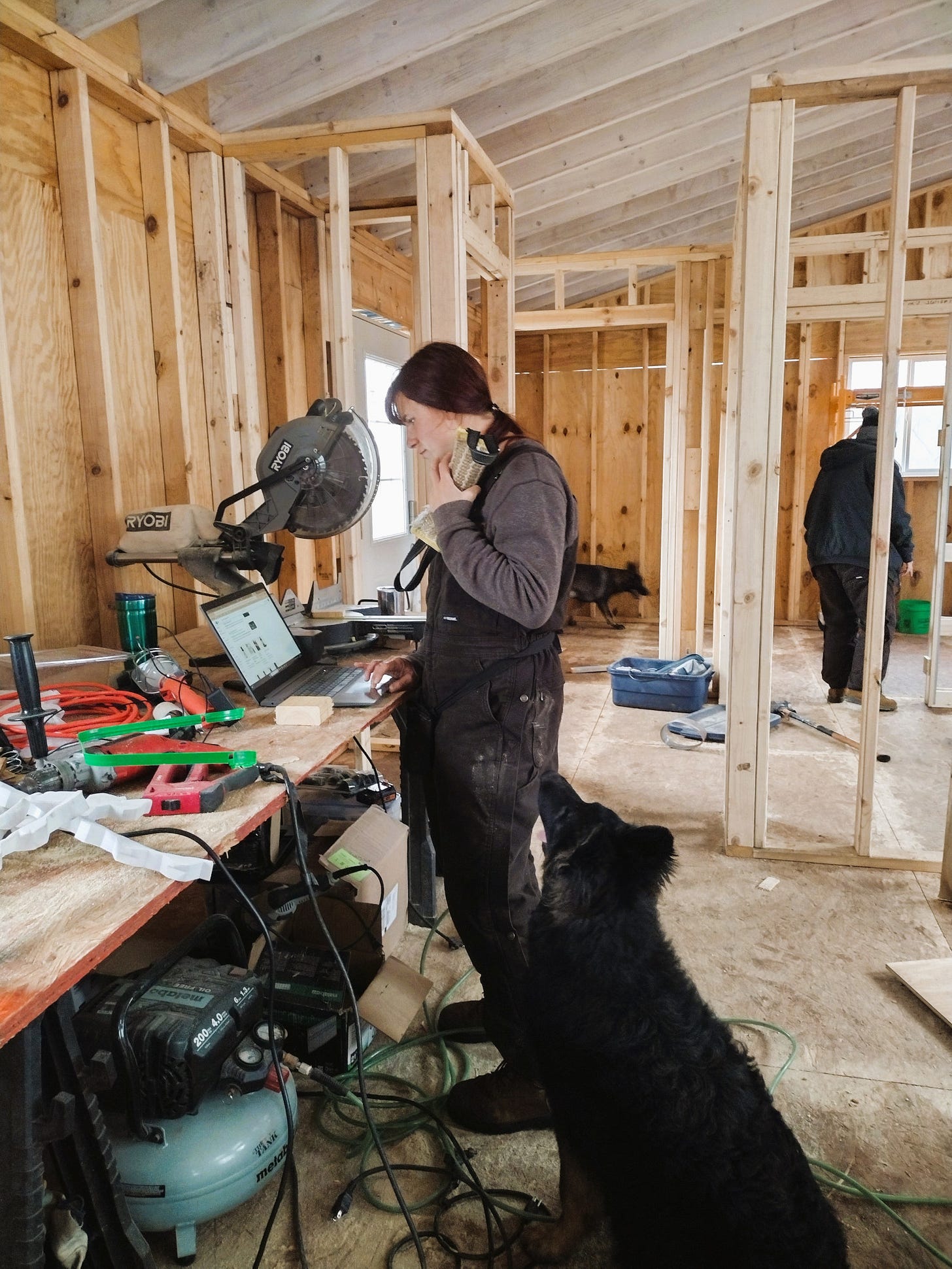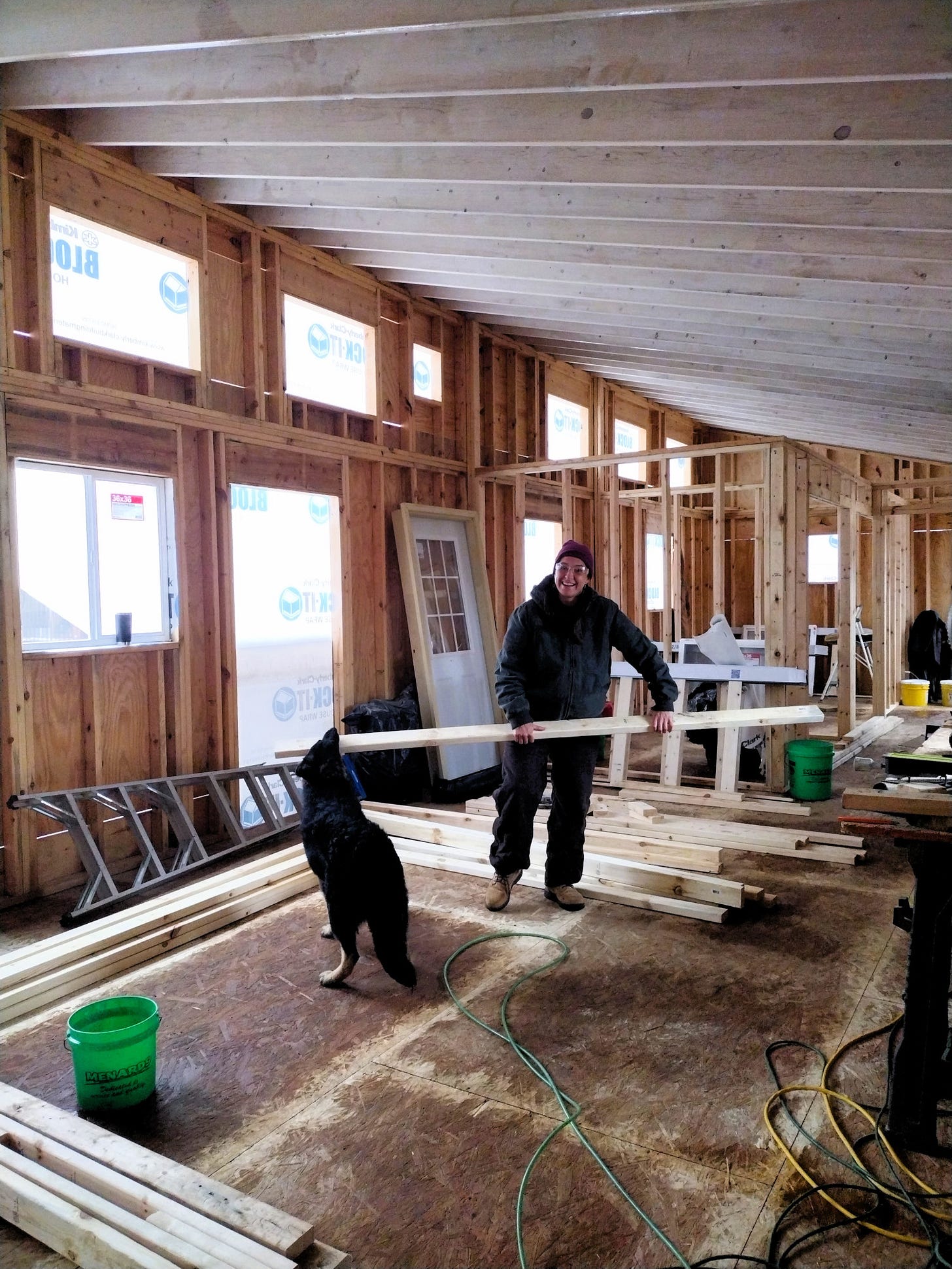 We worked on the house during the first part of the week. It was cold with rain some days, but we stayed warm and mostly dry working inside. We warded off the chill using a propane Big Buddy heater. We put up the rest of our interior walls (the bottom 8-feet of them anyway) and we installed most of our pocket door frames. We still need to finish extending the walls to the vaulted ceiling, but it feels good to see the floor plan in place. Due to the weather, we had Dagger and Tilde in the house with us for several hours most days -- and that kept things interesting, to say the least.