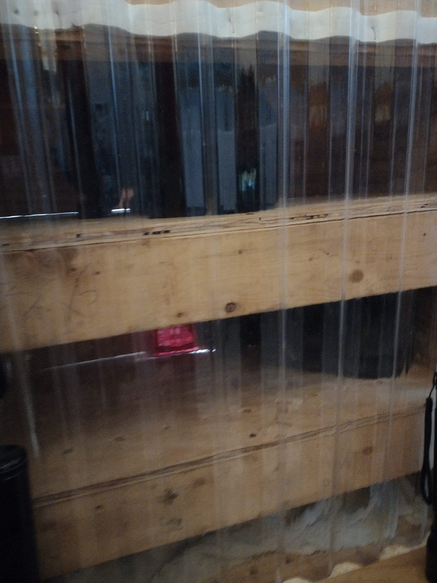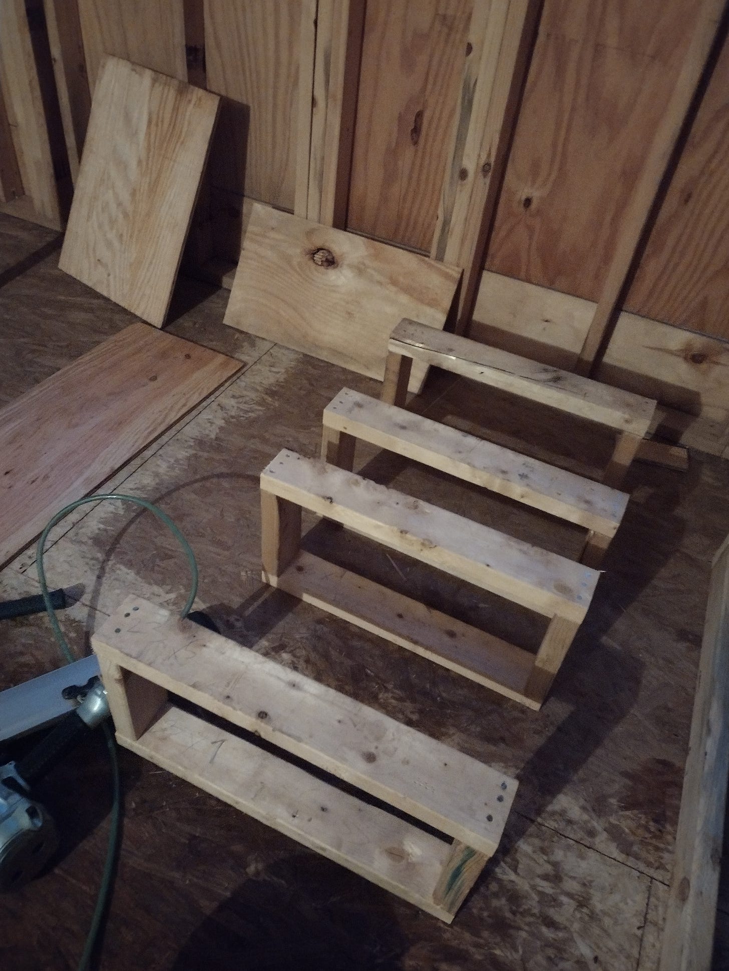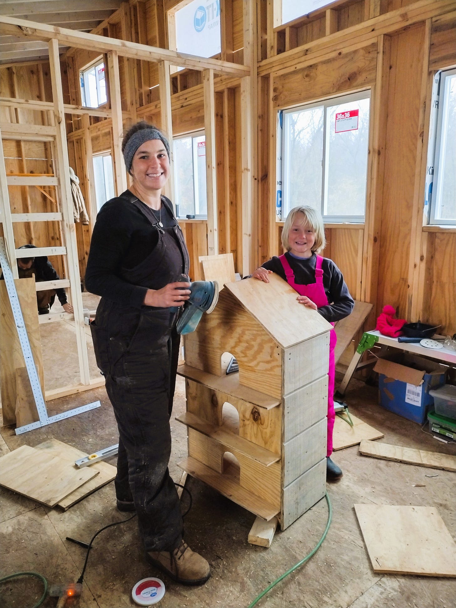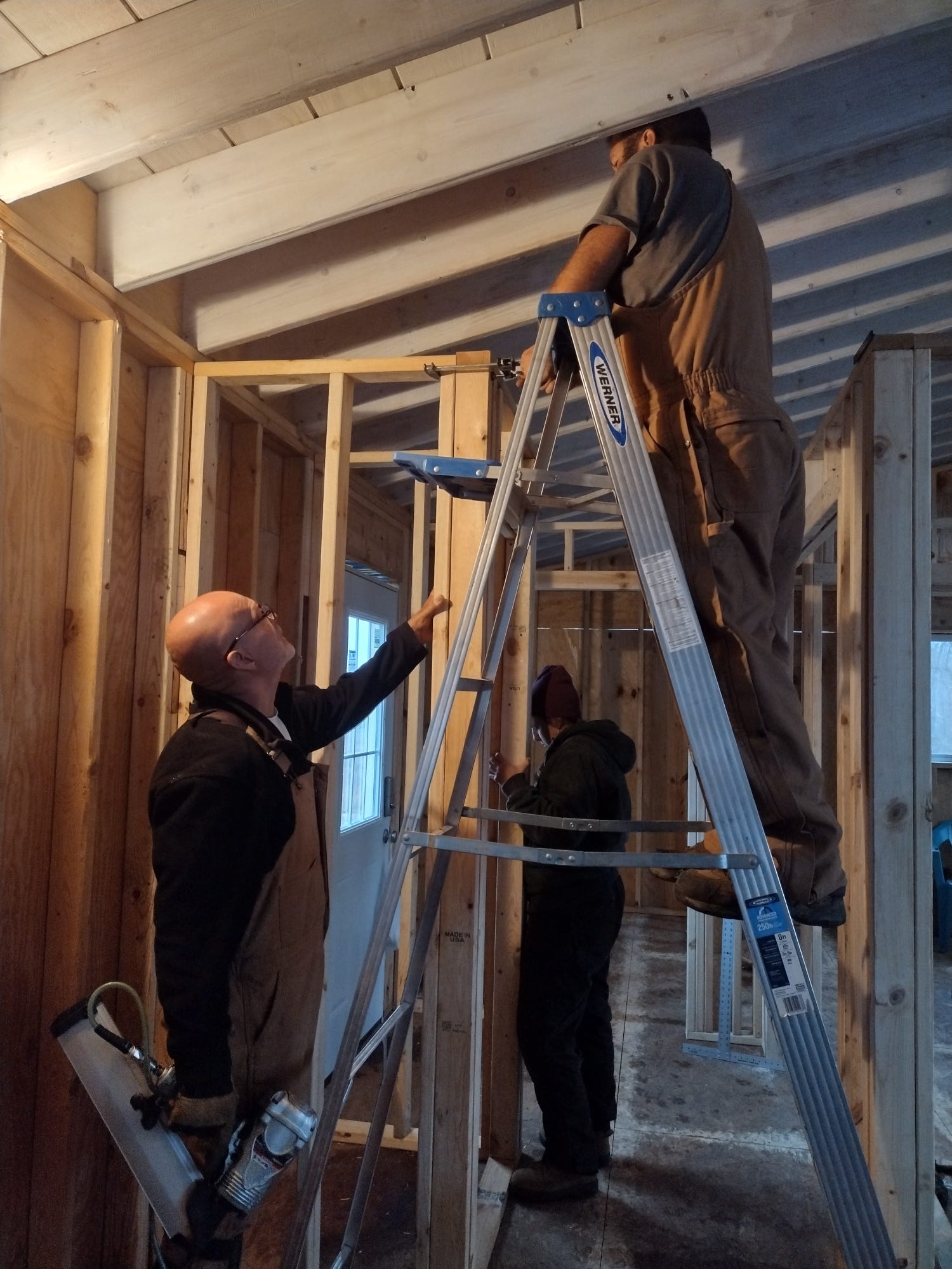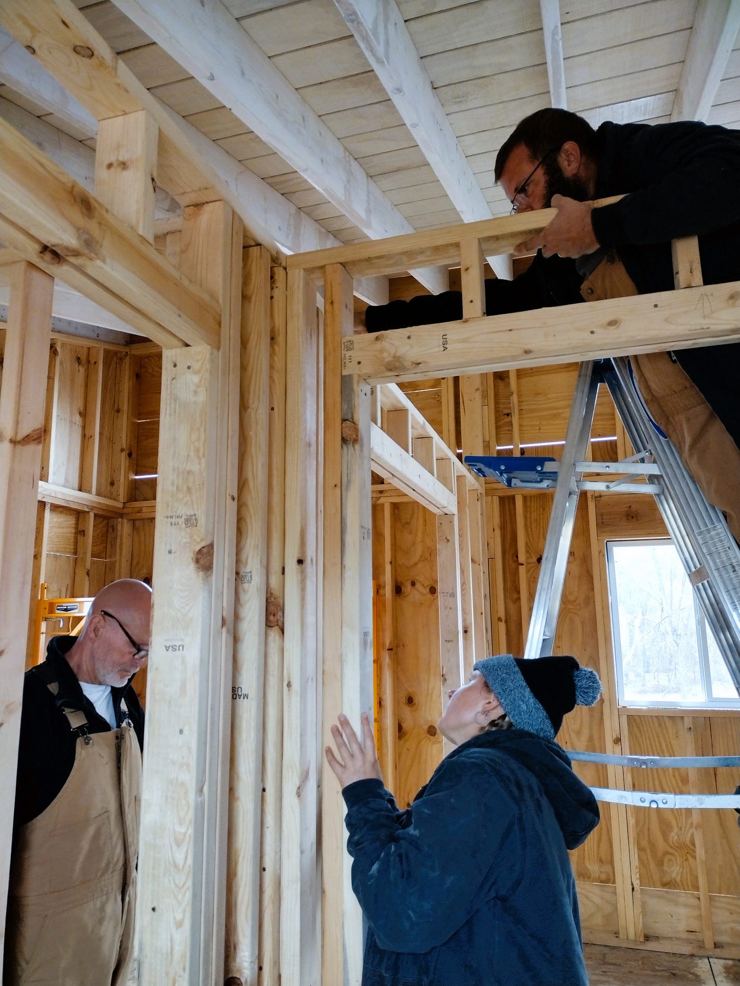 We worked on the house during the first part of the week. It was cold with rain some days, but we stayed warm and mostly dry working inside. We warded off the chill using a propane Big Buddy heater. We put up the rest of our interior walls (the bottom 8-feet of them anyway) and we installed most of our pocket door frames. We still need to finish extending the walls to the vaulted ceiling, but it feels good to see the floor plan in place. Due to the weather, we had Dagger and Tilde in the house with us for several hours most days -- and that kept things interesting, to say the least.