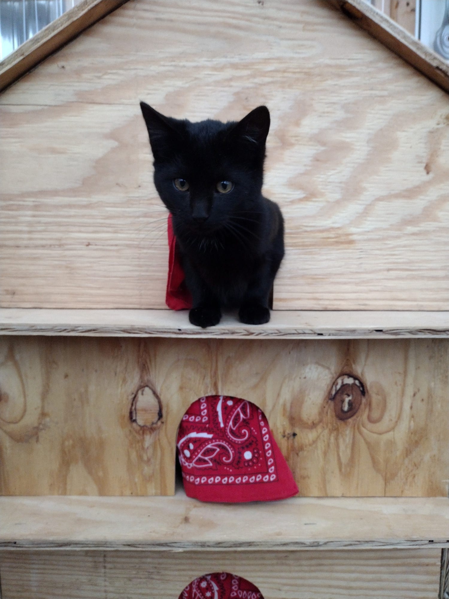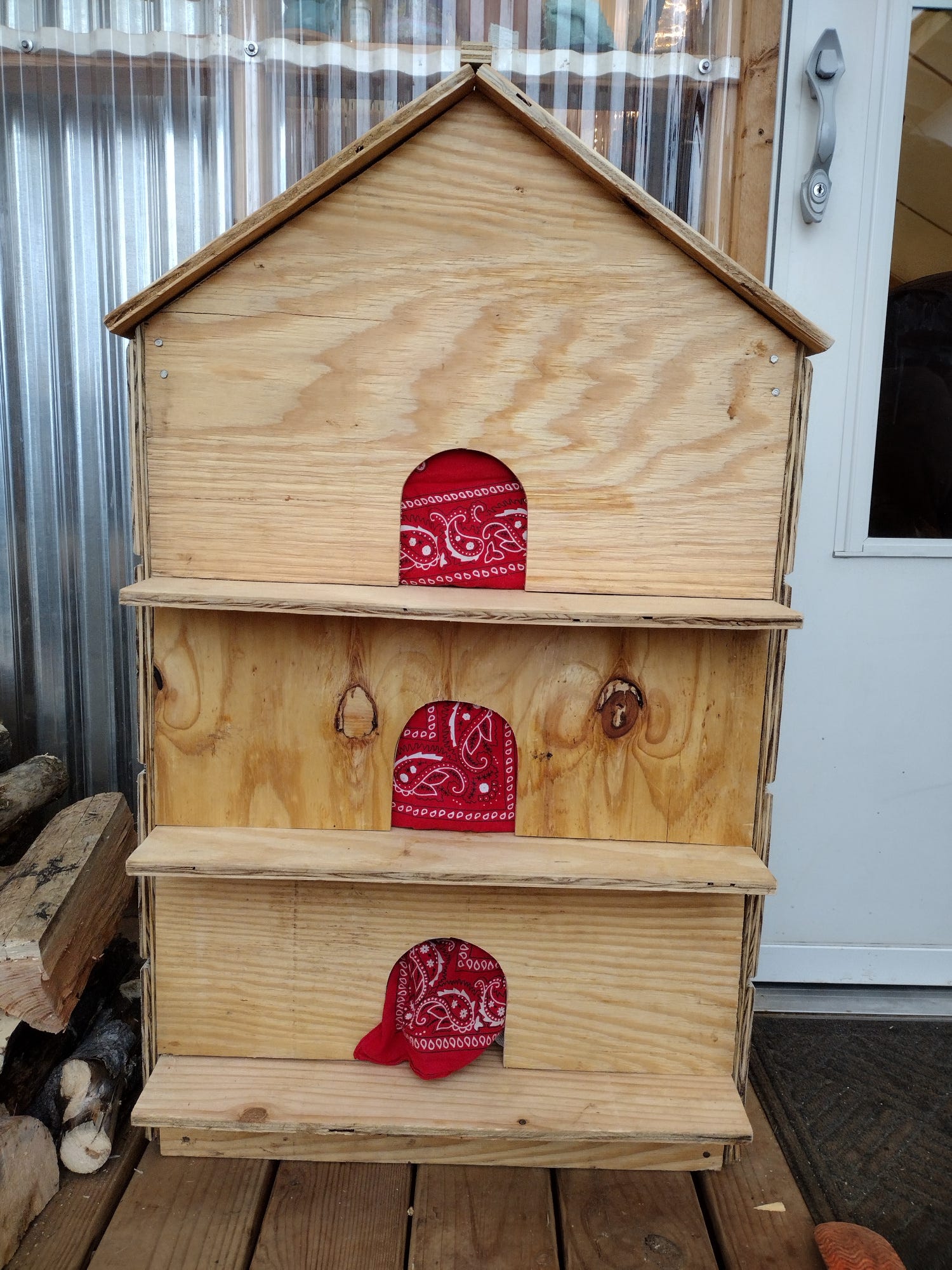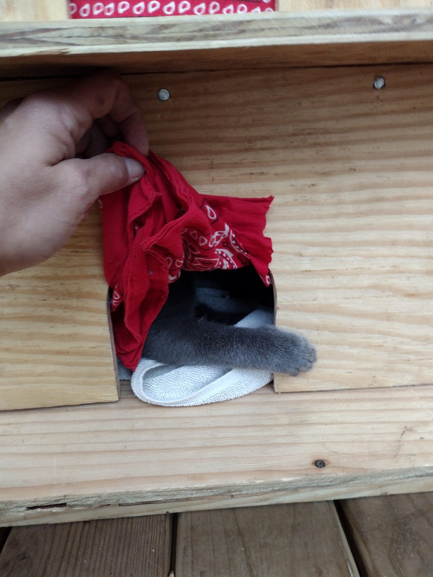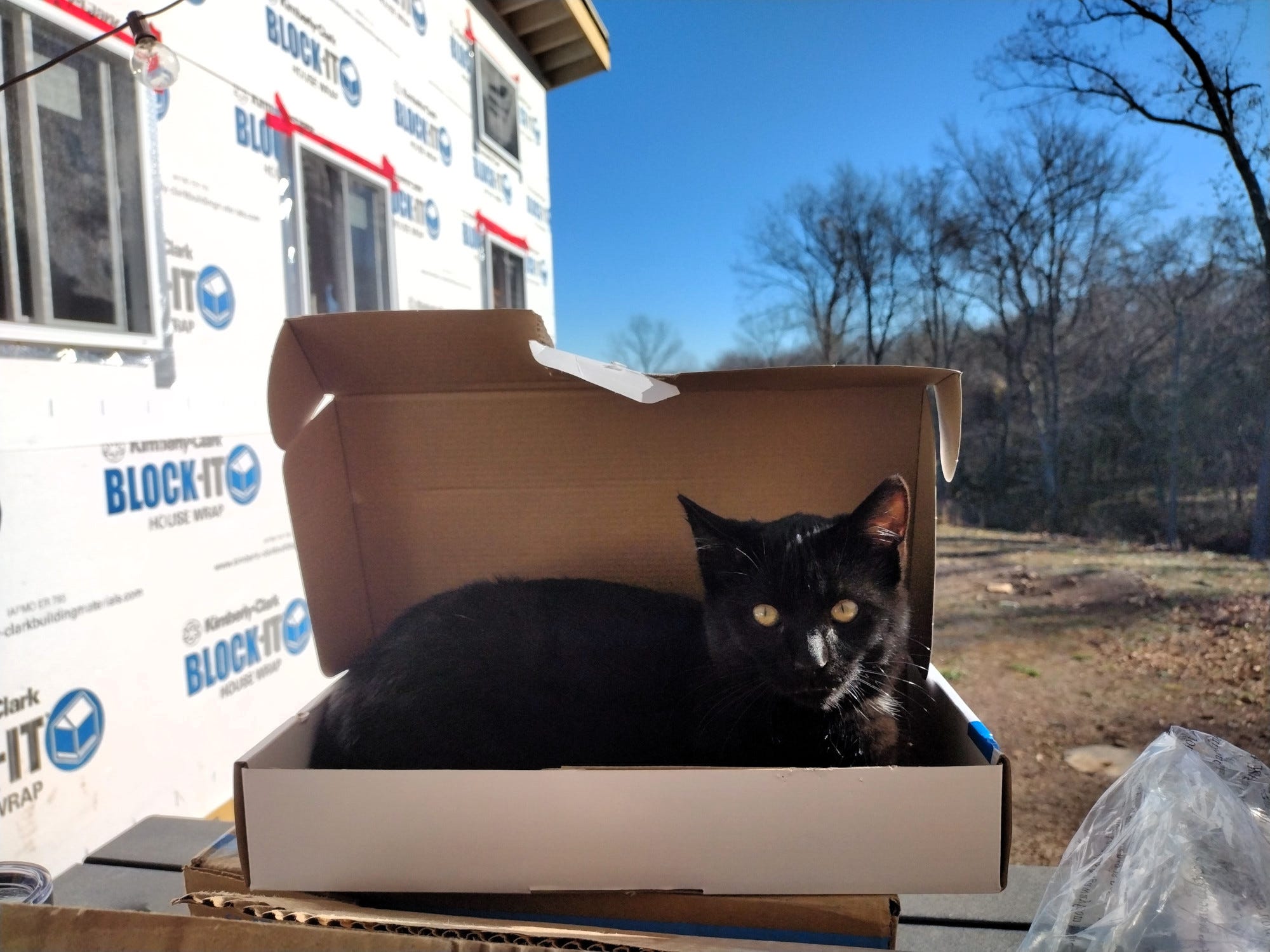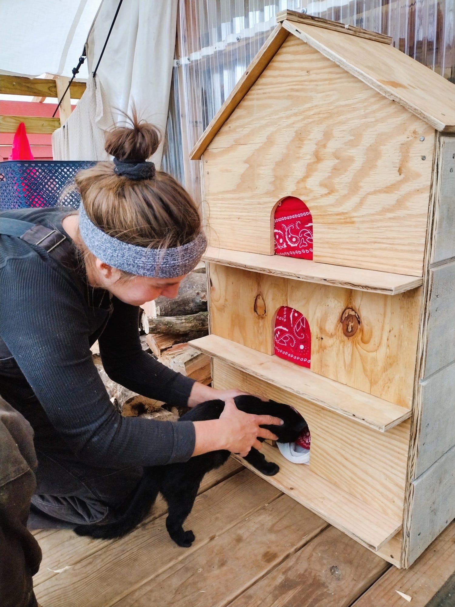 We had tried to encourage the cats to sleep in our rarely-used dog house by boarding up the front except for a tiny cat door. Instead, the cats have continued to sleep on the porch, often in baskets or boxes we have things stored in. We decided they needed a dedicated shelter that we could push up against the tent wall where it could be warm. We had a closed up vent from our air conditioner that we thought we could open up and use to heat the kitty house. Grace started the project one evening and finished it the next day. Gandalf and Arwen took to it immediately, with even skittish Galadriel sleeping there during the night.