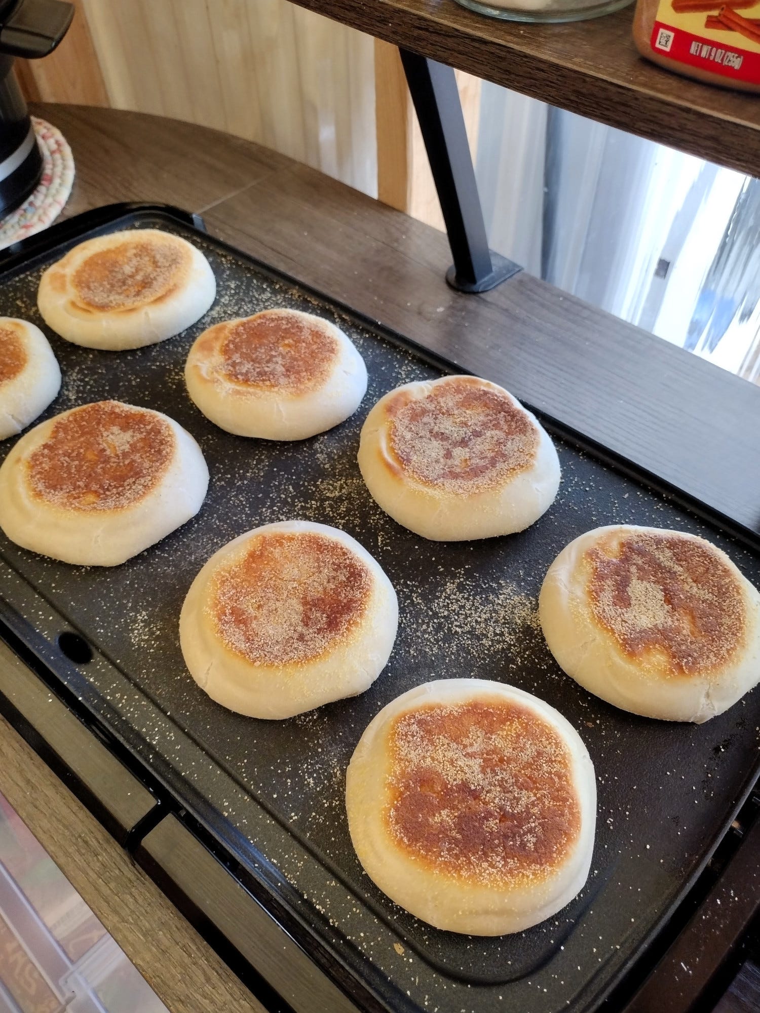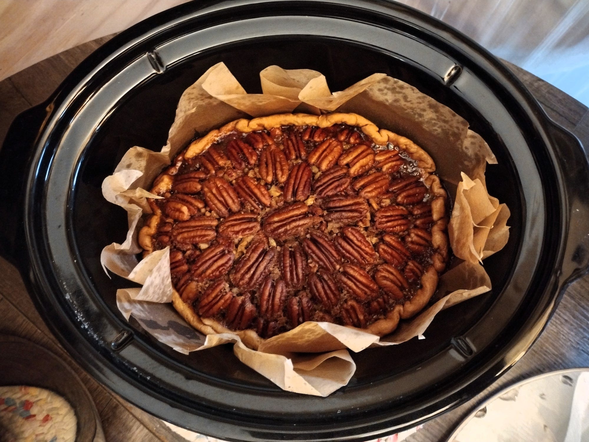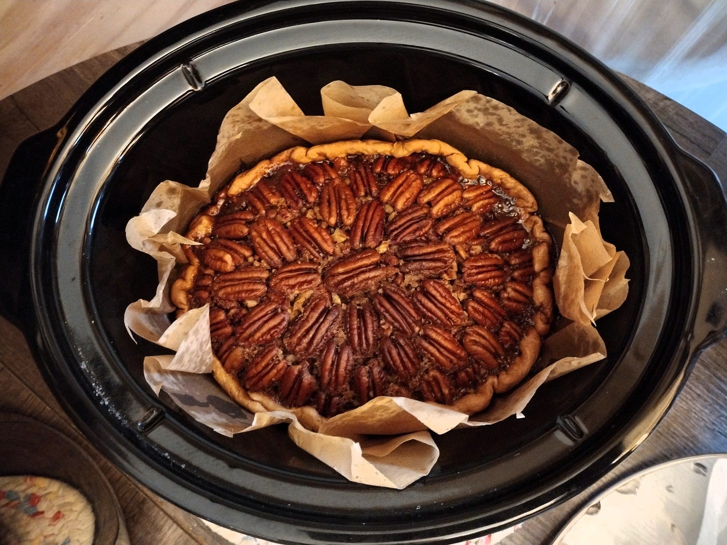 It was our first Thanksgiving without a kitchen. Life has been so crazy, we figured we would enjoy a pared down feast. We headed into the holiday armed with several slow cookers, an Instant Pot, a hot plate, an electric skillet, and an electric griddle -- and we kept our expectations low. Grace, Erin, and I started with making our desserts on Wednesday -- two pecan pies (cooked in a slow cooker) and a pumpkin pudding refrigerator cake. Mom and Bonnie-Jean started some slow-rise English muffin dough that day as well.