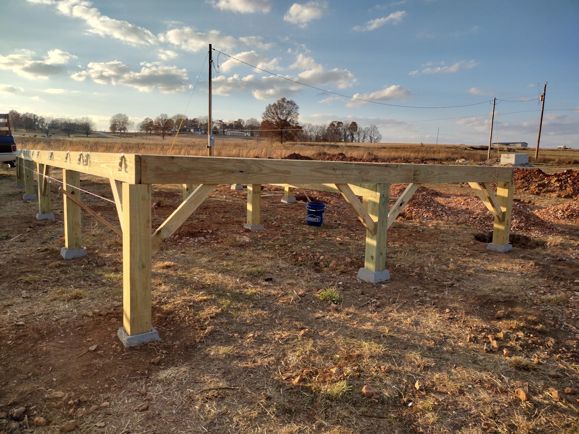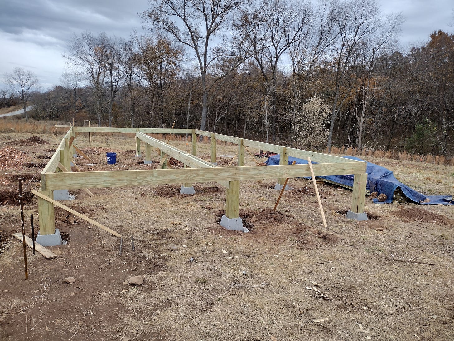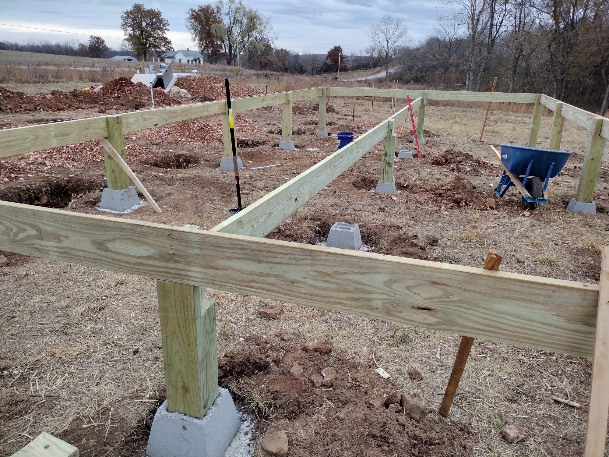 At this point, we wish we would have just buried the posts with concrete. But after lots of struggle and bracing, we have our deck mostly framed. It looks great, and we don't think we will have any more trouble with it.