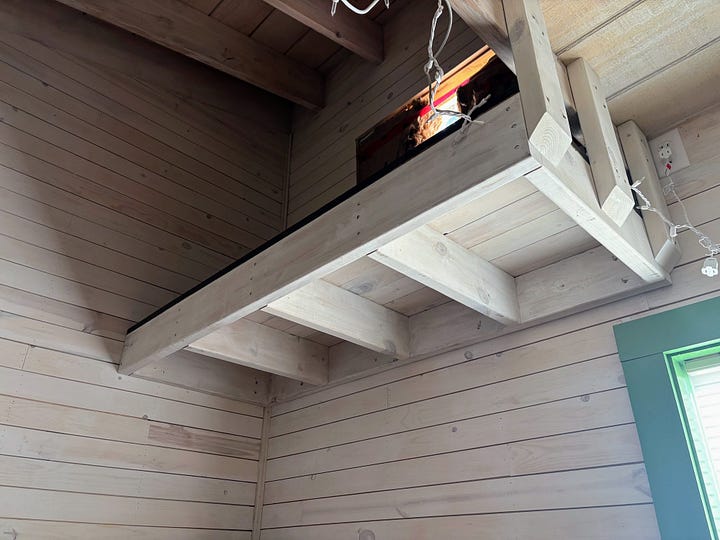 Grace also whitewashed the framing of our small storage loft landing. She stained the boards that will act as flooring to match the floor in the rest of the room. I applied a couple coats of polyurethane to protect the floor portion. We installed the landing on Wednesday. Now, all we need is a ladder. We made this project a priority, as it will make installing our last windows much easier. Because the tent was so close to this end of the bunkhouse, we haven’t been able to install the upper windows until now.