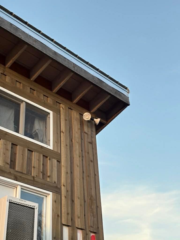 Our dad installed one of the floodlights at the corner of the bunkhouse. It’s fun to see it in place, though it won’t function until the other light is installed.