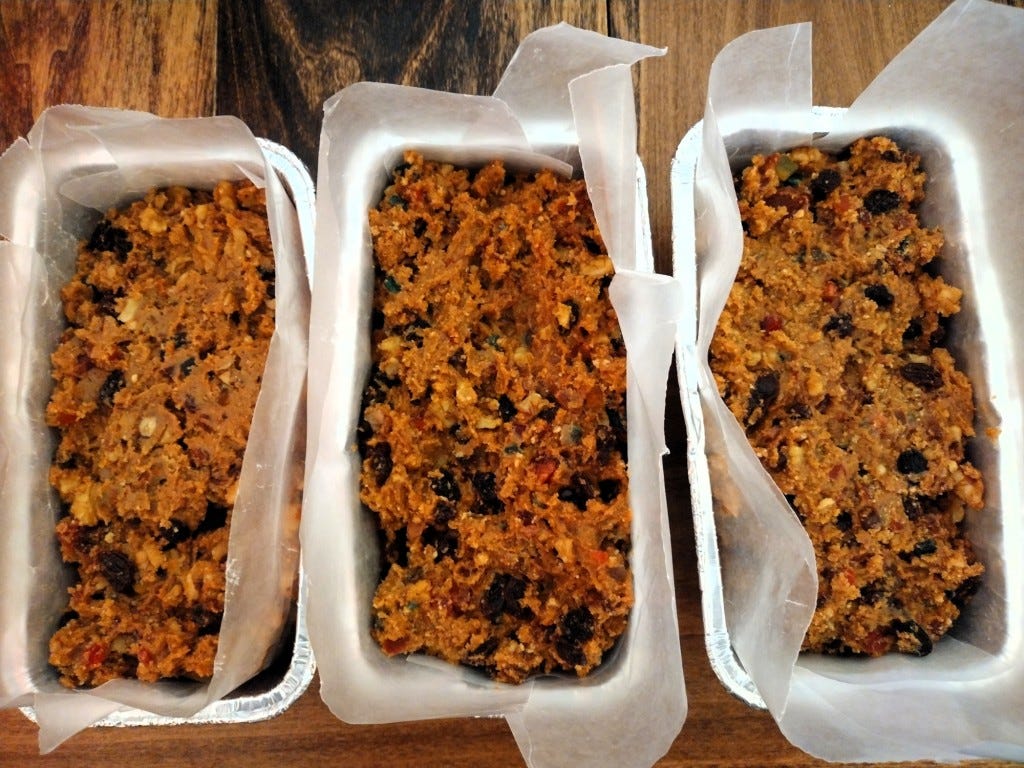 The rest of our free time was directed toward bookwork and holiday organization. On Friday, a few of us picked up a big grocery order for the next couple weeks. When we got home, we did a little holiday cooking -- mixing up a no-bake fruitcake for our Sunday dessert. Instead of our usual recipe, we decided to use our grandma's -- the PET No-Bake Festive Fruitcake, circa 1961. This is the fruitcake my mom grew up with, and she spoke about how her mother would grind all the dry ingredients up in a kitchen grinder before adding the wet ingredients. As she spoke, I could vaguely remember watching the process as a small child. Not having an oven was the perfect excuse to recreate this family favorite.