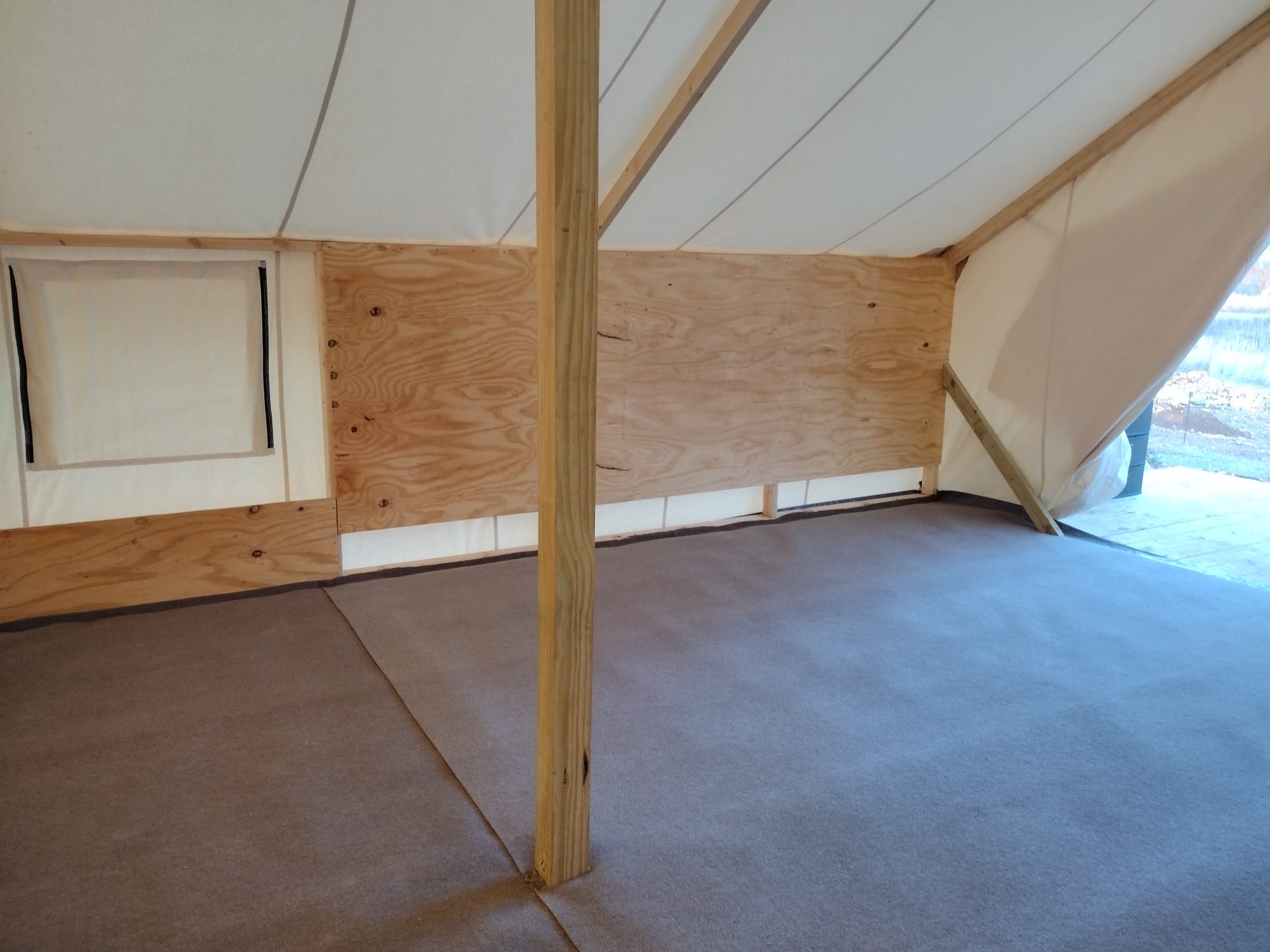 We had some rain this week, so we missed a couple work days on the homestead. We still managed to finish the interior portion of our wall tent frame and put down some carpet inside.