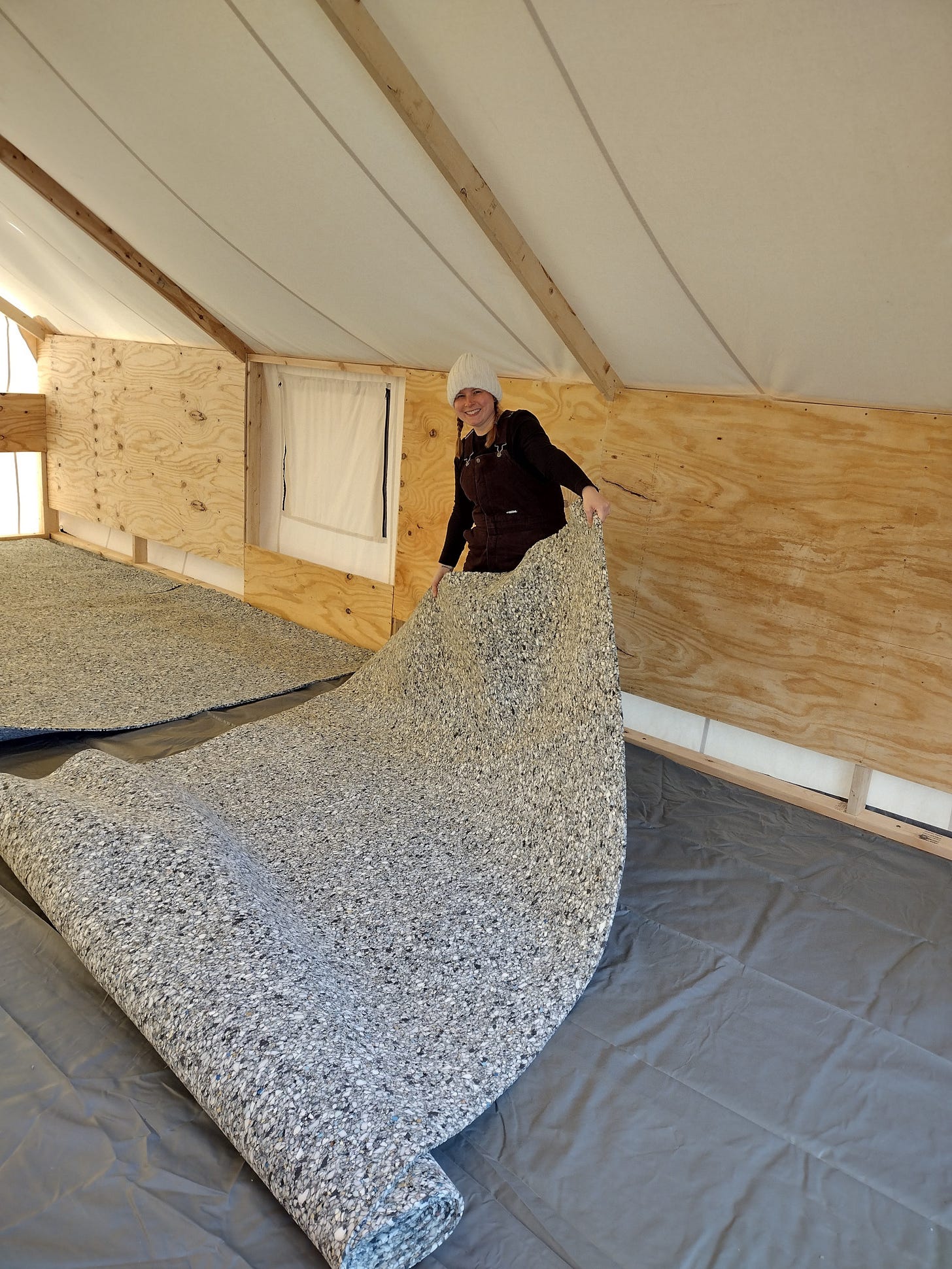 On Thursday, we put down the carpet. I began by mopping the tent several times. It had been quite muddy several of the days we were working on the interior frame. Then, Grace and I laid out the carpet padding.