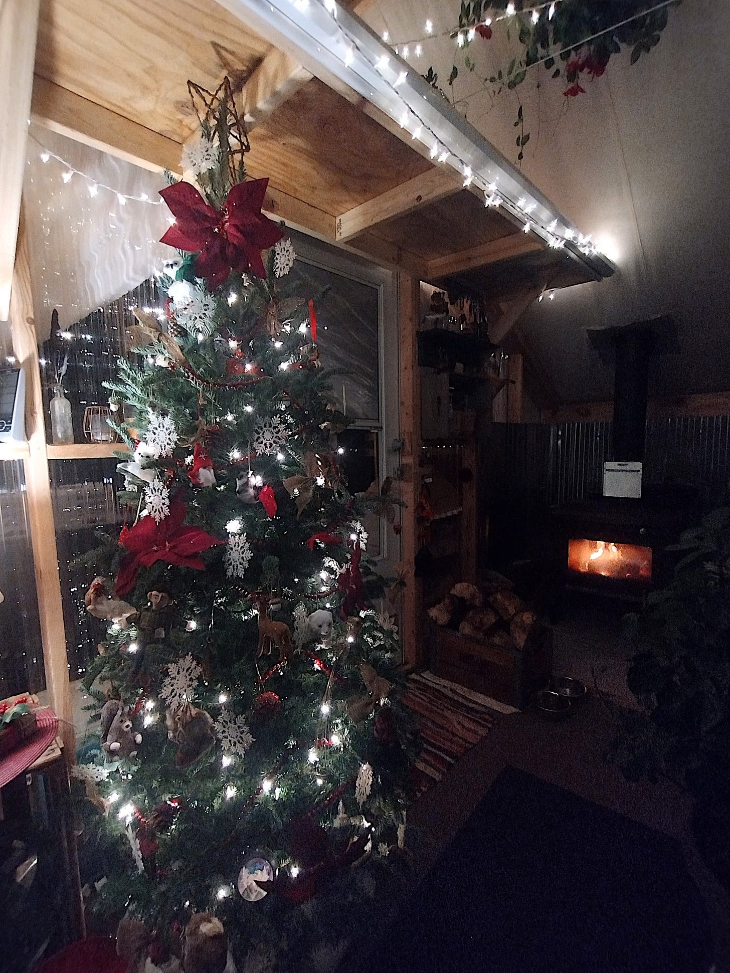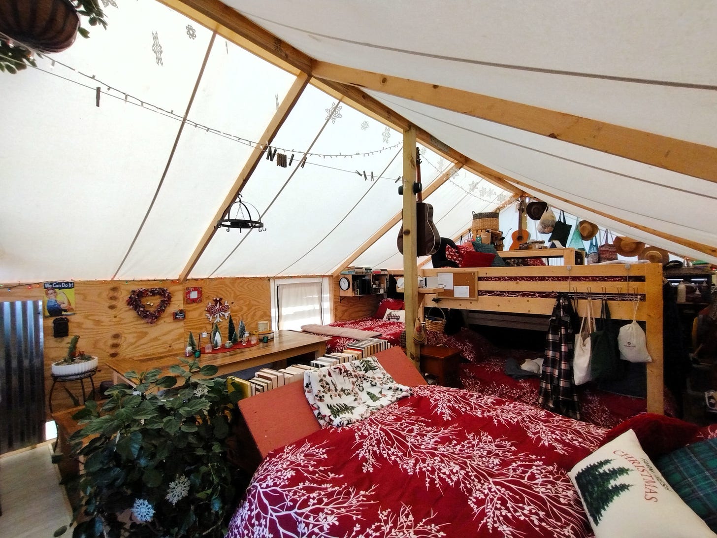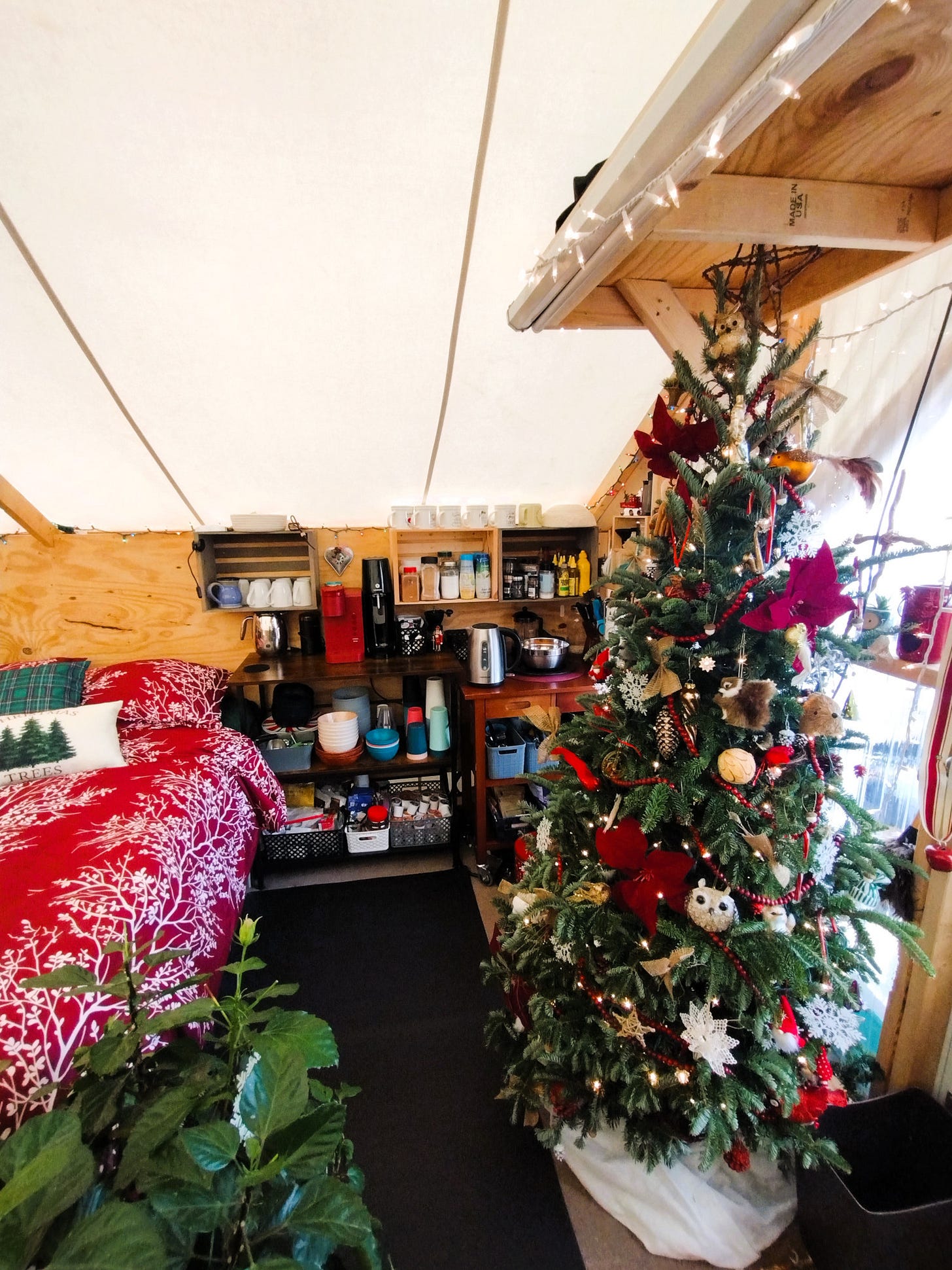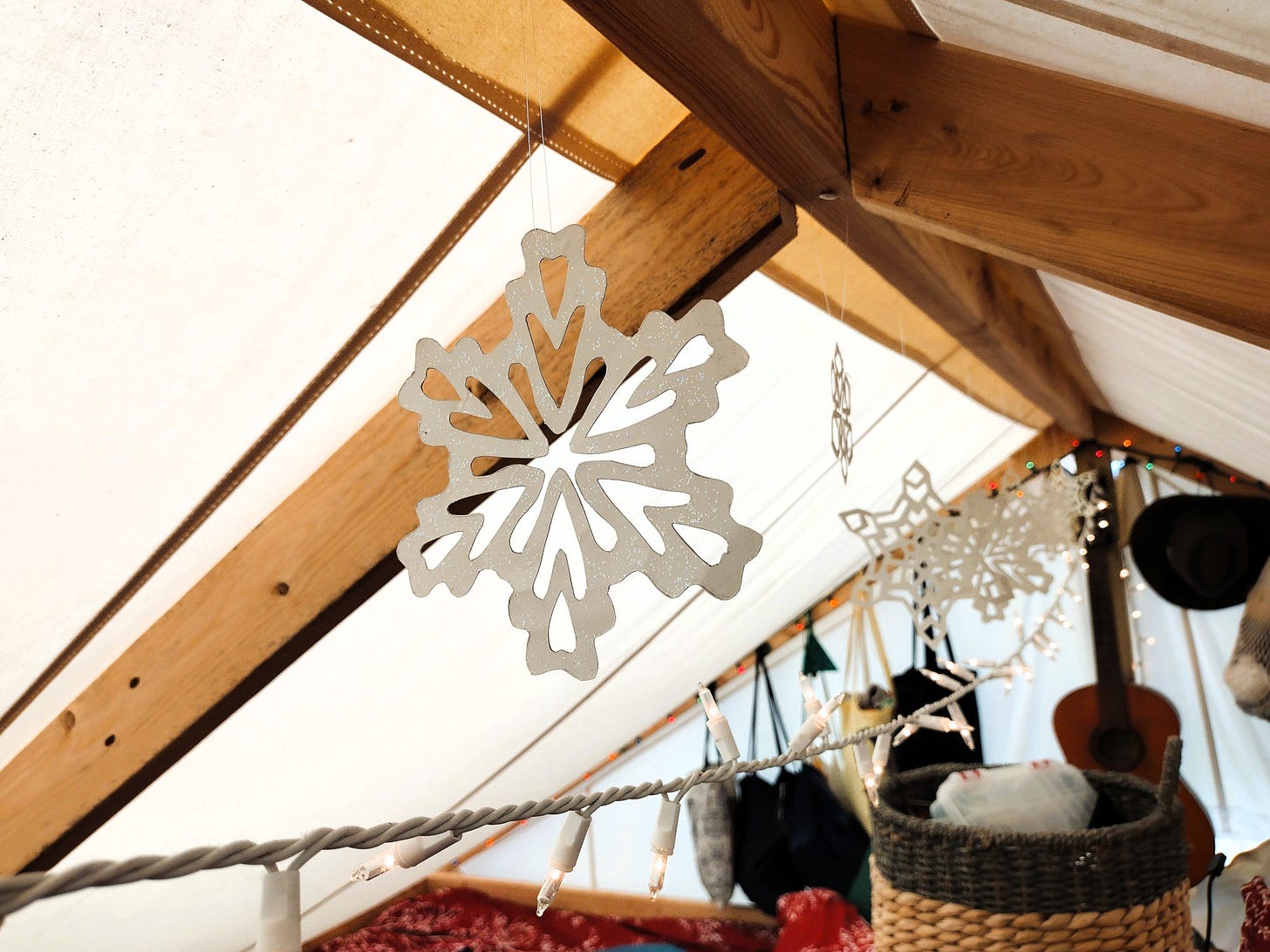 We picked up all of our Christmas decor from our storage unit, and we sorted out a selection we could use to decorate the tent. Grace hung lights, and Bonnie-Jean hung up the cardstock snowflakes I made as a teen. Rainy weather made it all a bit tricky, as we had to have our laundry drying in the tent several days. But we managed, and it turned out so beautifully.