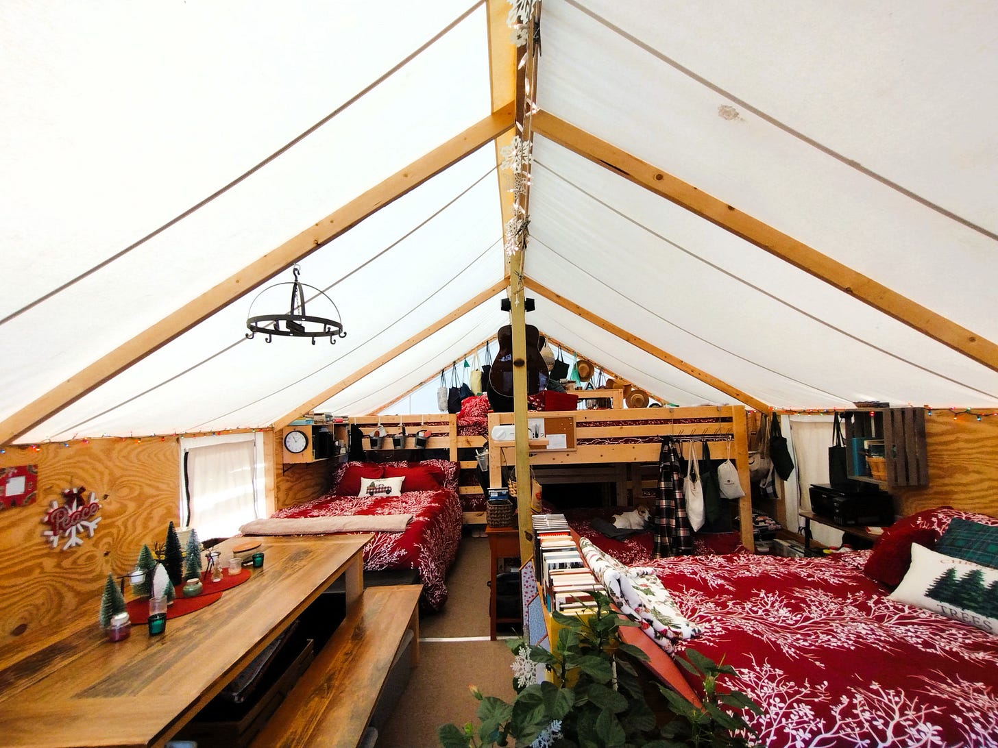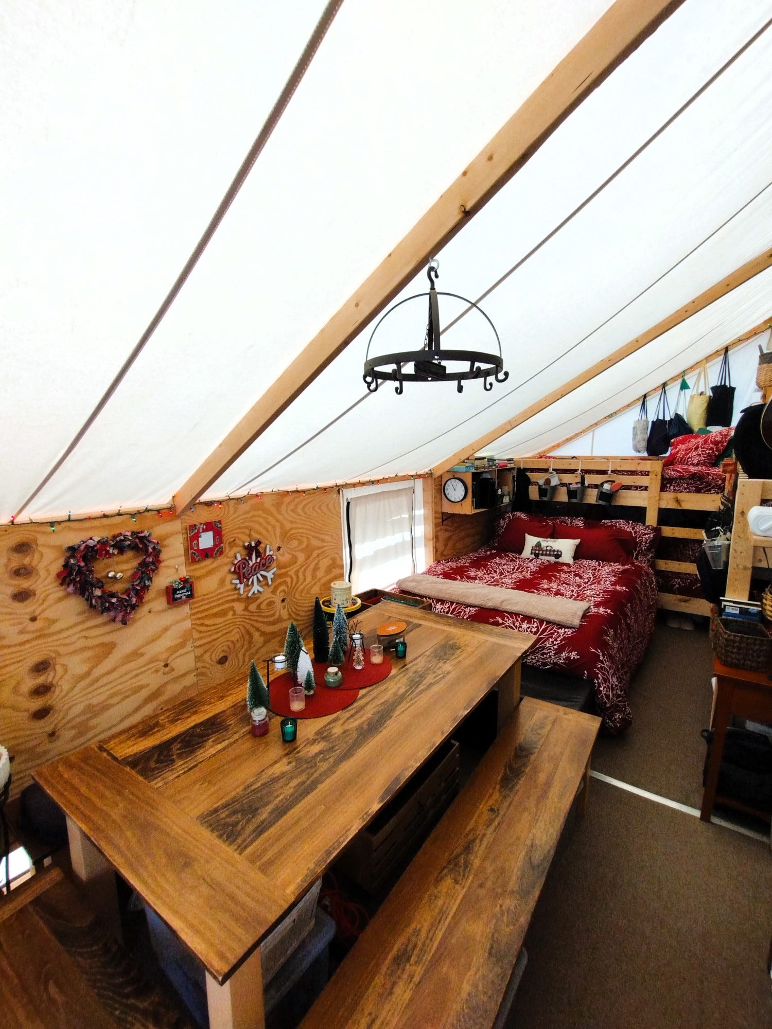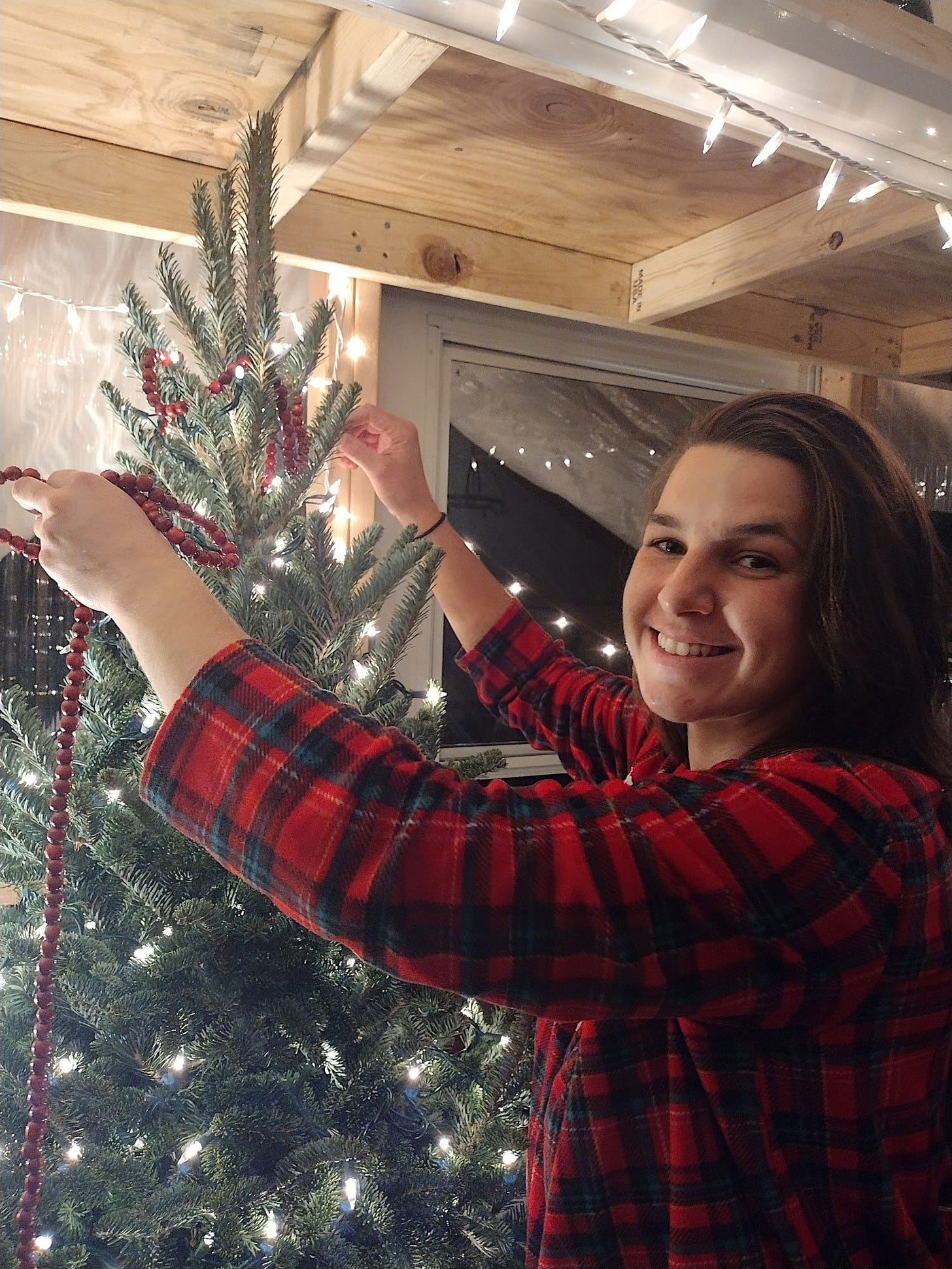 We picked up all of our Christmas decor from our storage unit, and we sorted out a selection we could use to decorate the tent. Grace hung lights, and Bonnie-Jean hung up the cardstock snowflakes I made as a teen. Rainy weather made it all a bit tricky, as we had to have our laundry drying in the tent several days. But we managed, and it turned out so beautifully.