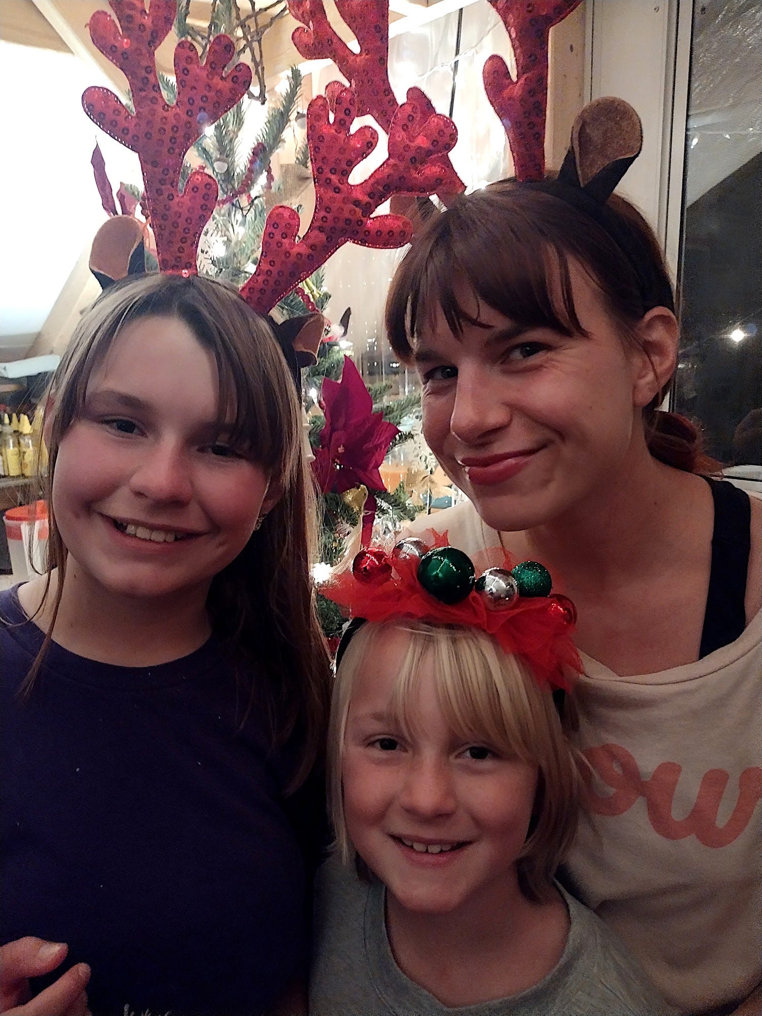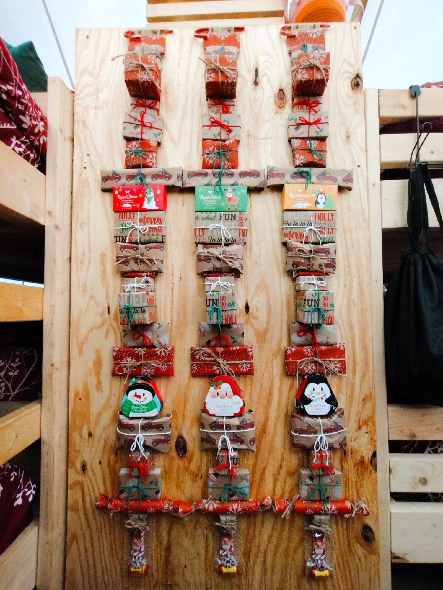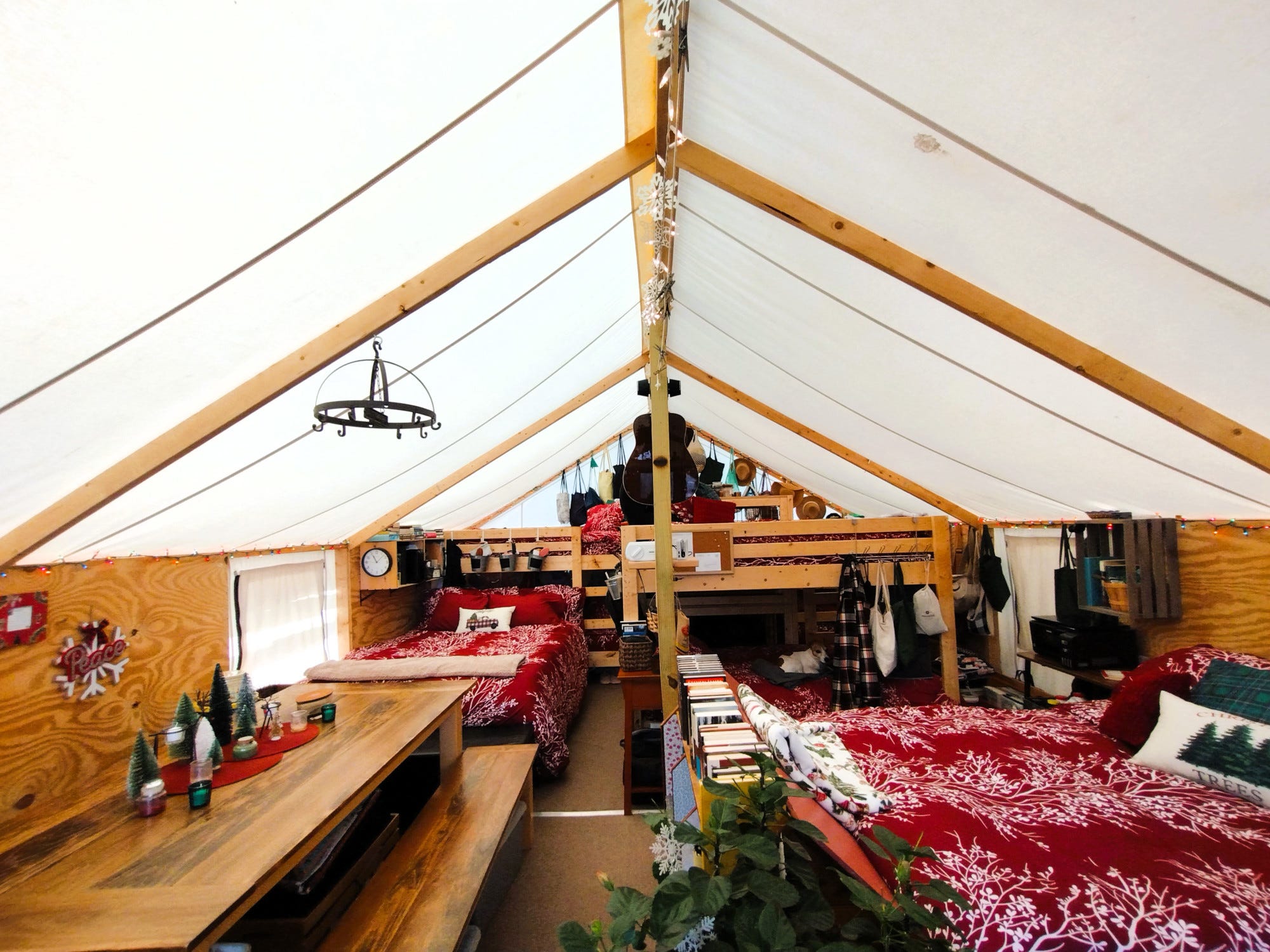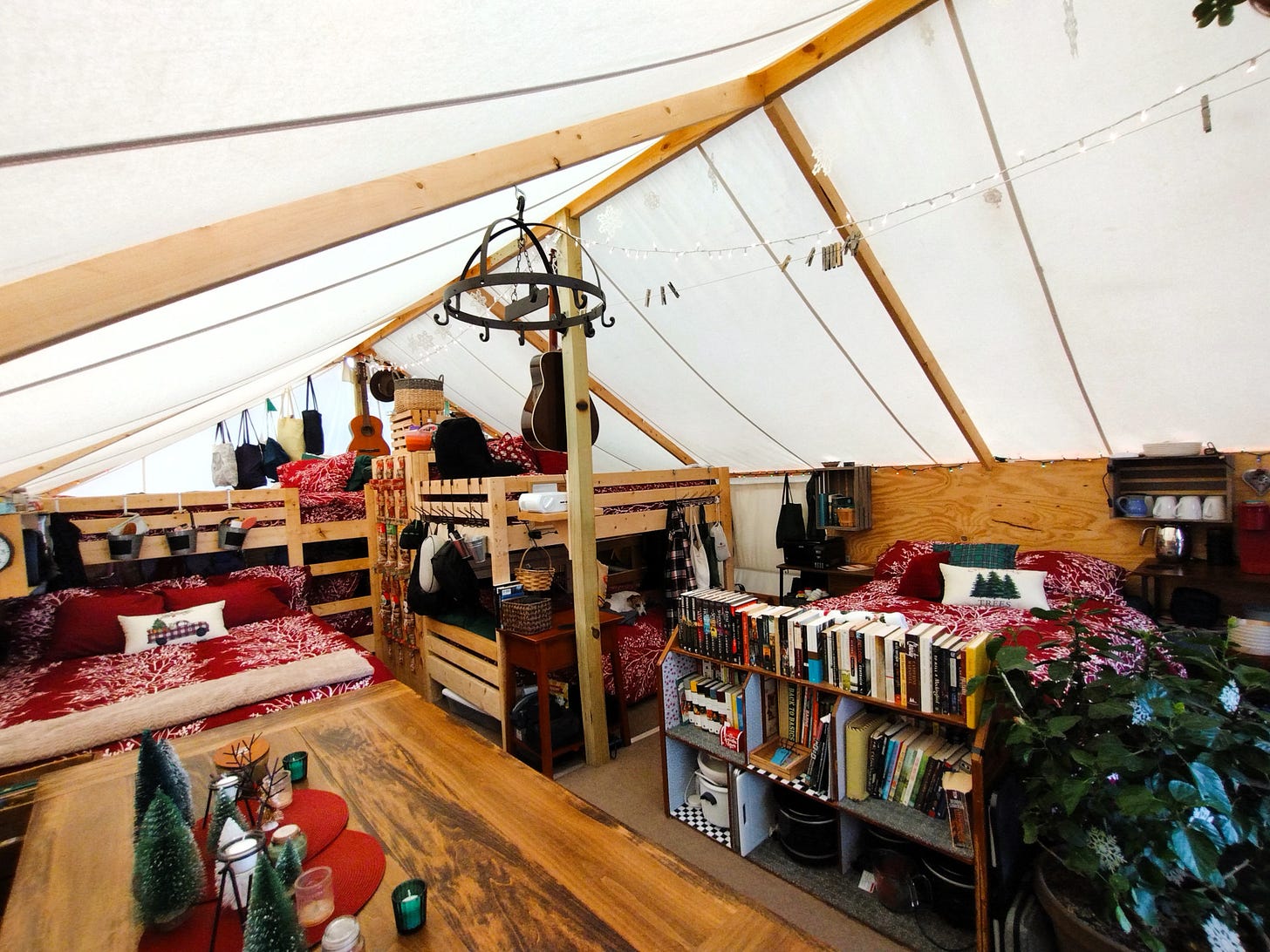 We picked up all of our Christmas decor from our storage unit, and we sorted out a selection we could use to decorate the tent. Grace hung lights, and Bonnie-Jean hung up the cardstock snowflakes I made as a teen. Rainy weather made it all a bit tricky, as we had to have our laundry drying in the tent several days. But we managed, and it turned out so beautifully.